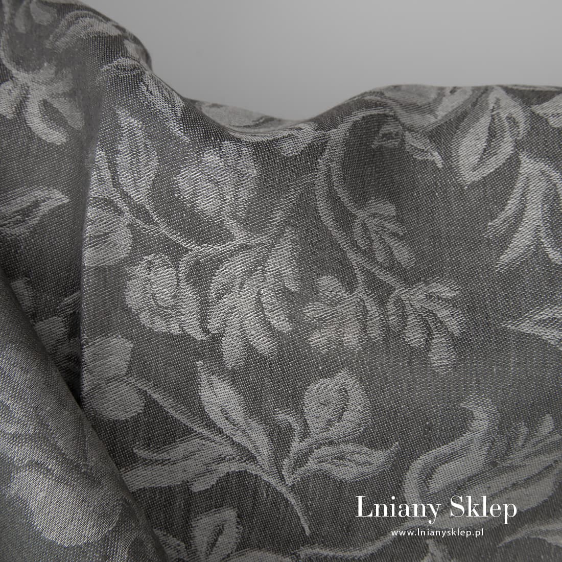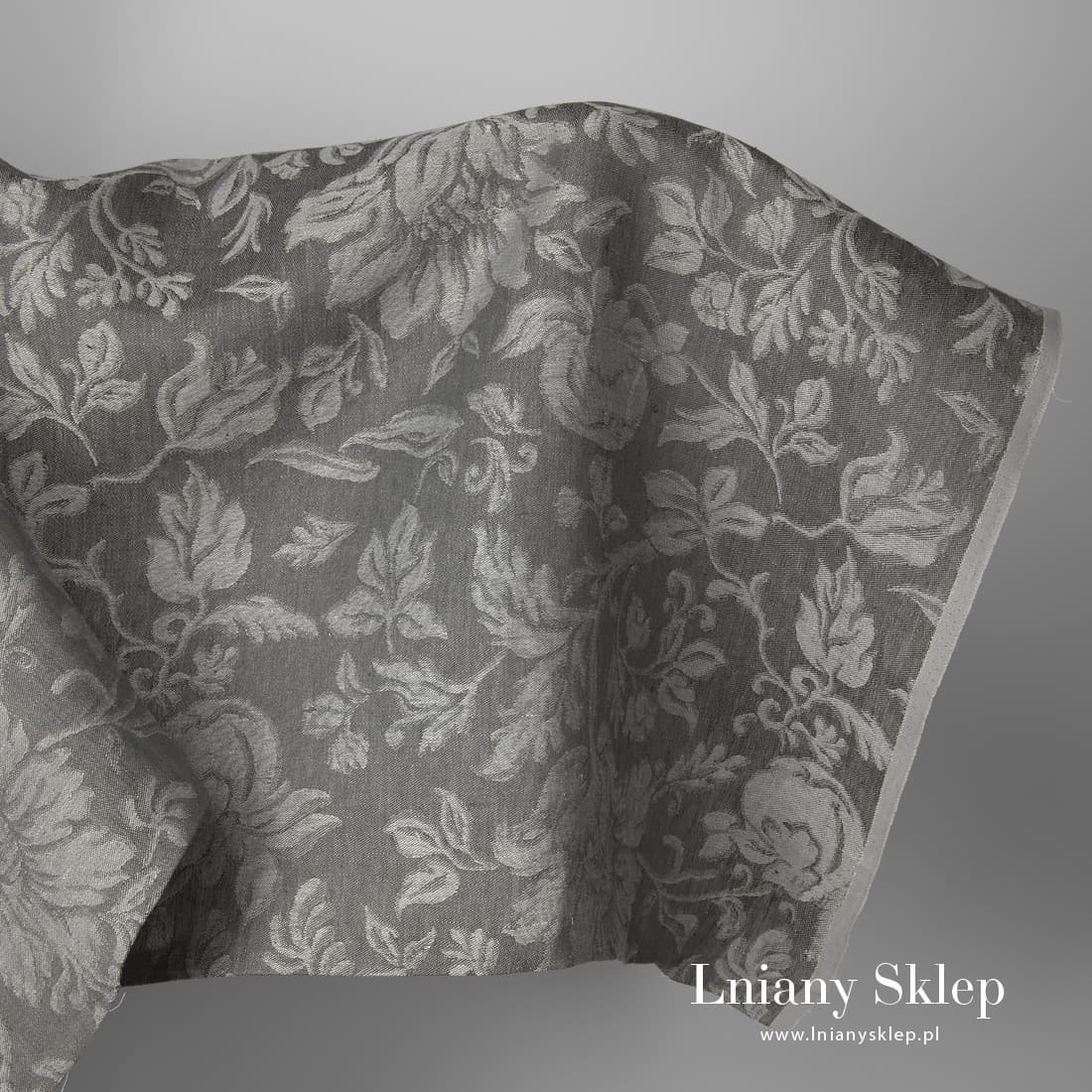 • Szara żakardowa w kwiaty tkanina lniana.