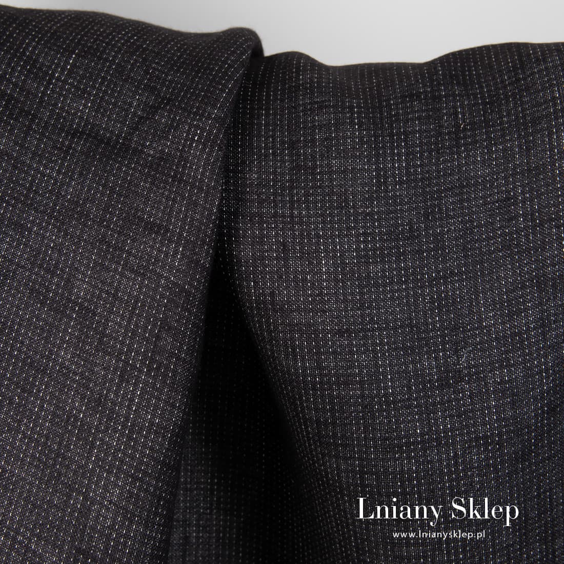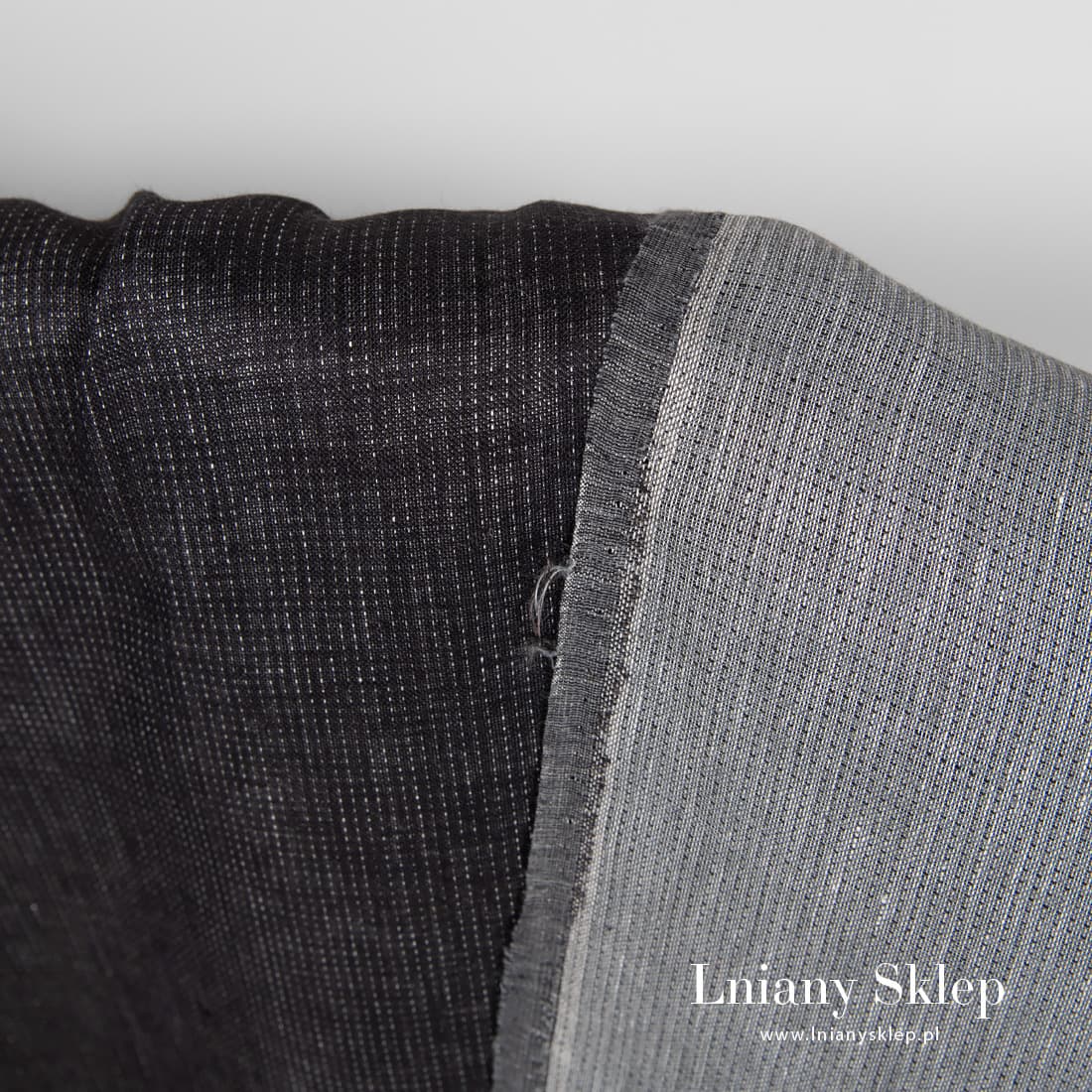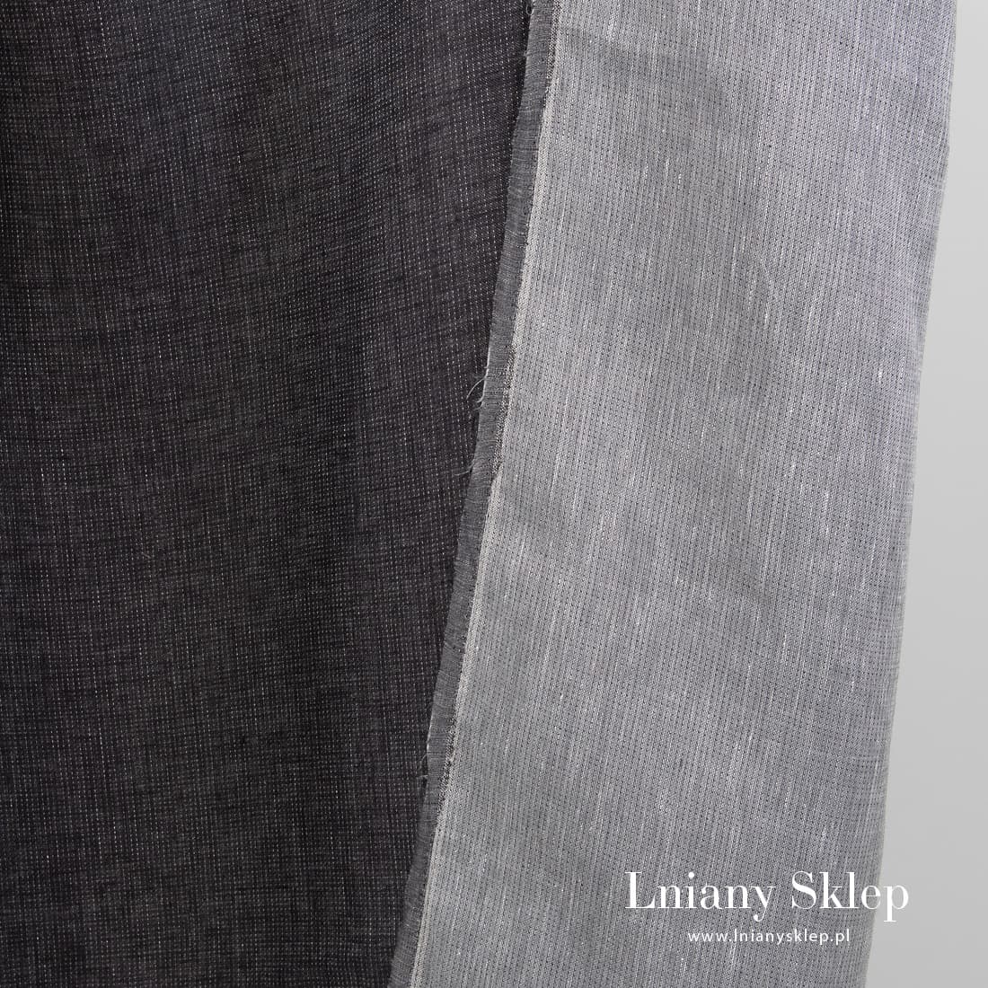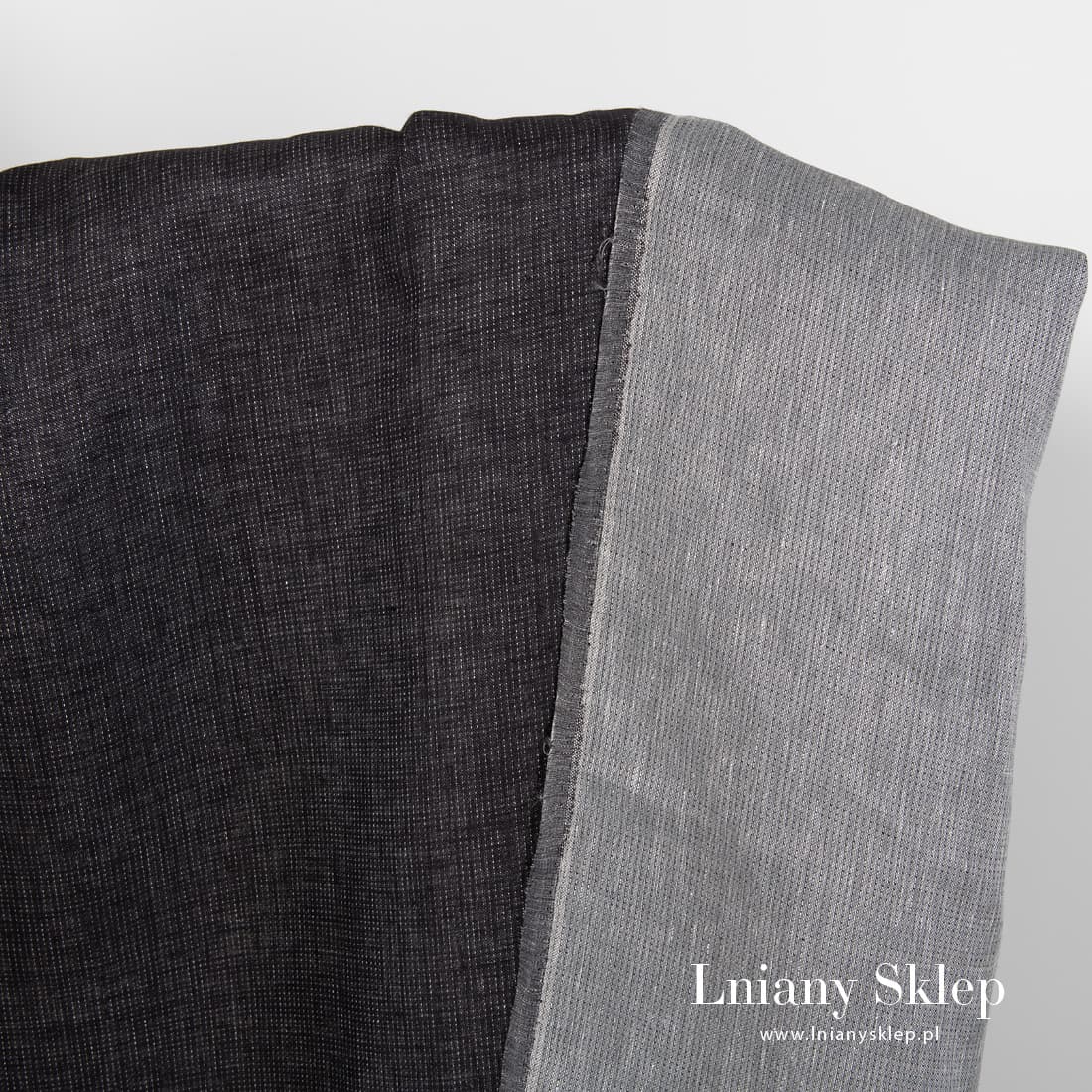 Szary i czarny dwustronny len. Jedna strona szare kropeczki na czarnym tle, druga strona w czarne kropeczki. Wykorzystaj obydwie strony tkaniny. Mocny i gęsty, średnio ciężki, dwuwarstwowy len 100% na odzież i tekstylia domowe.