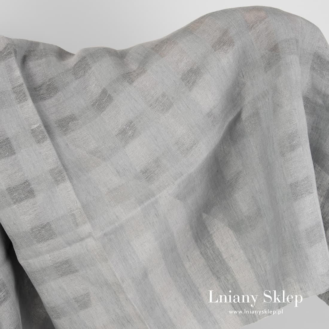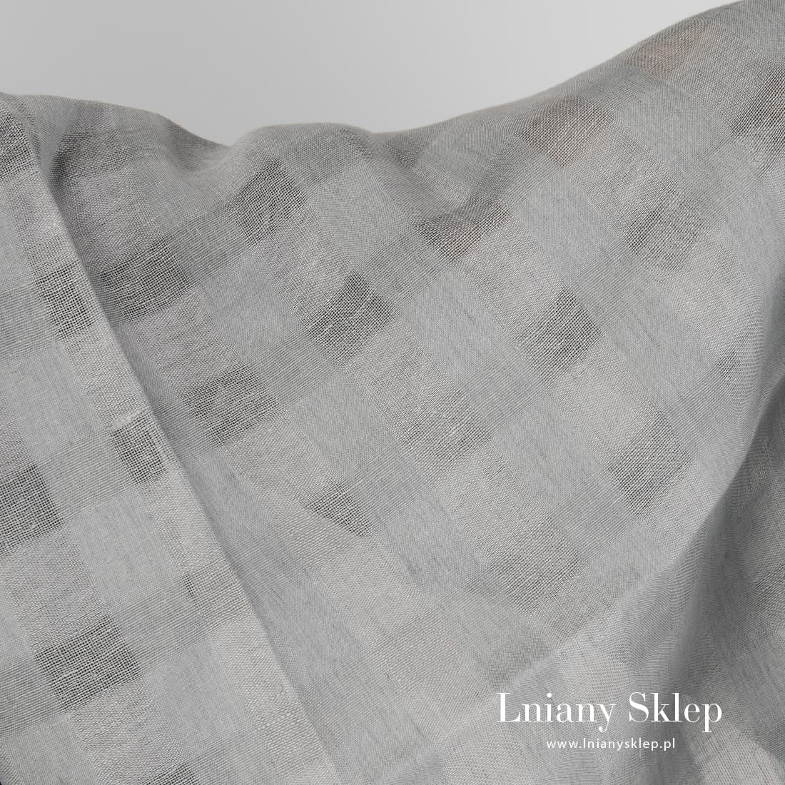 Szary len w przeźroczystą kratkę. Tkanina wytkana w przecinające się pasy o różnej gęstości. Wykorzystaliśmy dwie przędze o różnych odcieniach szarości wpadającej w błękit. Len 100% na firanki, szaliczki i chusty.