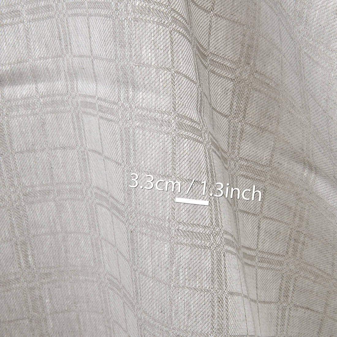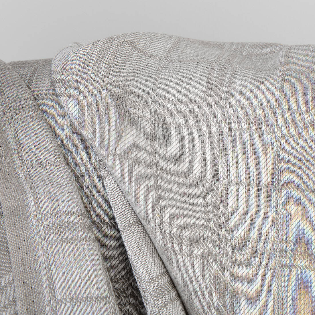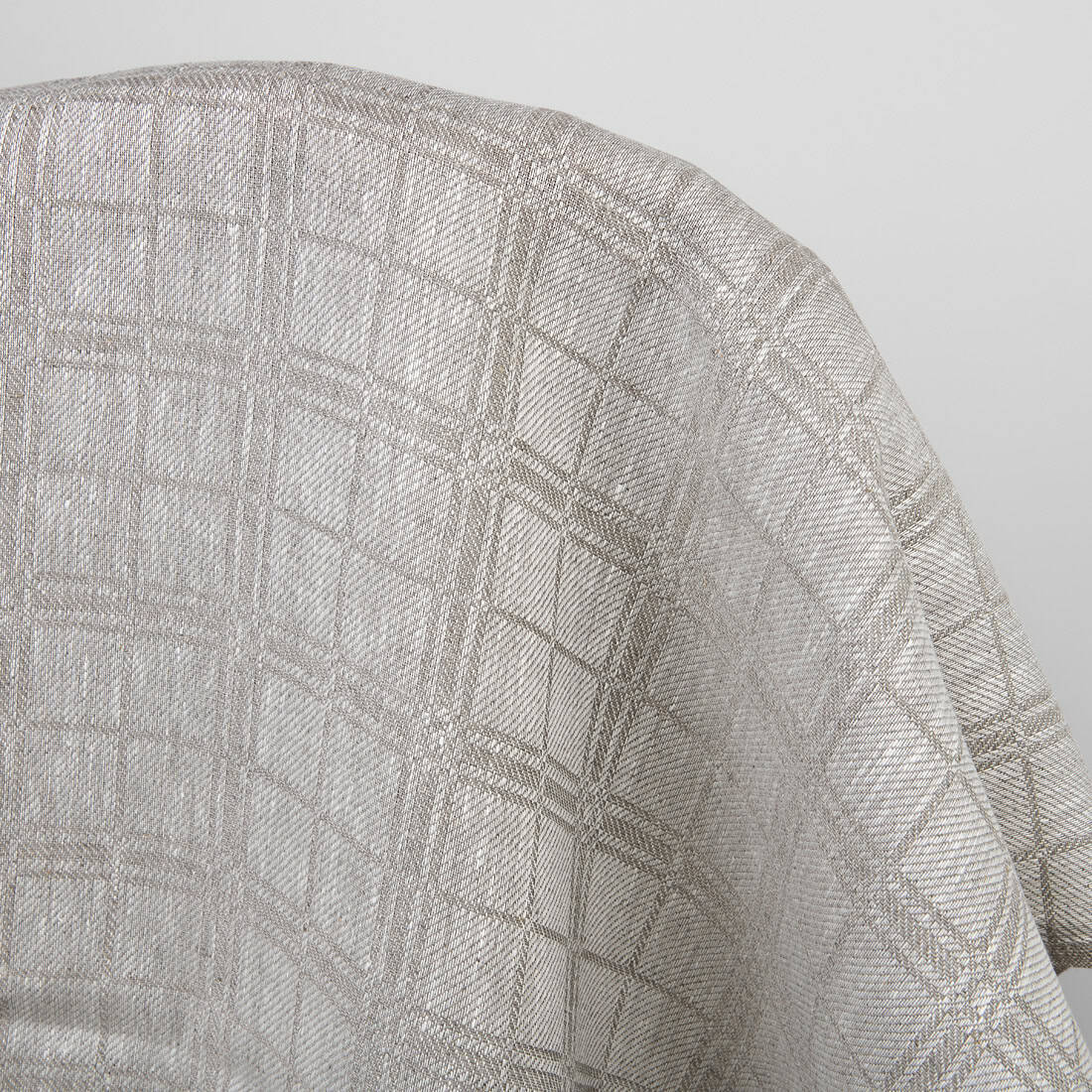 Naturalna tkanina lniana w klasyczny szary wzór geometryczny. Gęsta, mocna, jakościowa i wytrzymała tkanina lniana odpowiednia na szycie konfekcji stołowej i kuchennej i najróżniejszych akcesoriów.