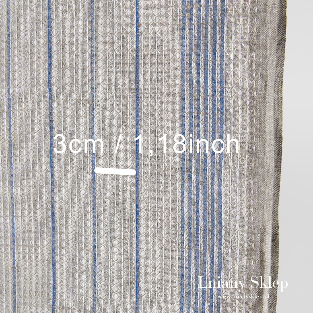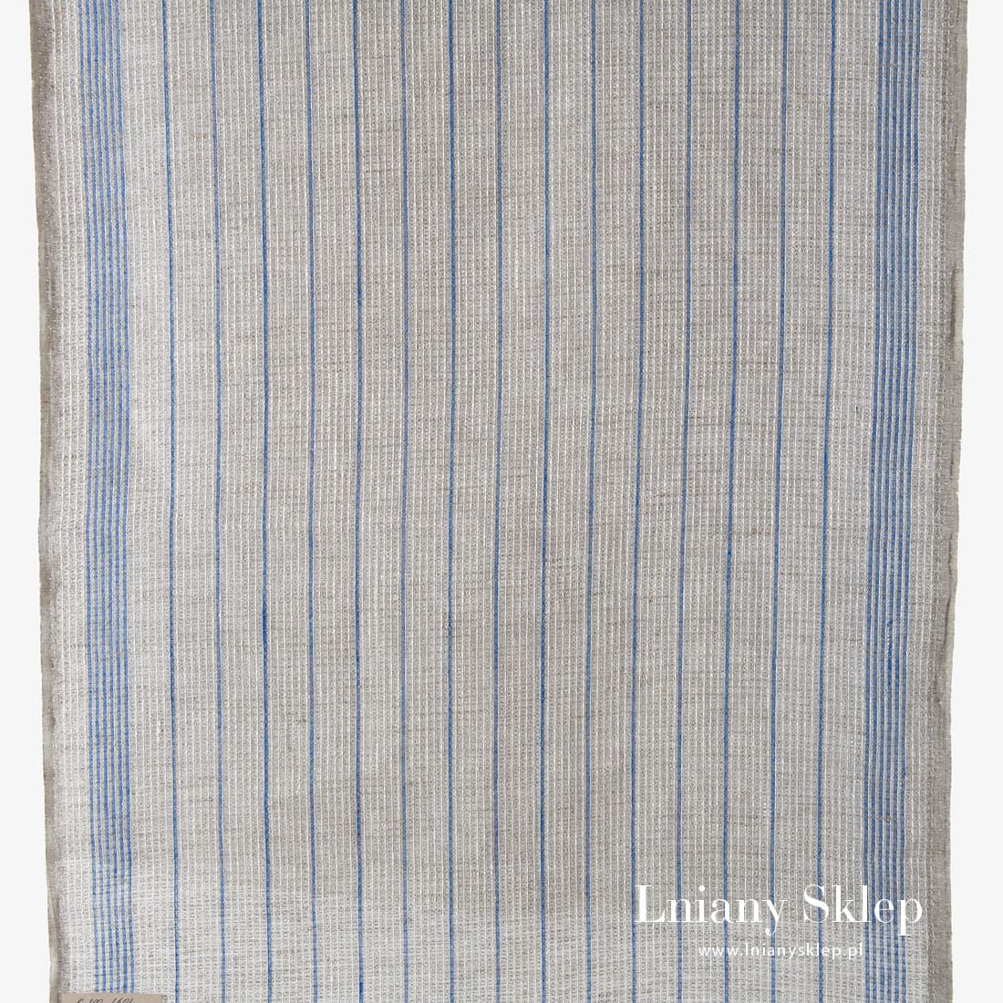 Szary waflowy len ścierkowy w niebieskie paski. Tło wytkane zostało melanżowo z przędzy białej i niebarwionej szarej (lekko piaskowej). Mocna, gęsta, szeroka 60cm tkanina – idealna na ścierki kuchenne.