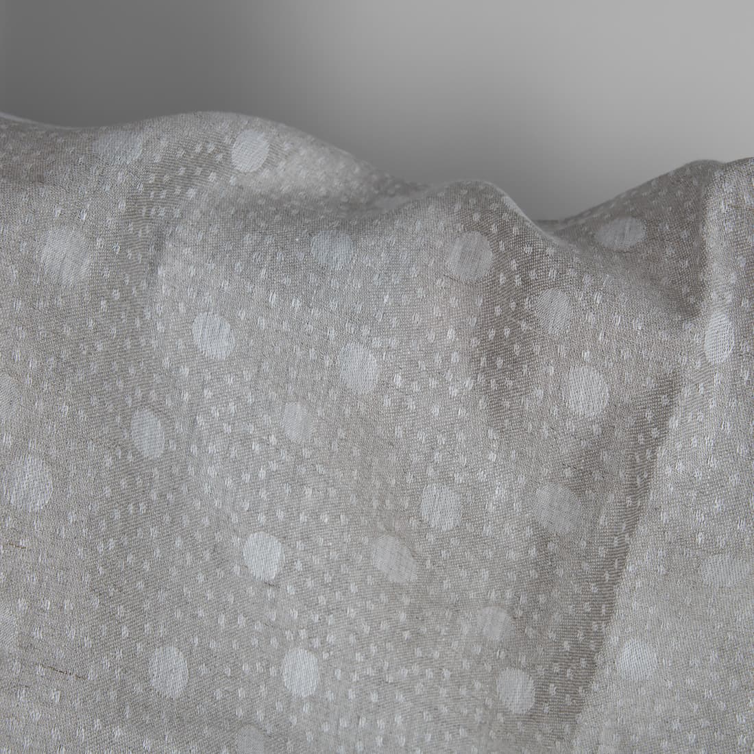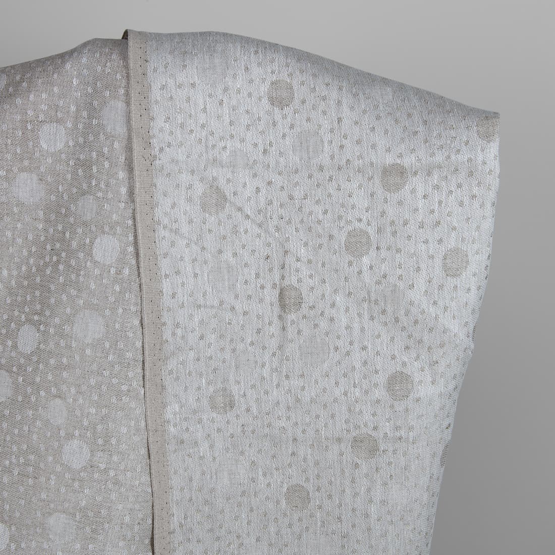 Średnio ciężki, wytrzymały, szary len wytkany w żakardowy wesoły rzucik w ciapki. Do wytkania tej tkaniny użyto dwóch przędz: białej i szarej - o barwie naturalnego lnu. Obie strony tkaniny są piękne: jedna - szara wytkana w białe ciapki, inna - biała wytkana w szare ciapki.