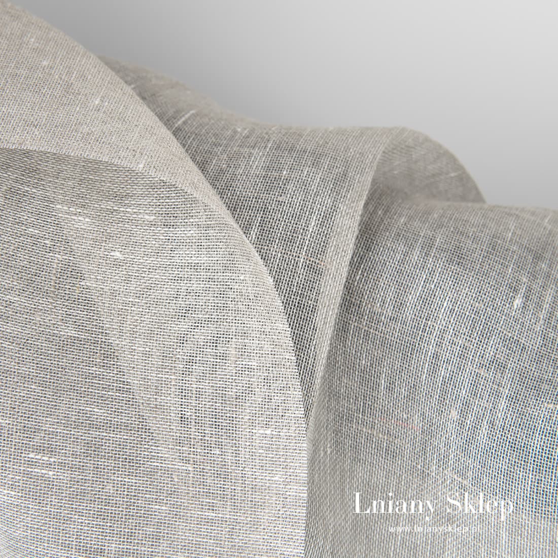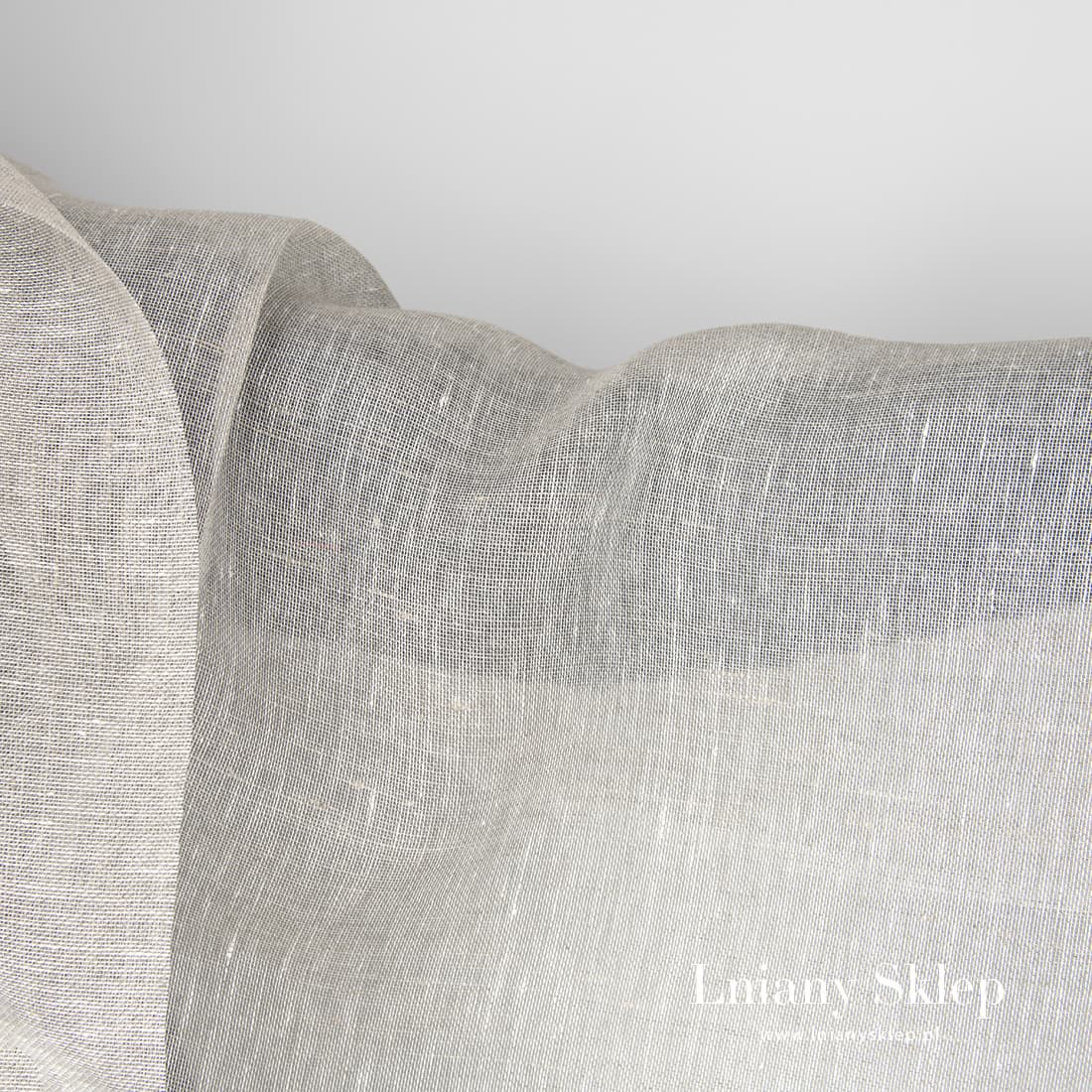 Przeźroczysta melanżowa tkanina lniana wytkana w splot płócienny z przędzy o barwie śnieżnobiałej (optyczna biel) i jasnoszarej. Bardzo lekka, cieniutka, rzadko tkana, przeźroczysta tkanina lniana świetnie się sprawdzi jako tkanina na szycie firanek, szaliczków i różnych akcesoriów.