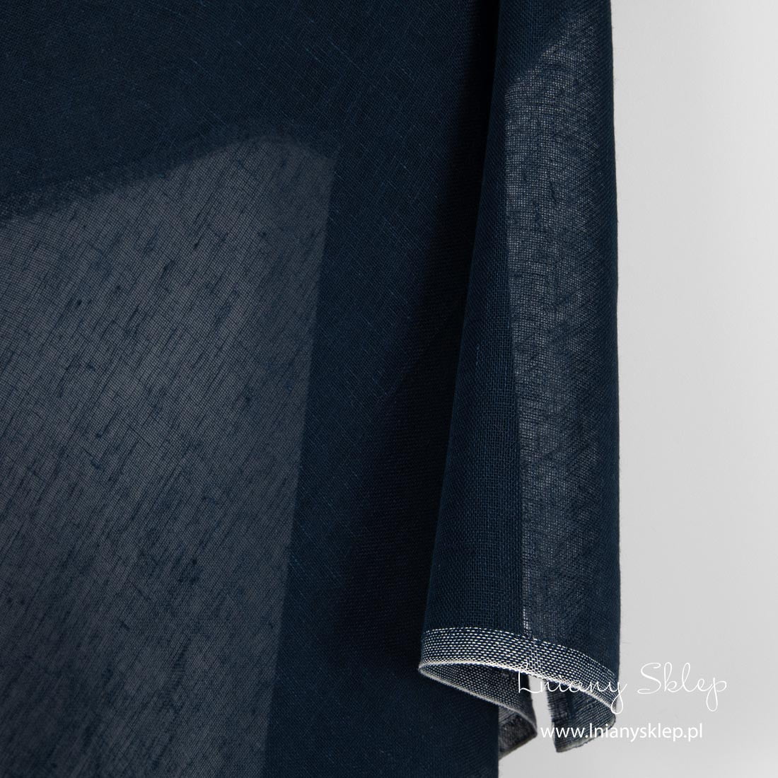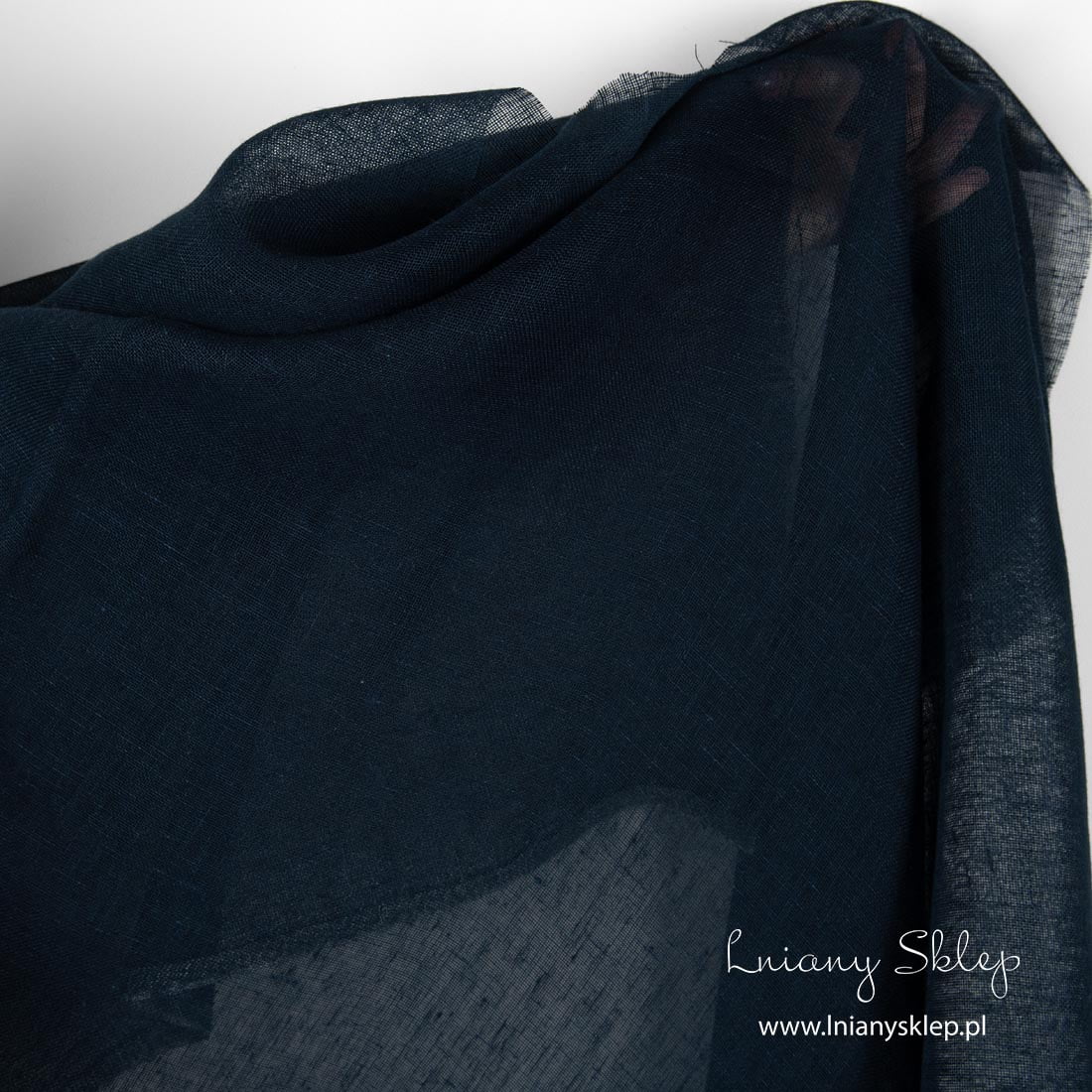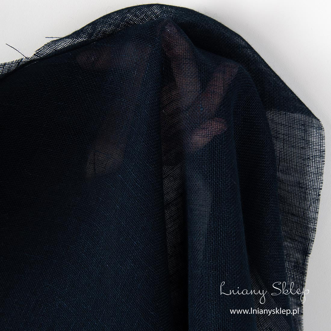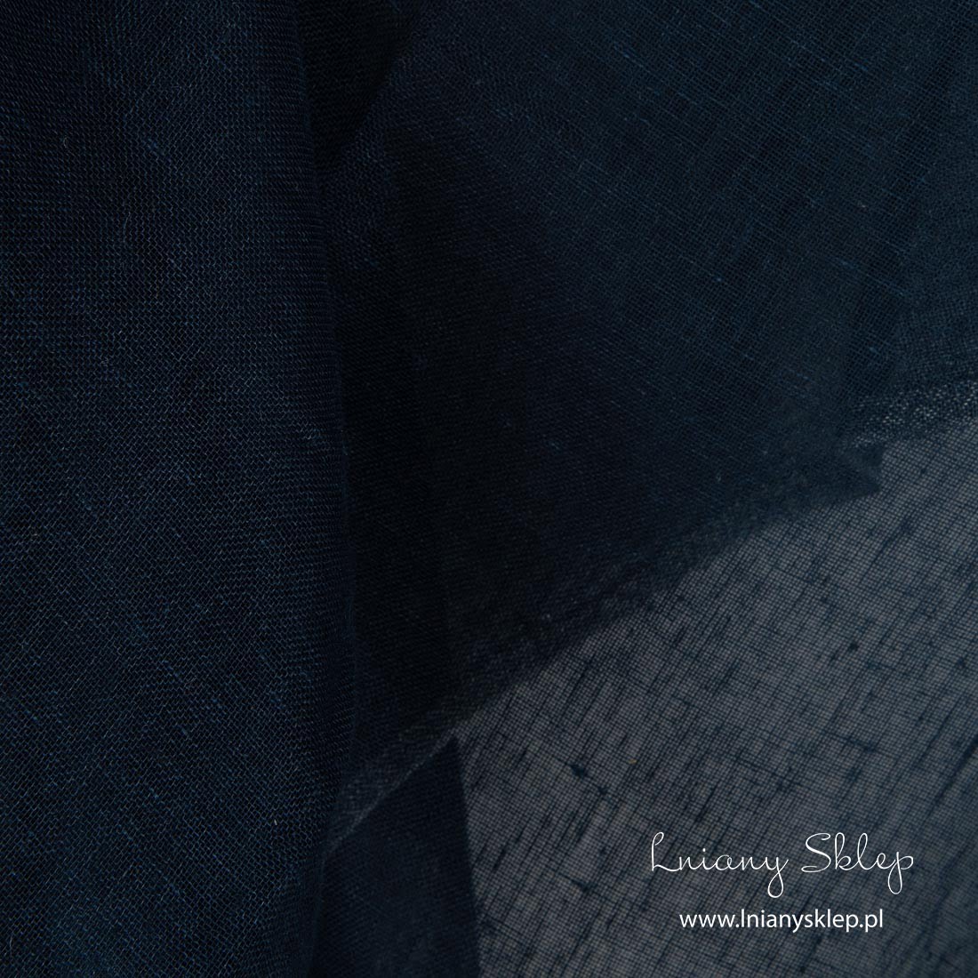 Tkanina lniana granatowa mgiełka. Przeźroczysty, leciutki granatowy, wpadający w czerń len. Na szycie firanek i szaliczków.