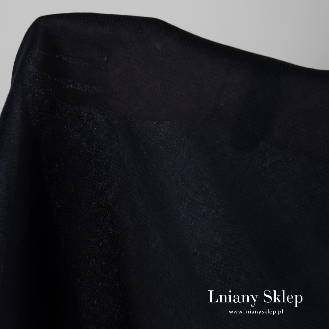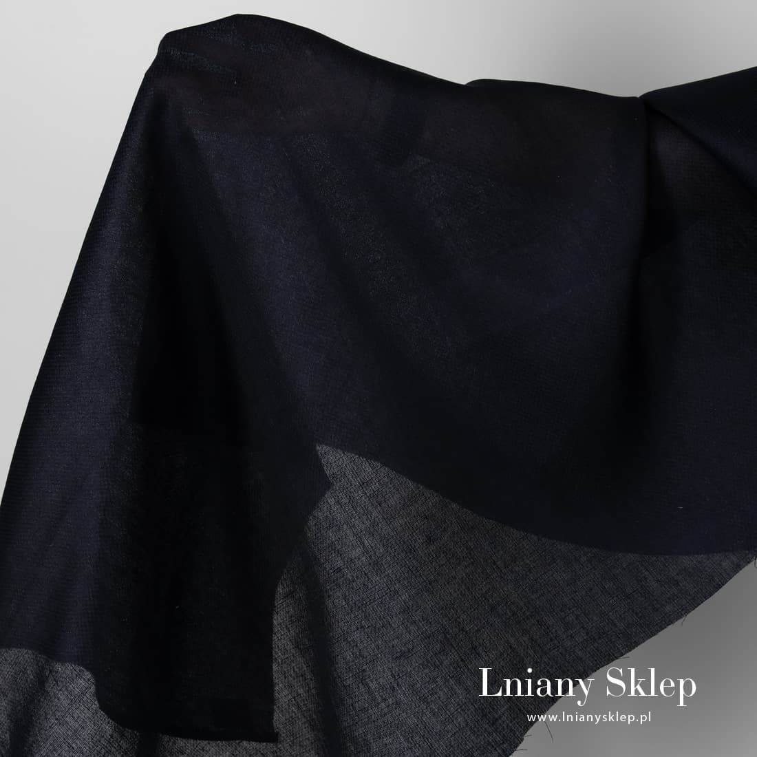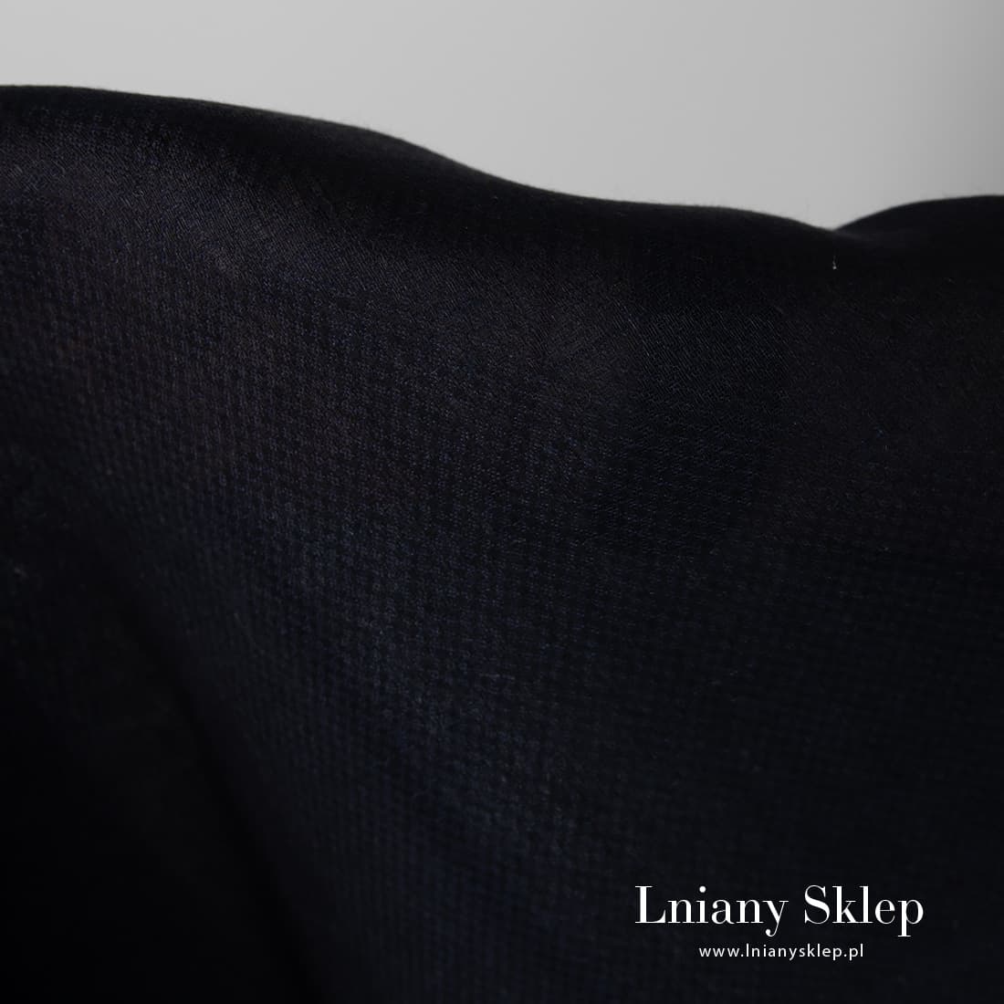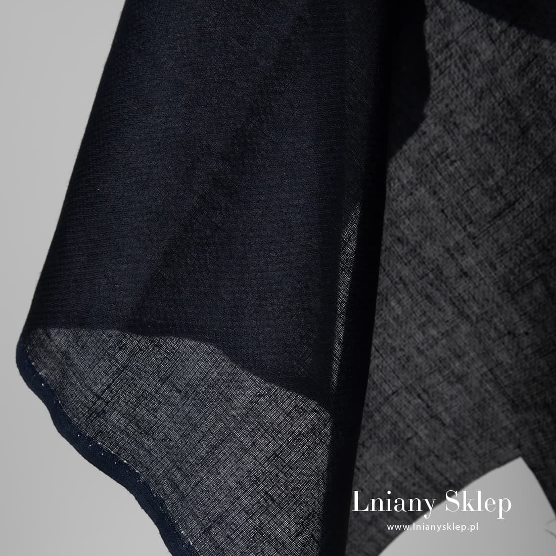 Tkanina lniana granatowa we wzorek. Do wytkania tkaniny użyliśmy przędzy czarnej i granatowej. Użyty splot układa się w drobniutkie kwadraciki. Lekki, lekko prześwitujący, mocny len 100%.