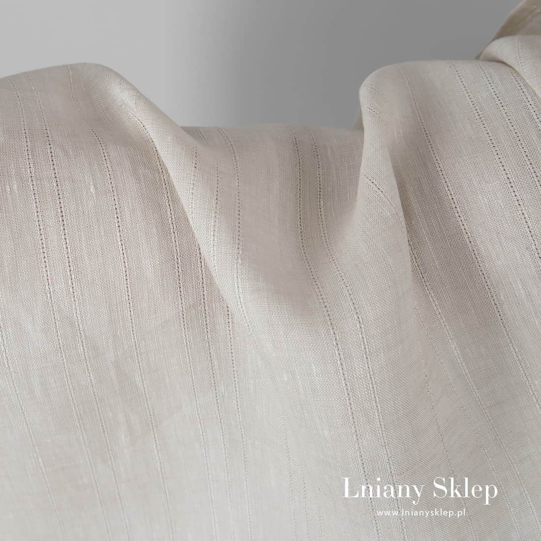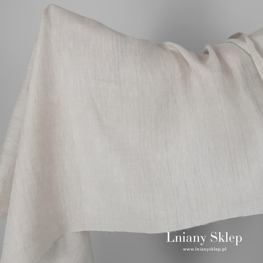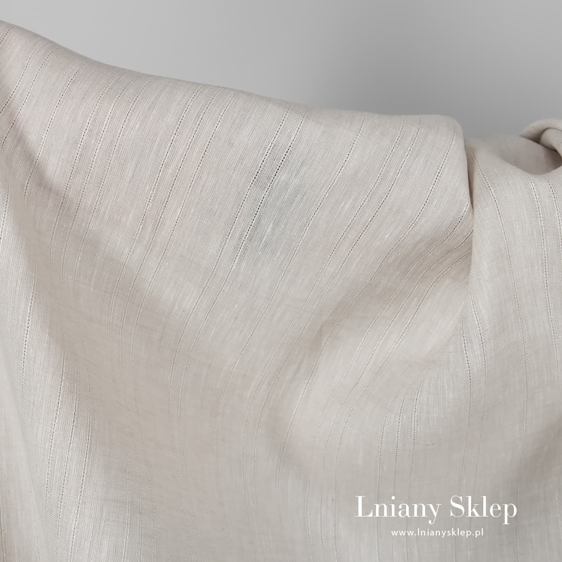Tkanina lniana lekki beż w paski cieniutkie, biegnące pionowo. Tkanina wytkana z przędzy jasnej piaskowej i białej. Lekki, gęsty, średnio ciężki len na szycie odzieży i tekstyliów domowych.