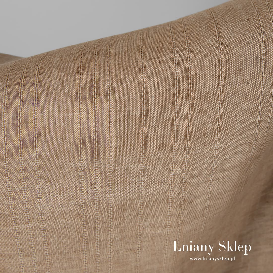 Tkanina lniana lekki brąz w paski cieniutkie, biegnące pionowo. Tkanina wytkana z przędzy brązowej i piaskowej. Lekki, gęsty, średnio ciężki len.
