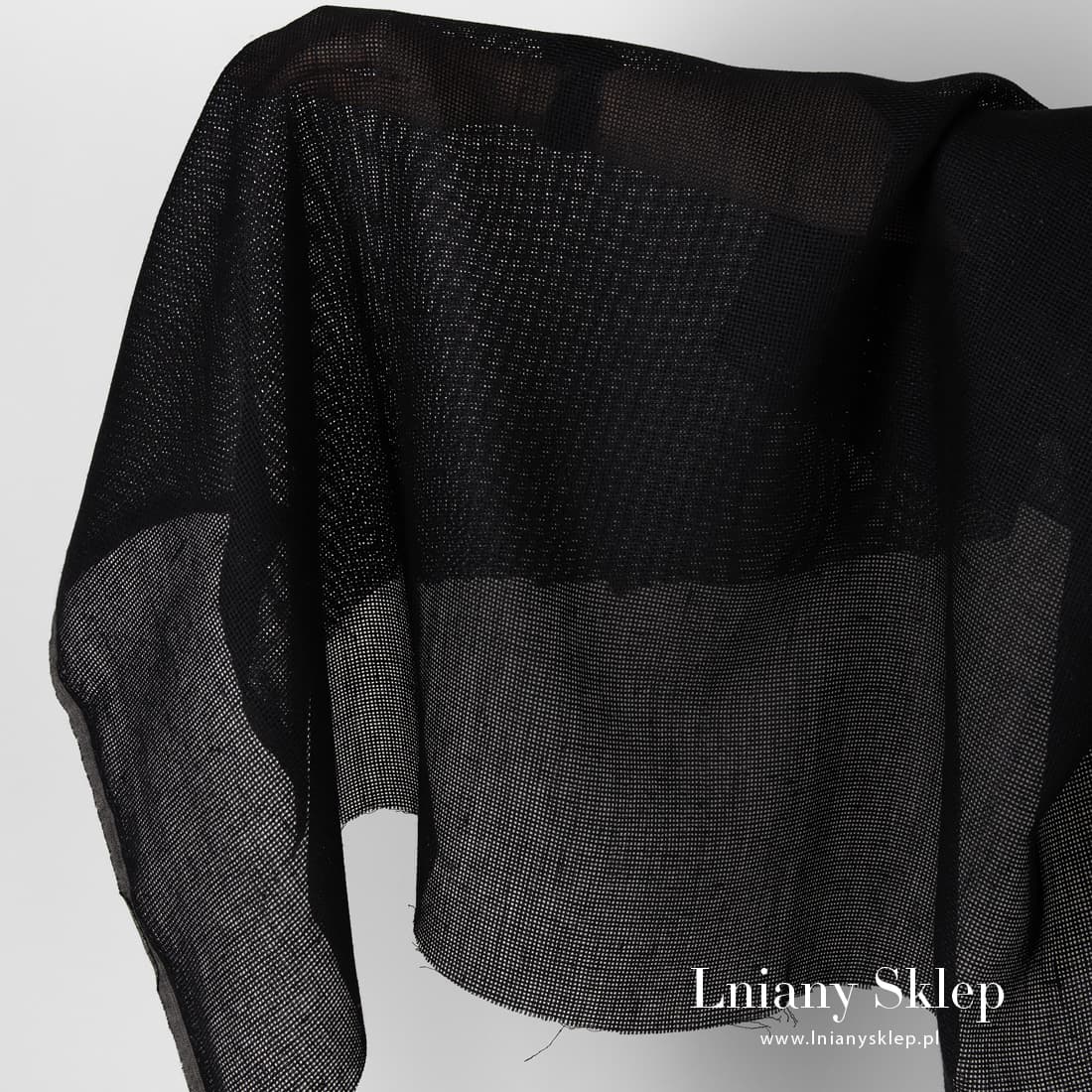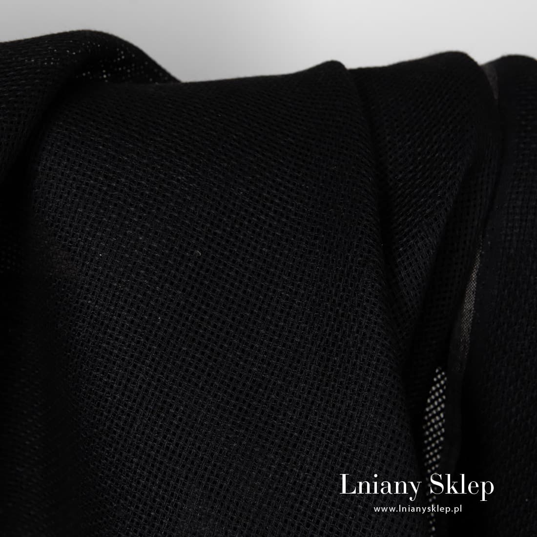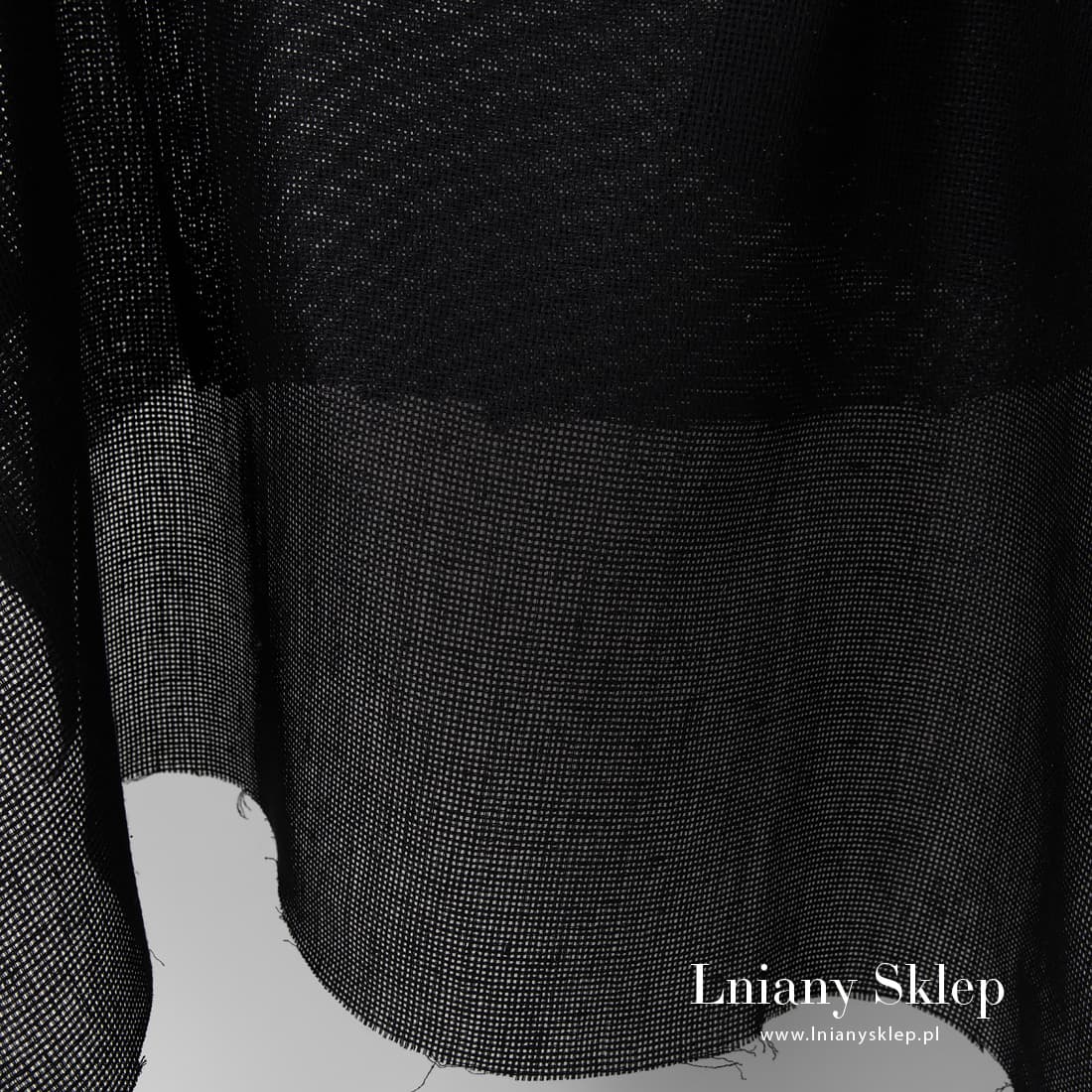 Tkanina lniana lekko czarna kanwa. Wytkana splotem, który się układa w przeźroczyste, drobniutkie kwadraciki. Tkanina pasuje do haftu i na wykonanie różnych robótek.