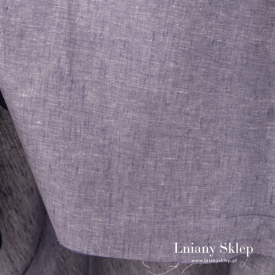 Tkanina lniana liliowy melanż wytkany z fioletowej i mlecznobiałej (lekko żółtawej przędzy). Gęsty, mocny len odzieżowy pasuje też na szycie tekstyliów domowych.