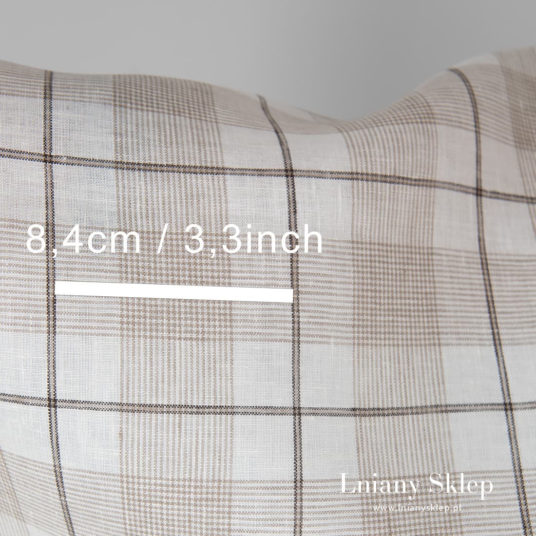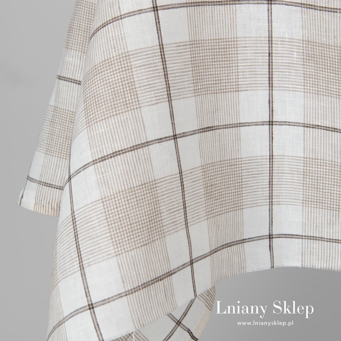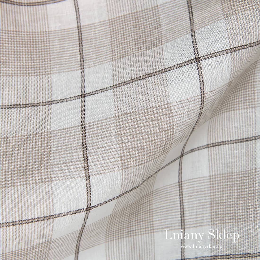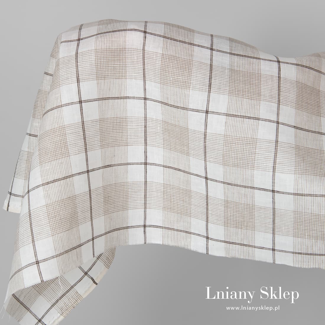 Tkanina lniana w brązową kratkę z przędzy mlecznobiałej (lekko żółtawej), żółtawej, i jasnej oraz ciemnej zielonej. Lekki, mocny, gęsty, średnio ciężki len. Na szycie ubrań, zasłon, pościeli, obrusów i in.