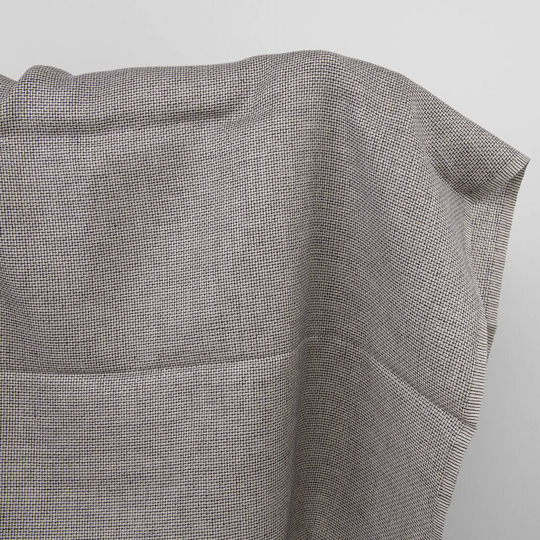Tkanina 100% lniana wytkana z czarnej i szarej (kolor naturalnego włókna lnianego) przędzy w drobniutką krateczkę. Gęsto tkana, średnio ciężka tkanina na szycie zasłon, ubrań, akcesoriów, produktów konfekcji stołowej i kuchennej.