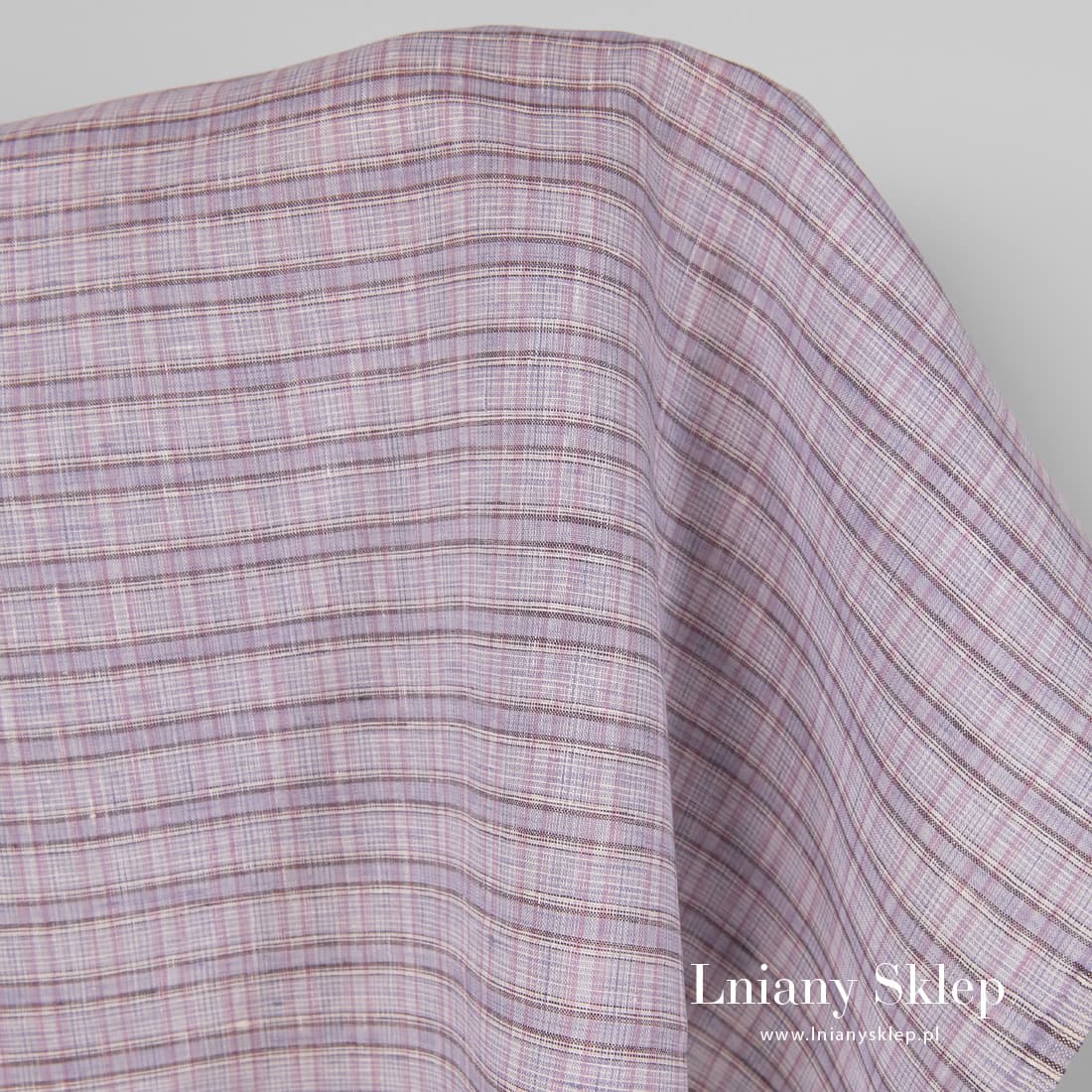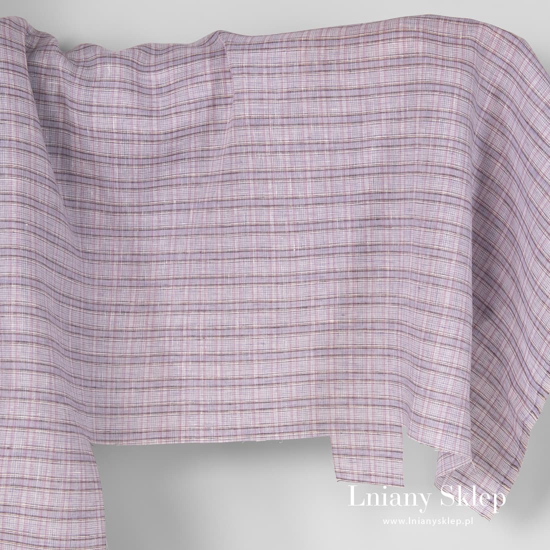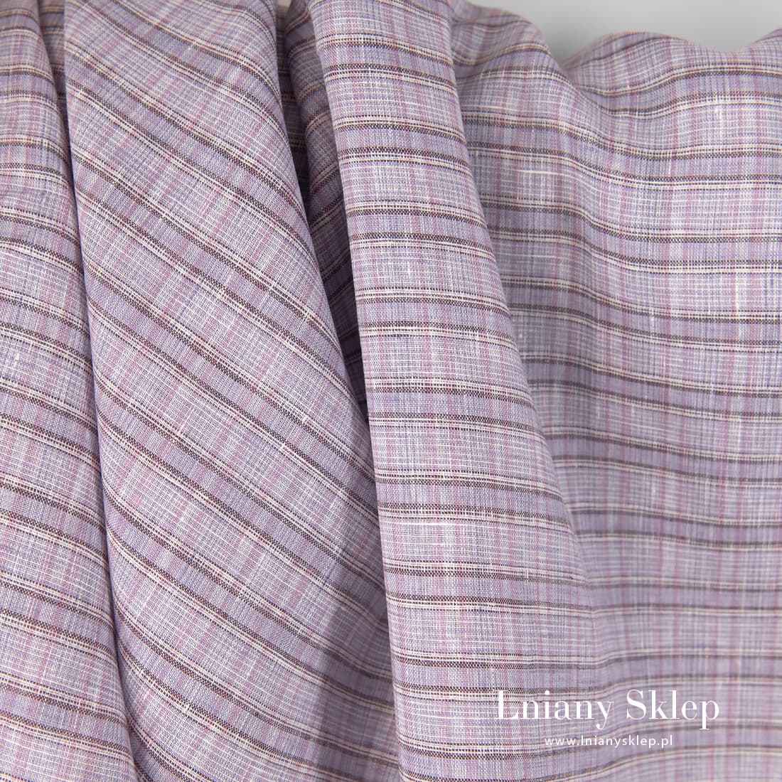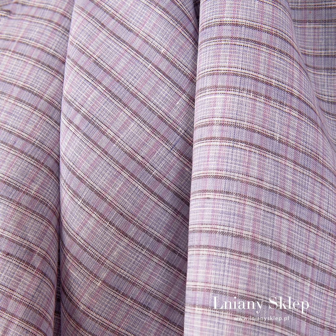 Tkanina lniana w fioletowe okienka. Do wytkania tkaniny użyliśmy fioletowej, mlecznobiałej (lekko żółtawej) i liliowej przędz. Lekki i mocny, gęsty len na szycie odzieży i tekstyliów domowych.