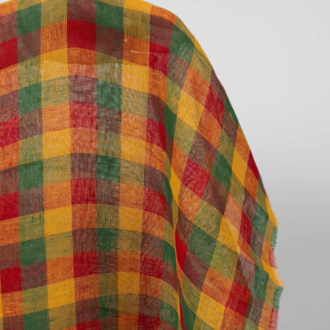 Jaskrawa tkanina lniana w intensywną czerwono - zielono - żółtą kratkę. Jakościowa, lekka tkanina naturalna.