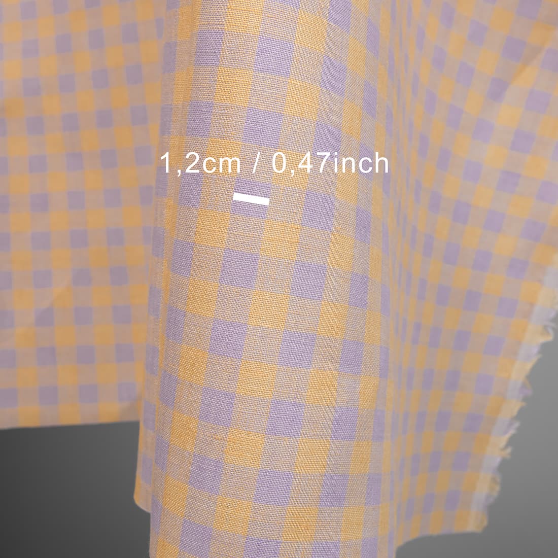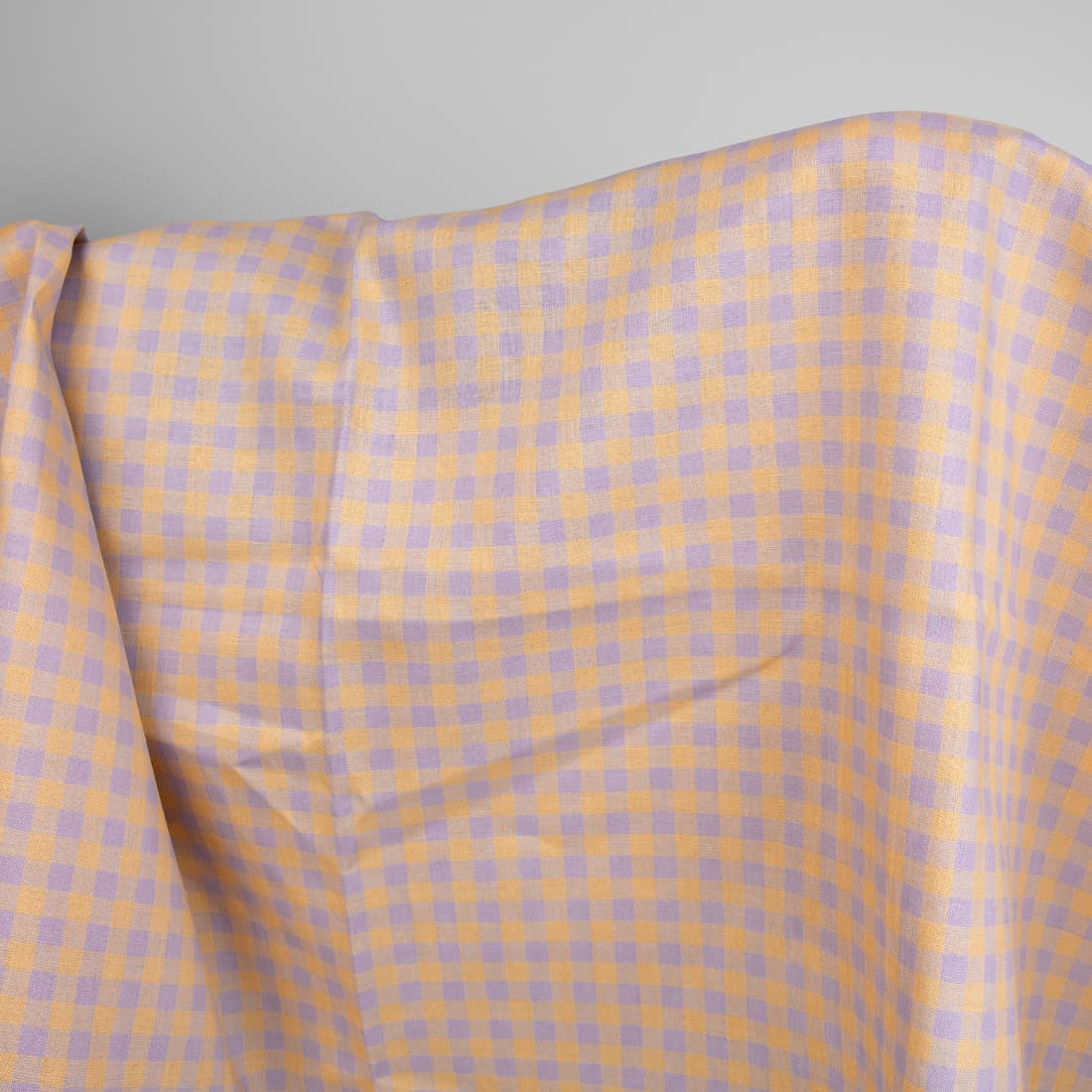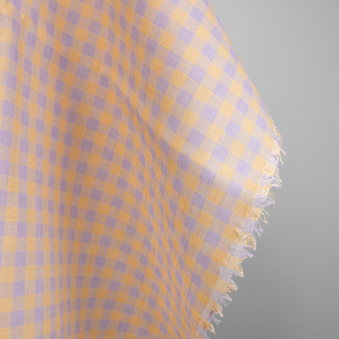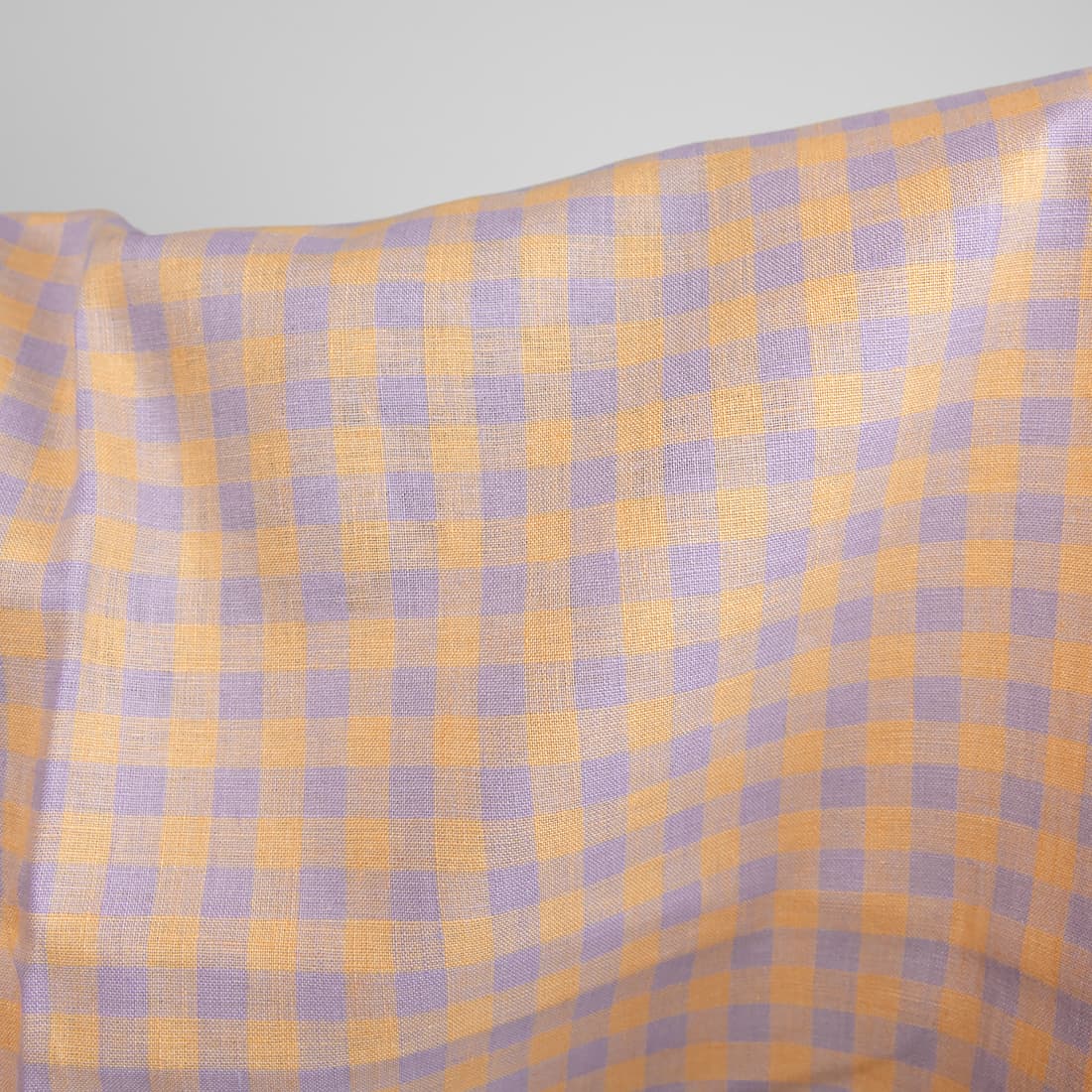 • Tkanina lniana w liliową i żółtą kratkę.