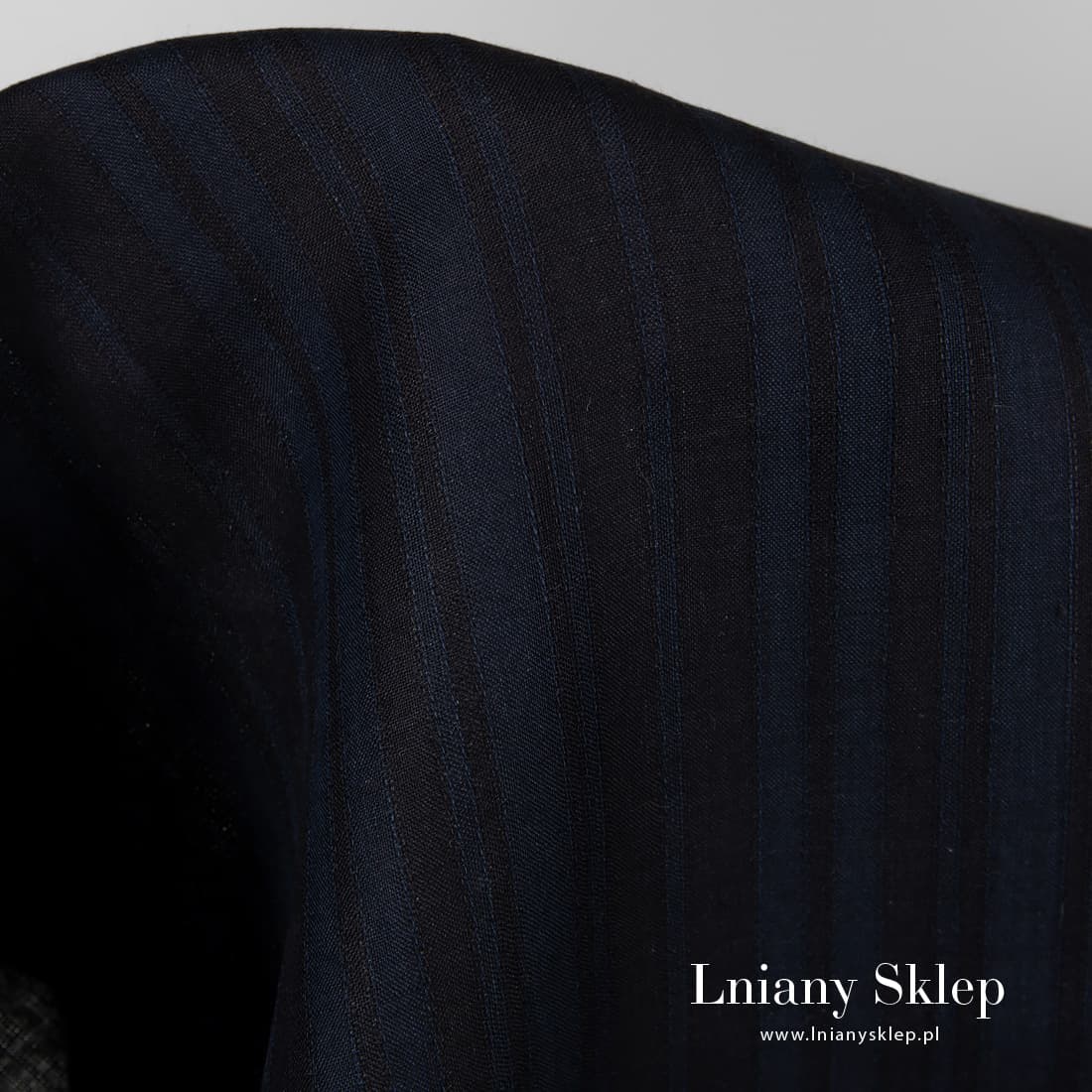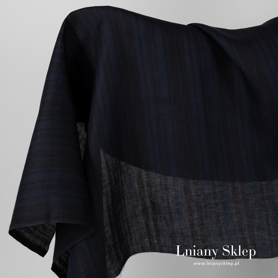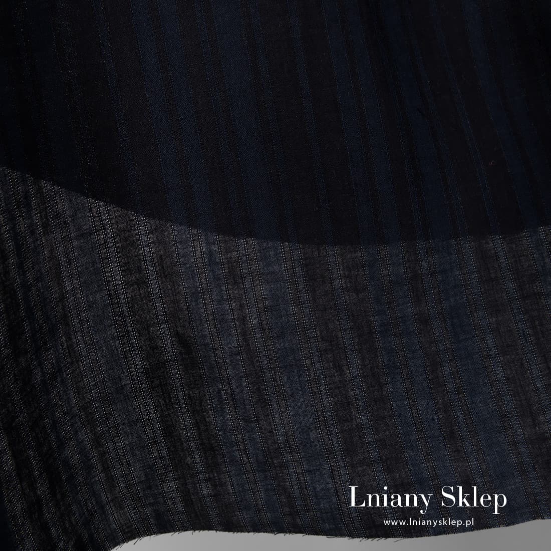 Tkanina lniana w paski ciemne i ażurowe wytkane z przędzy czarnej i granatowej, a biegnące pionowo. Lekki, gęsty, średnio ciężki len na szycie odzieży, obrusów, serwetek, zasłon i in.