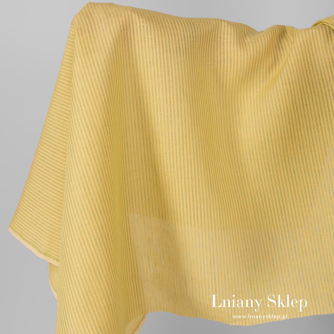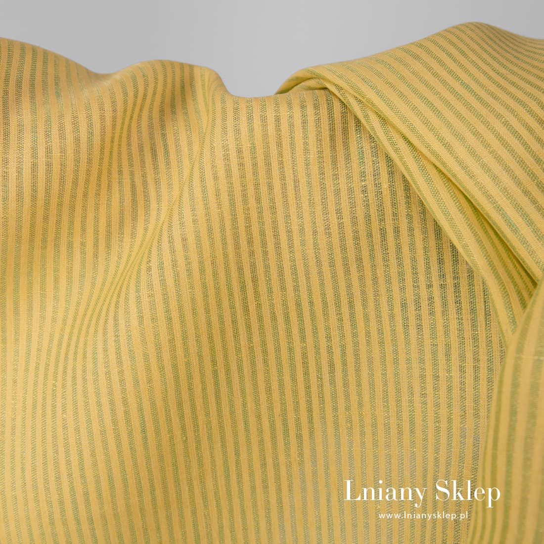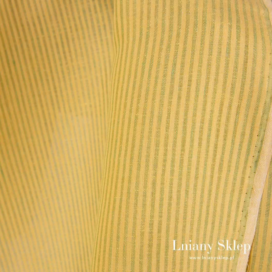 Tkanina lniana w paski cytrynowe i zielone. Paski wytkane są gęściej i rzadziej, a biegną pionowo. Len 100% na szycie lekkiej odzieży, obrusów, serwetek, zasłon i in.