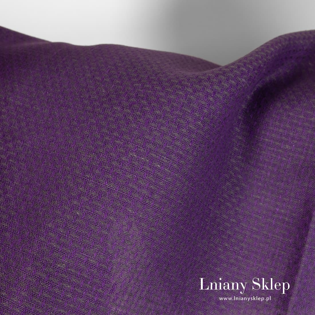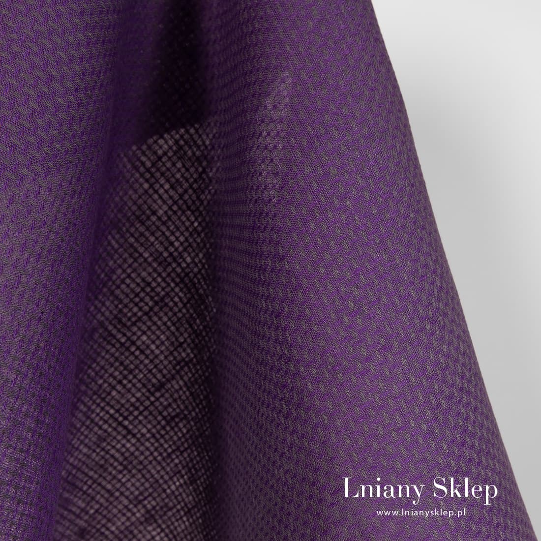 Tkanina w drobny fioletowo – szary wzór geometryczny. Mocna, gęsto wytkana, średnio ciężka tkanina 100% lniana na odzież i najróżniejsze tekstylia domowe.