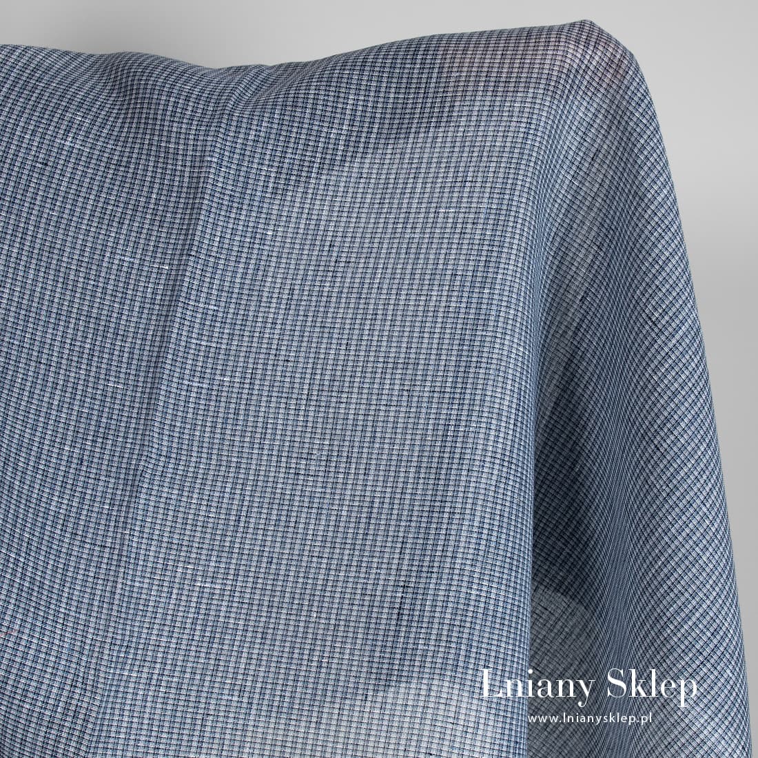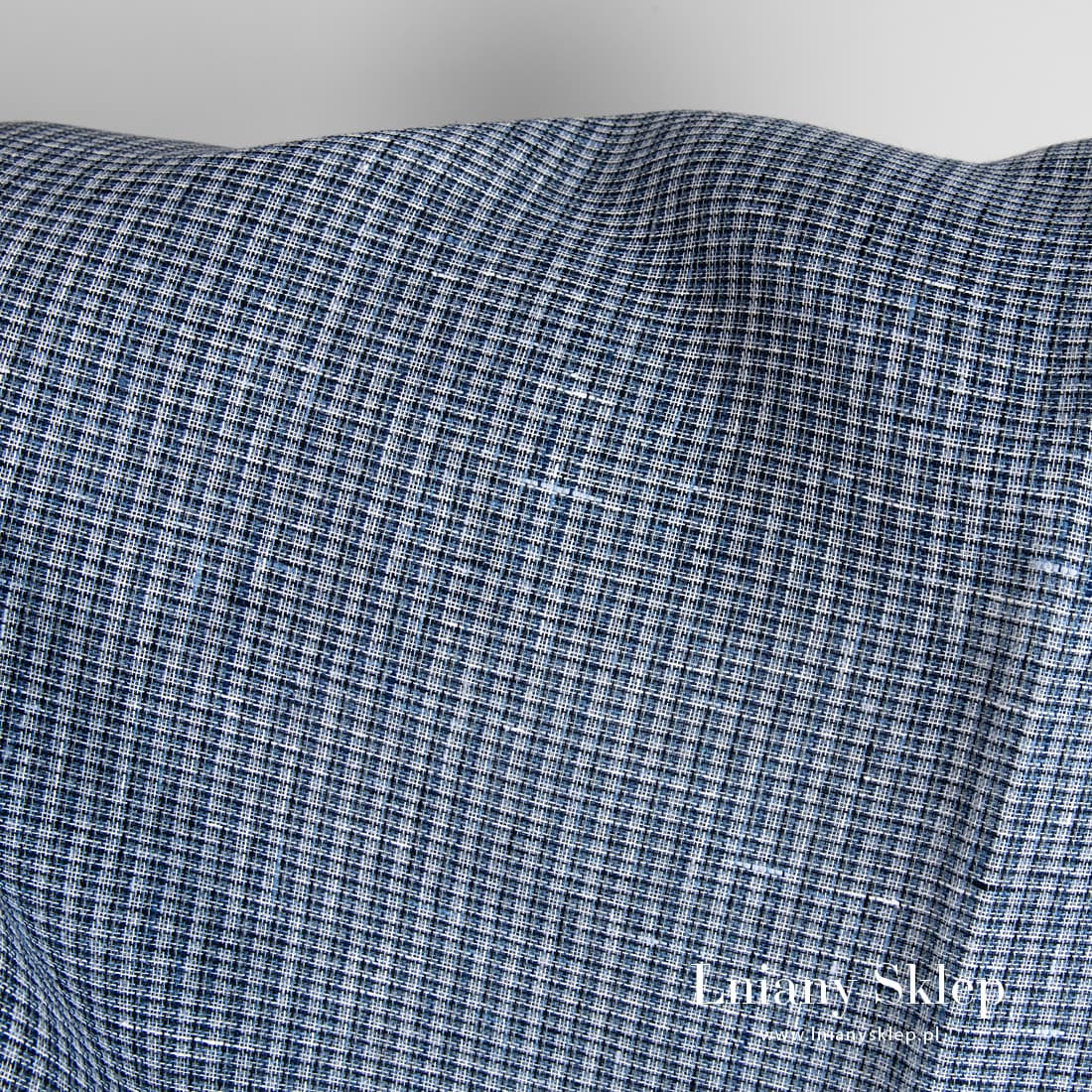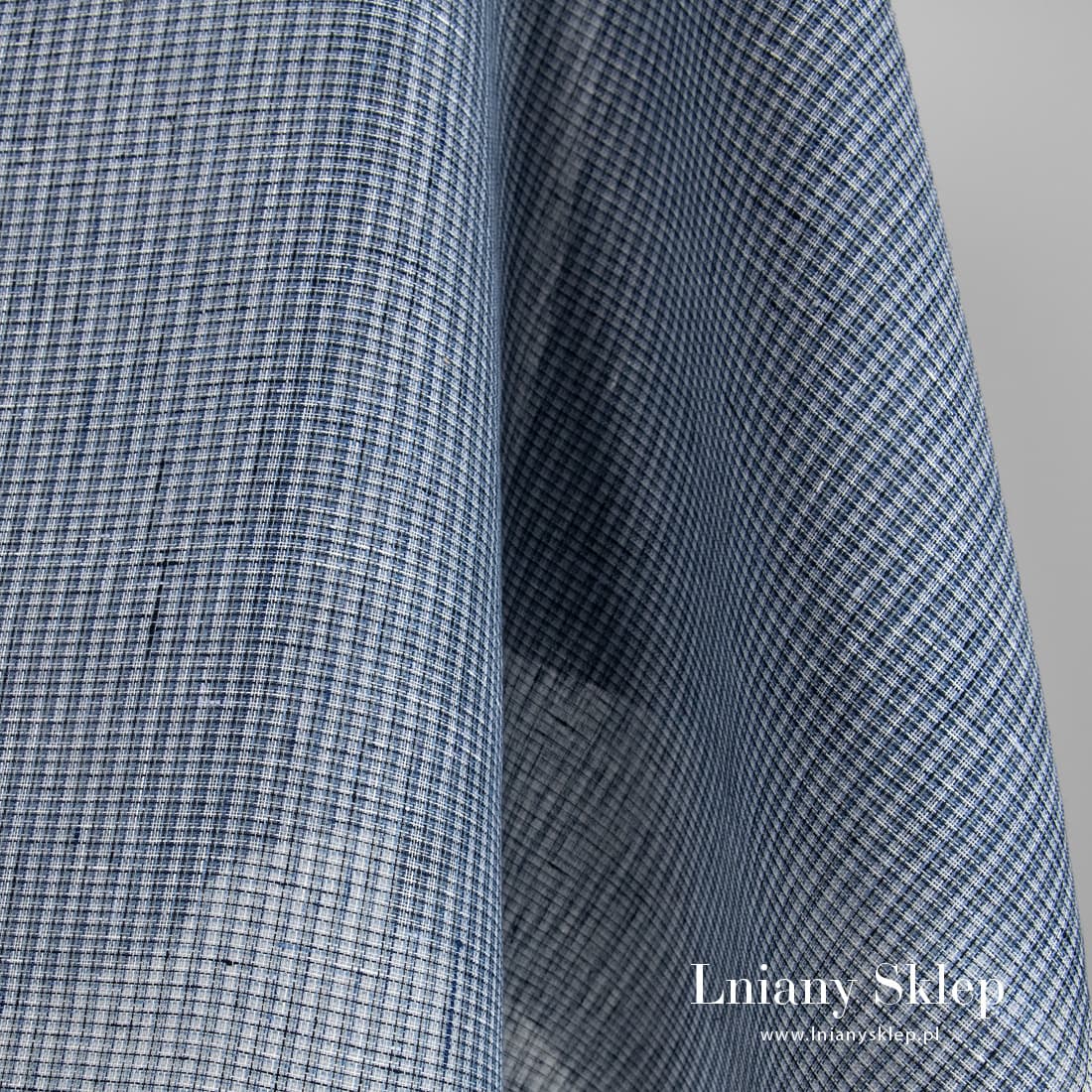Tkanina w okienka prześwitujący niebieski len. Kolory użytej przędzy: mlecznobiała (lekko żółtawa), lekko szara i szara o niebieskim odcieniu oraz kilku odcieni niebieskiego. Ta tkanina prześwitując i leciutka – idealnie pasuje na szycie firanek, szaliczków i in.