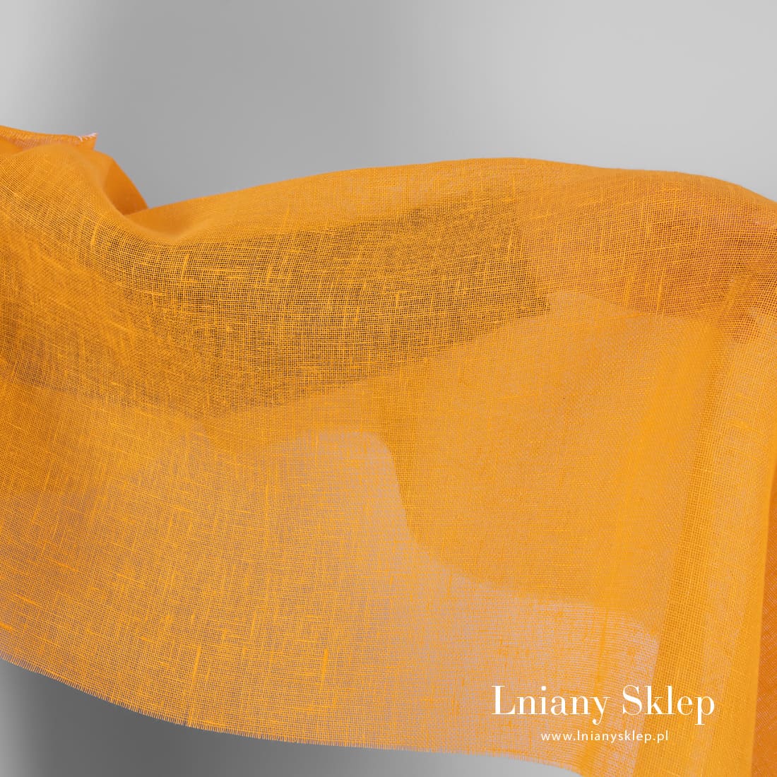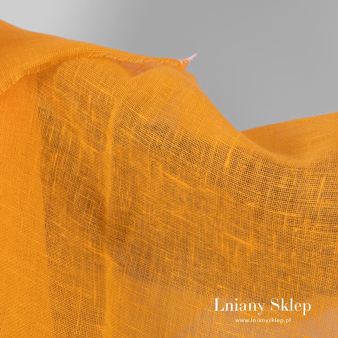 Rzadko tkana, jaskrawa, żółta tkanina lniana. Prześwitująca, leciutka i cieniutka tkanina naturalna idealna na szycie firanek, szaliczków i najróżniejszych akcesoriów.