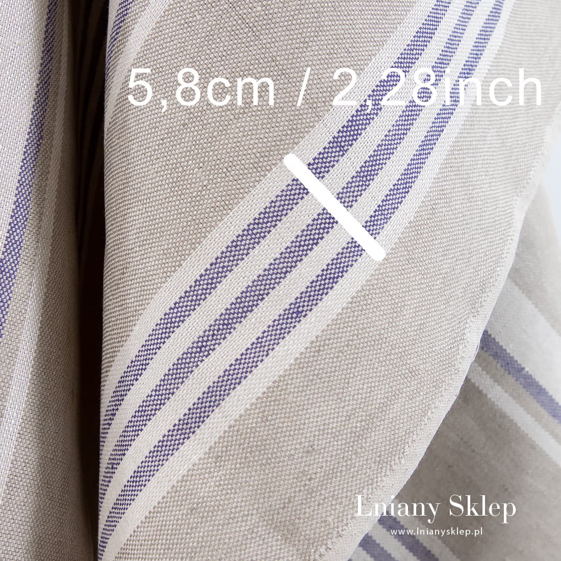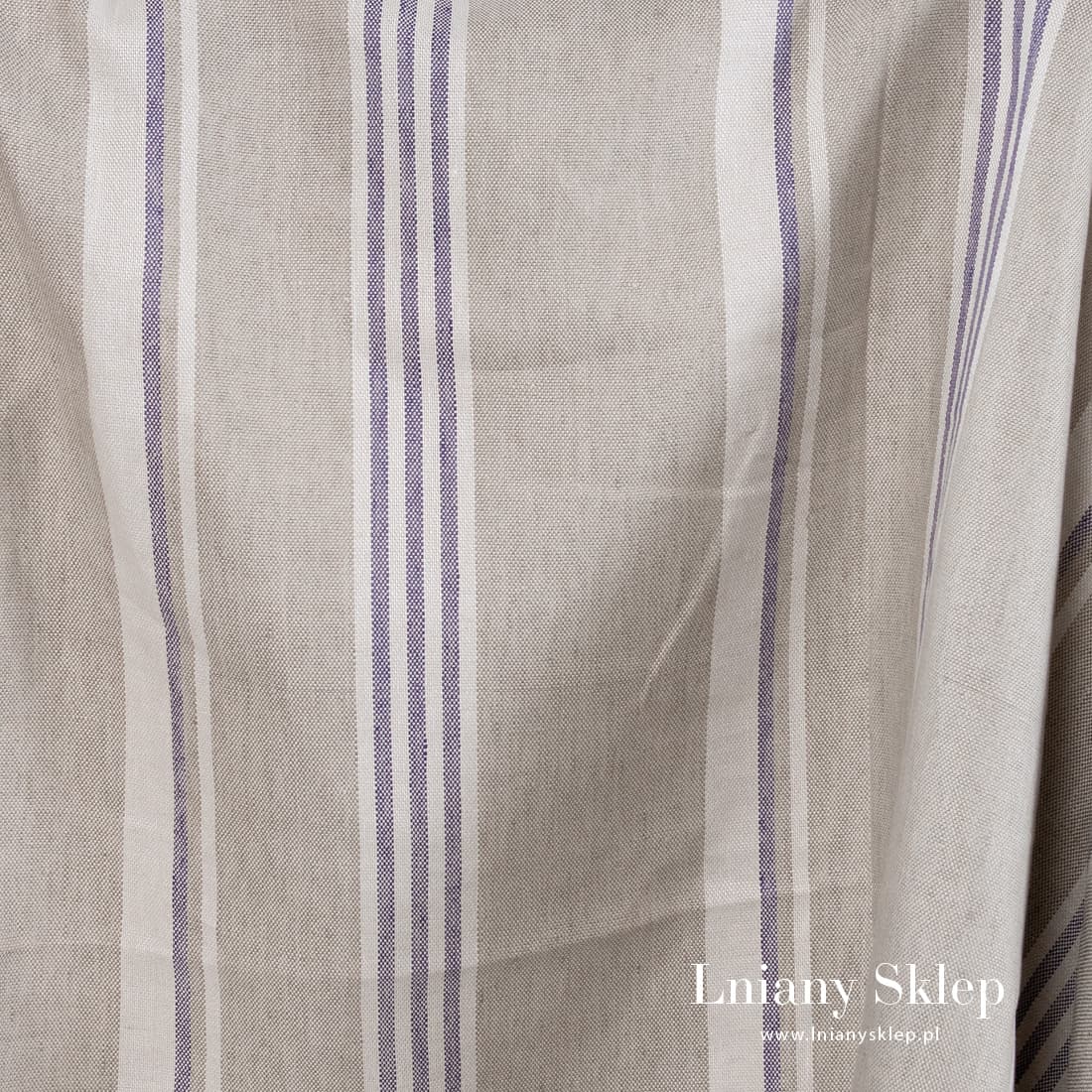 Wytrzymała lniana tkanina w pionowe paski fioletowe i białe na pisakowym tle wytkana splotem „panama”. Wyjątkowo mocna tkanina. Gęsty, dość gruby i ciężki len o szerokości 150 cm.