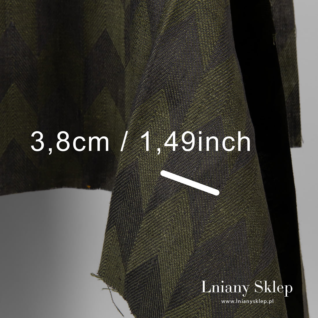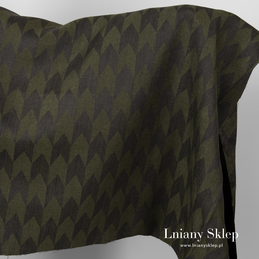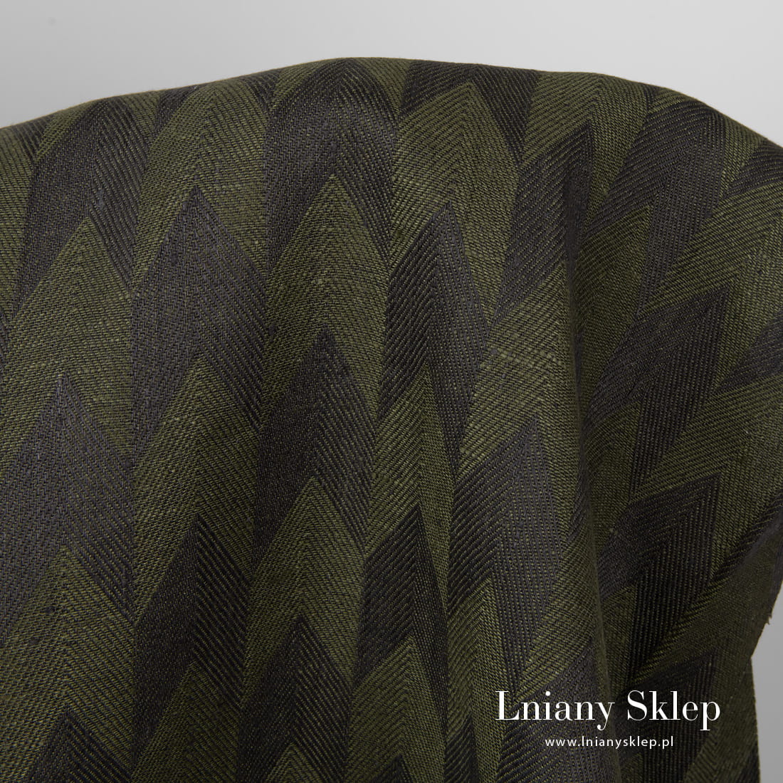 Żakardowy len w zielony wzór. Tkanina wytkana splotem skośnym z przędzy ciemnoszarej o piaskowy odcieniu i ciemnozielonej. Gęsto wytkany, dość ciężki len 100%.