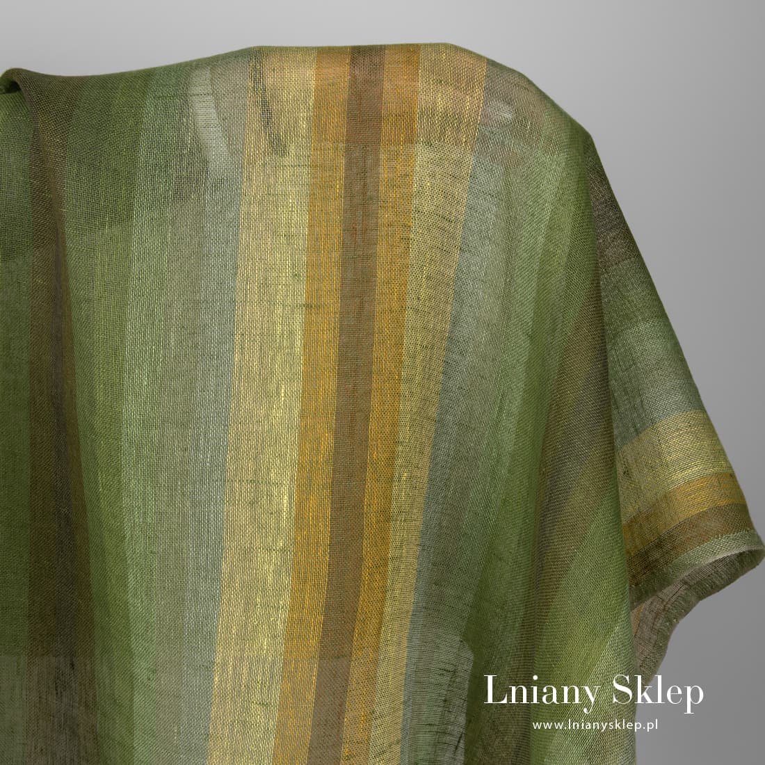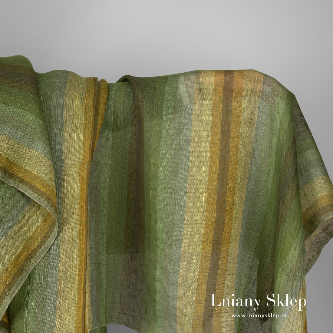 Rzadko tkana, lekka, przeźroczysta tkanina lniana wytkana w zielone, żółte, pomarańczowe, szare i brązowe paski o różnej szerokości.