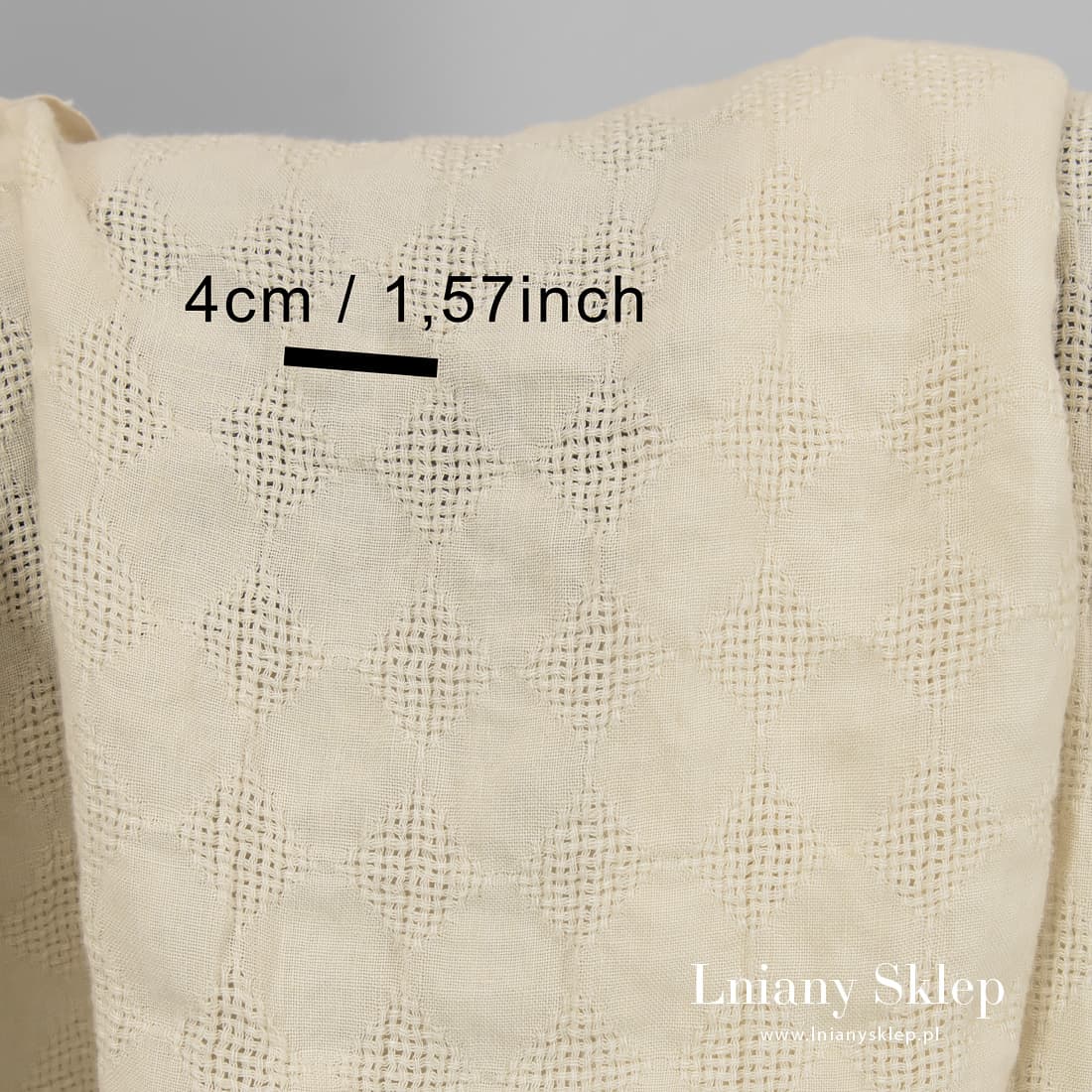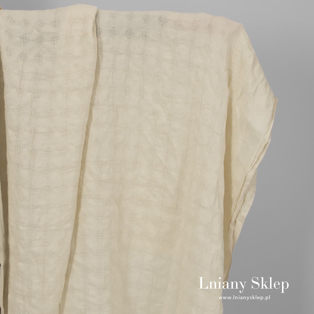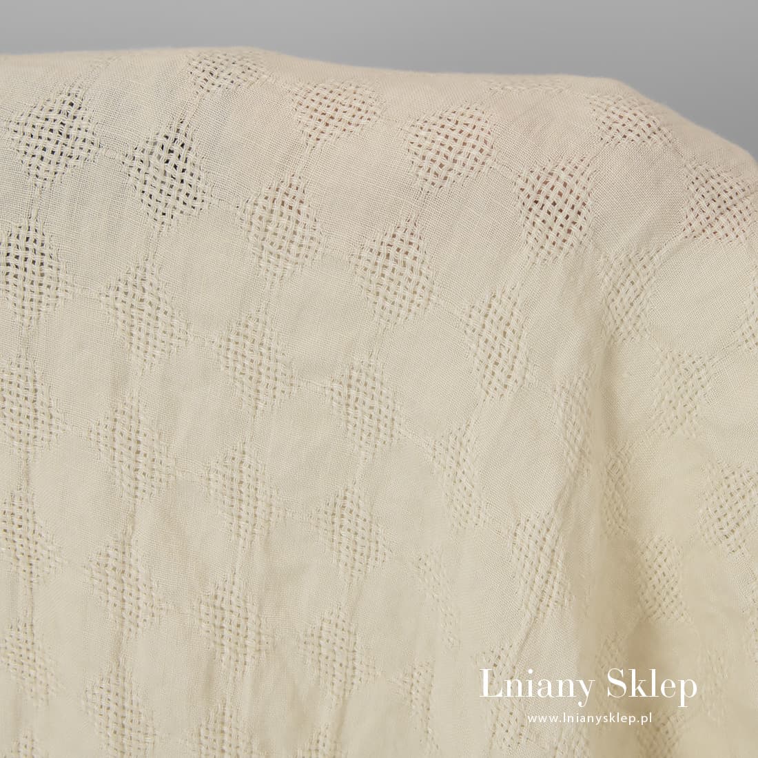 Beżowy prany len w romby wytkane na przemian gęściej i rzadziej (przeźroczyście). Ciężka, mocna, gęsta prana tkanina 100% lniana na szycie odzieży, szalików, zasłon.