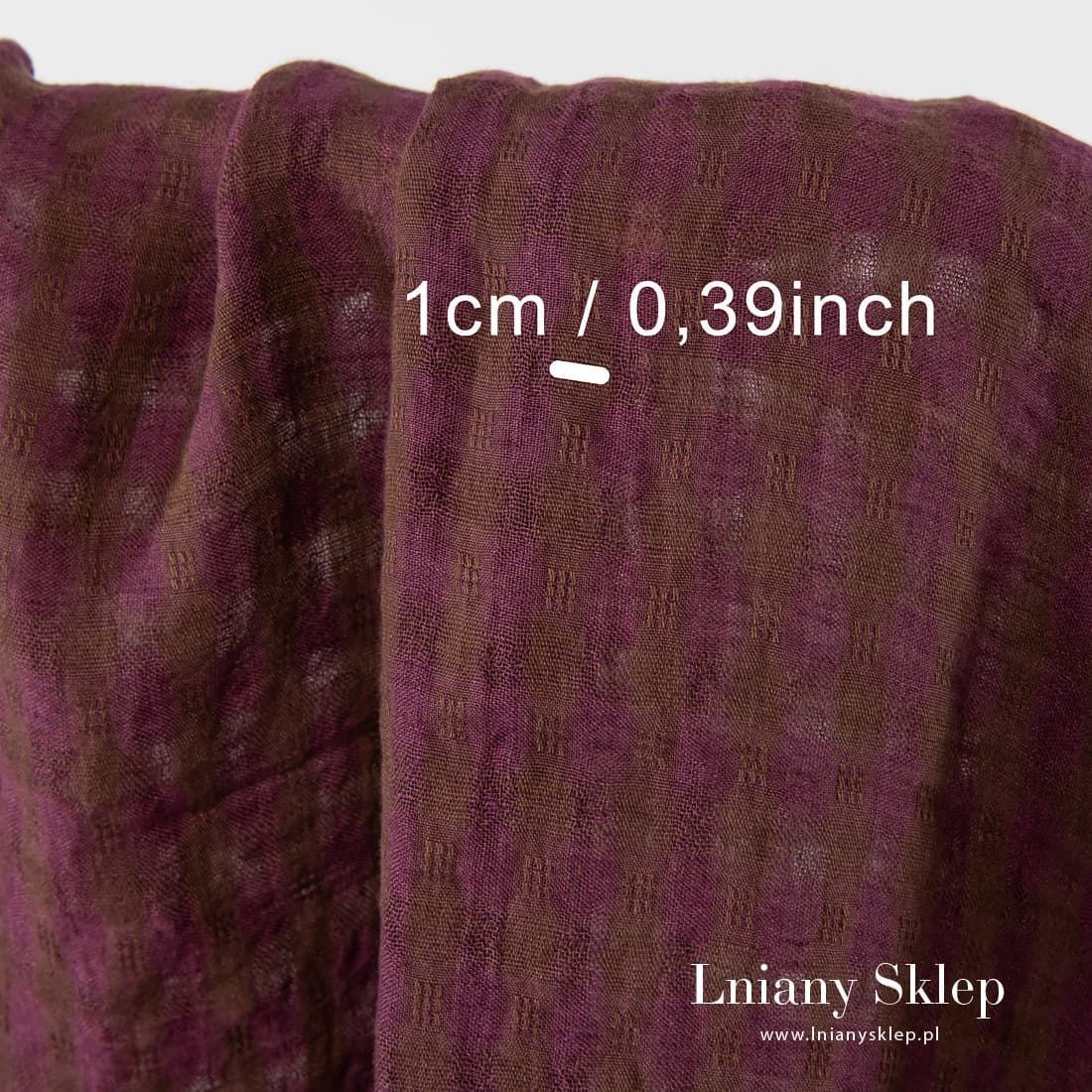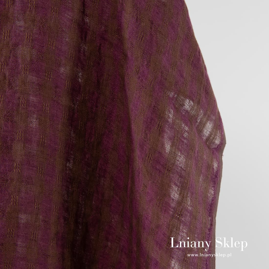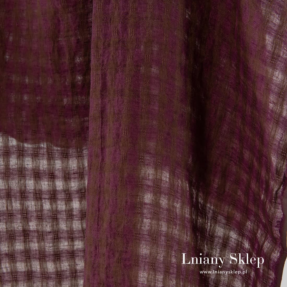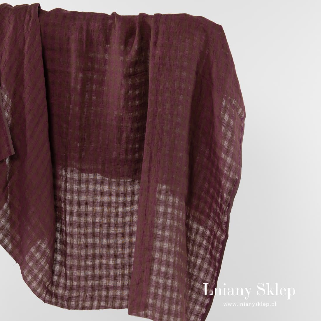 Bordo prany len w przeźroczystą kratkę. Do wytkania tkaniny użyliśmy przędzy brązowej i bordo (ciemnoczerwonej). Po praniu tkanina jest miękka. Nie ściągnie się więcej.