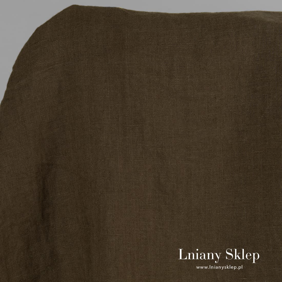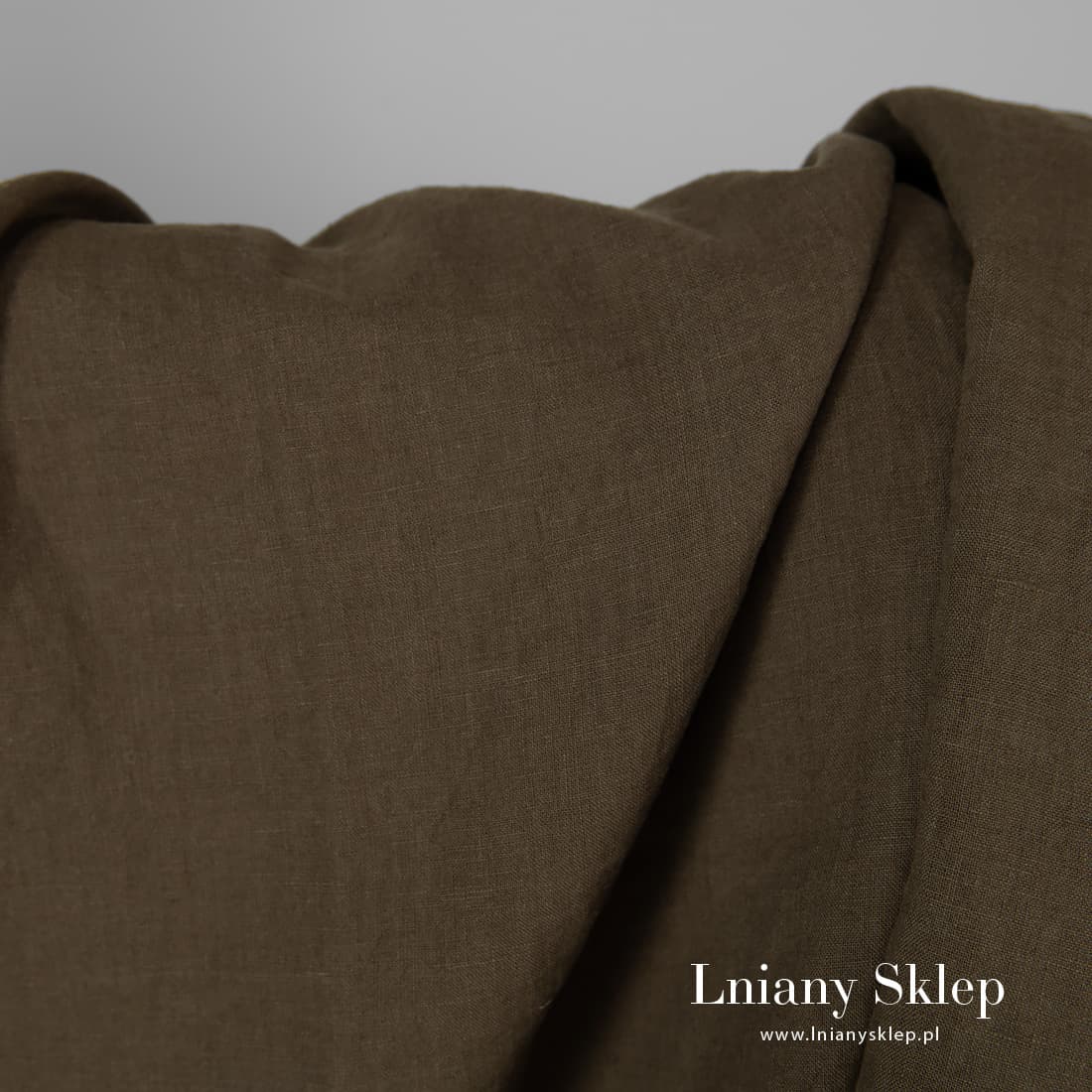 Ciemne khaki prany len. Kolor przypomina nieco brązowy mech. Gęsta, mocna, średnio gruba tkanina. Po praniu miękka i przytulna, nie ściągnie się po kolejnych praniach.