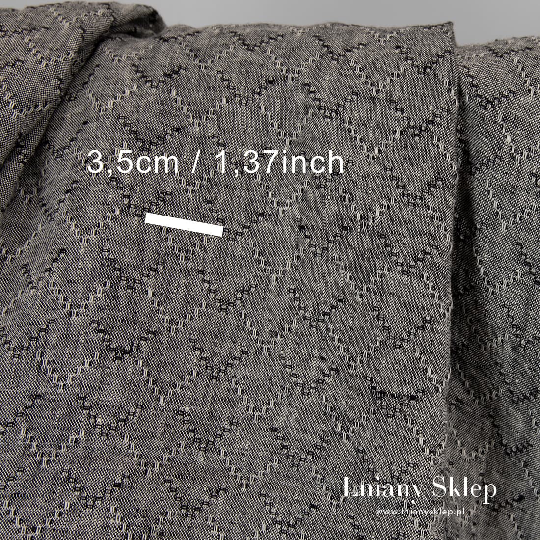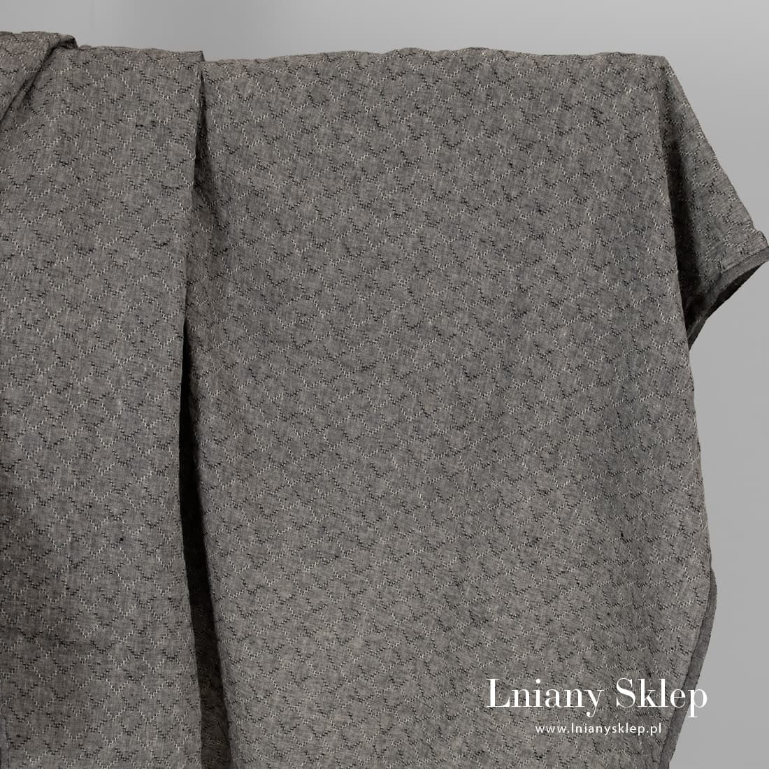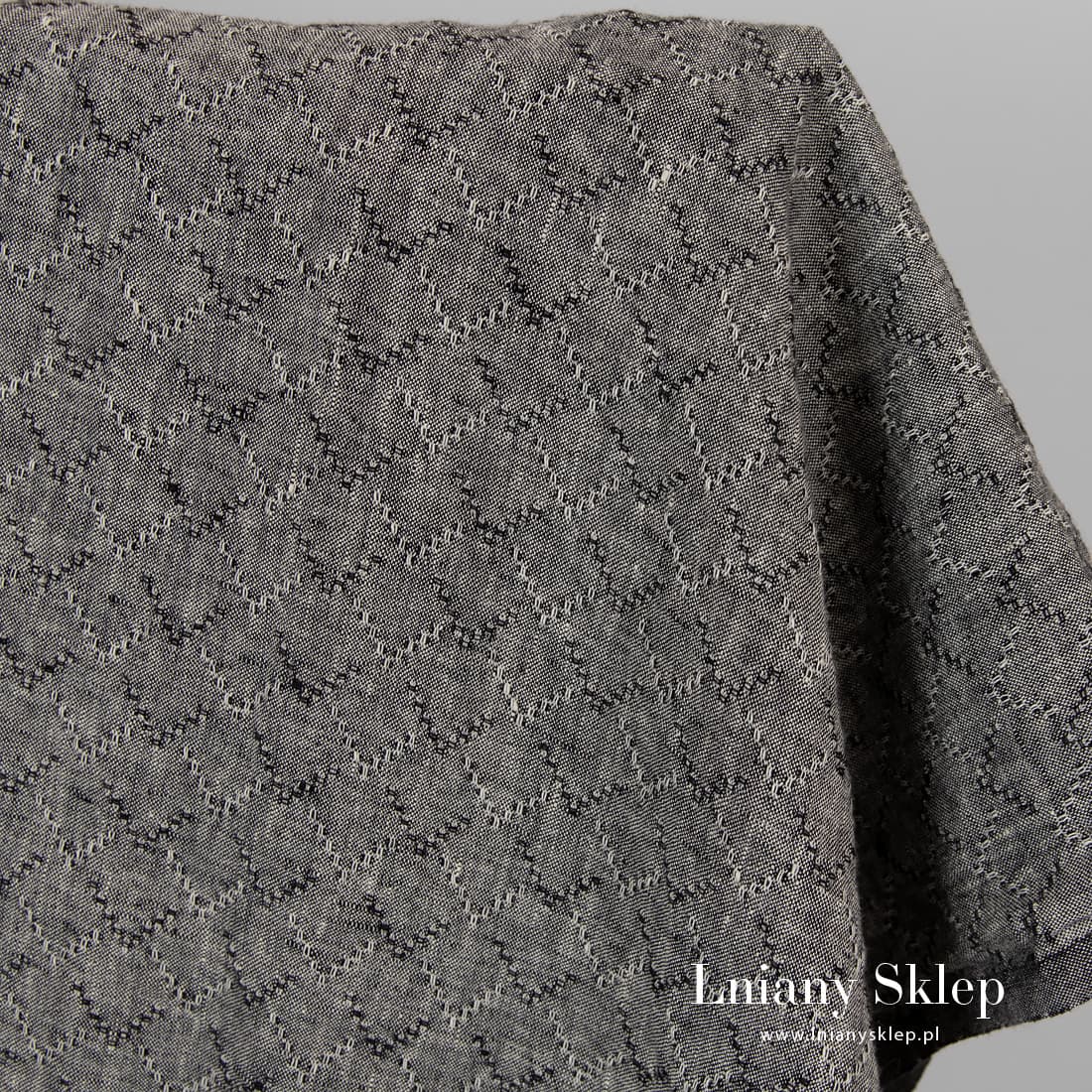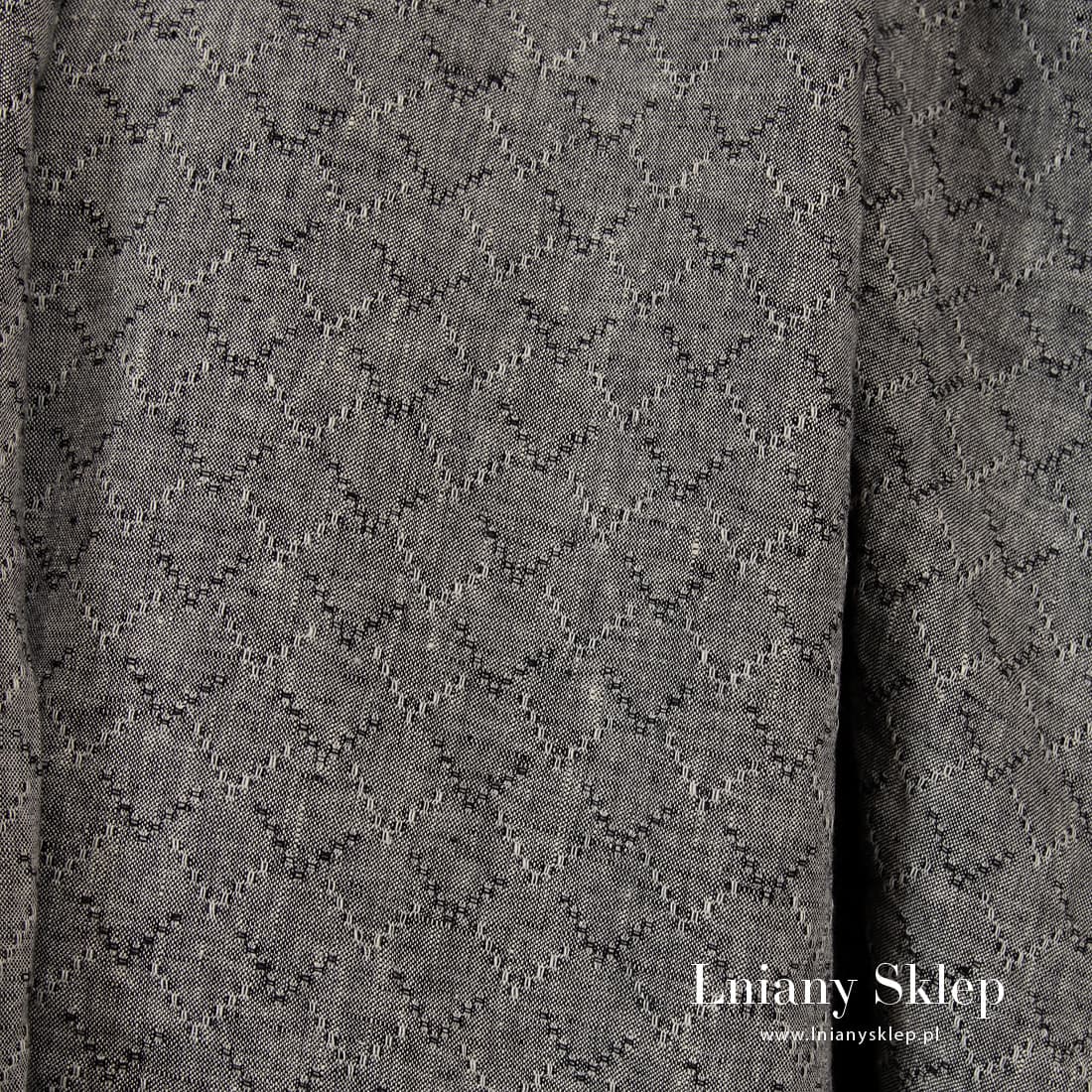 Czarny prany len w romby wytkany melanżowo z przędzy czarnej i mlecznobiałej. Po praniu tkanina mięciutka i już się nie ściągnie. Uniwersalna tkanina 100% lniana na szycie odzieży i tekstyliów domowych.