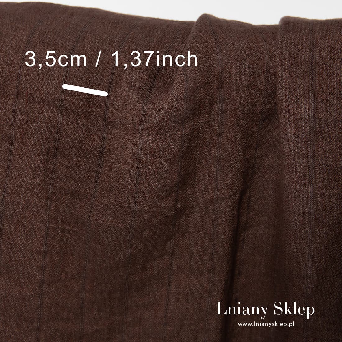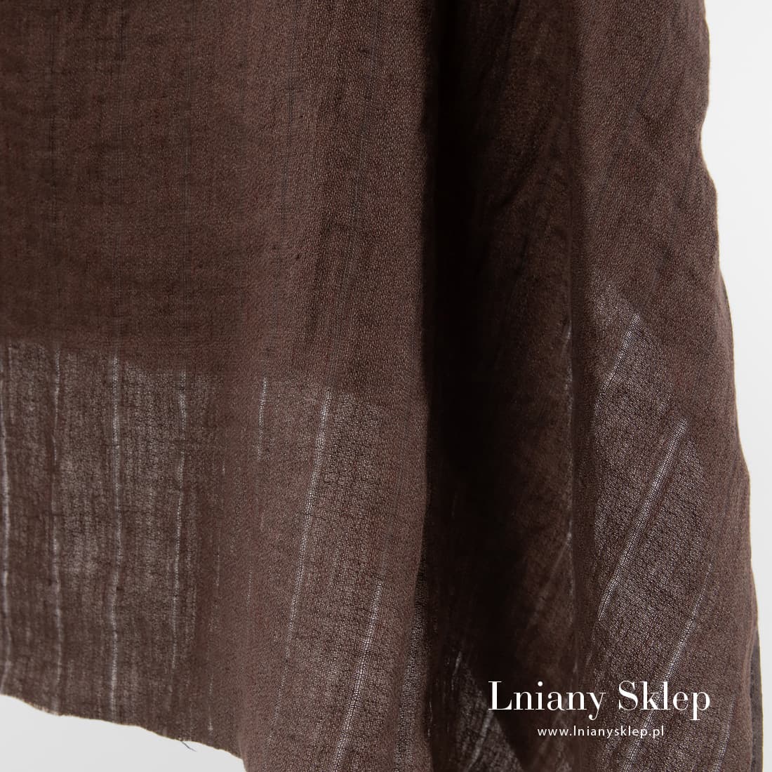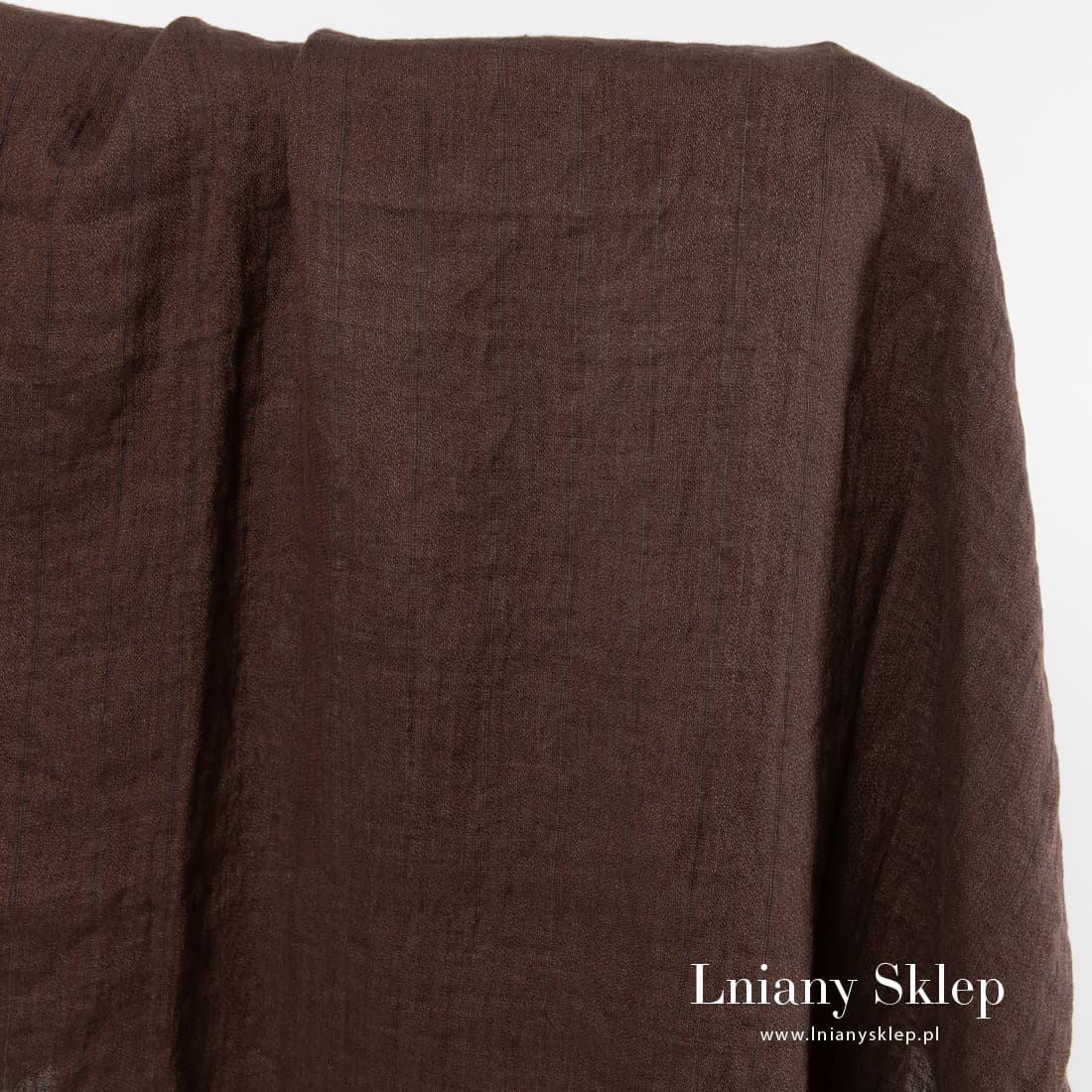 Czekoladowy prany len w przeźroczyste paski. Do wytkania tkaniny użyliśmy przędz o trzech odcieniach brązu. Po praniu tkanina jest miękka. Nie ściągnie się więcej.
