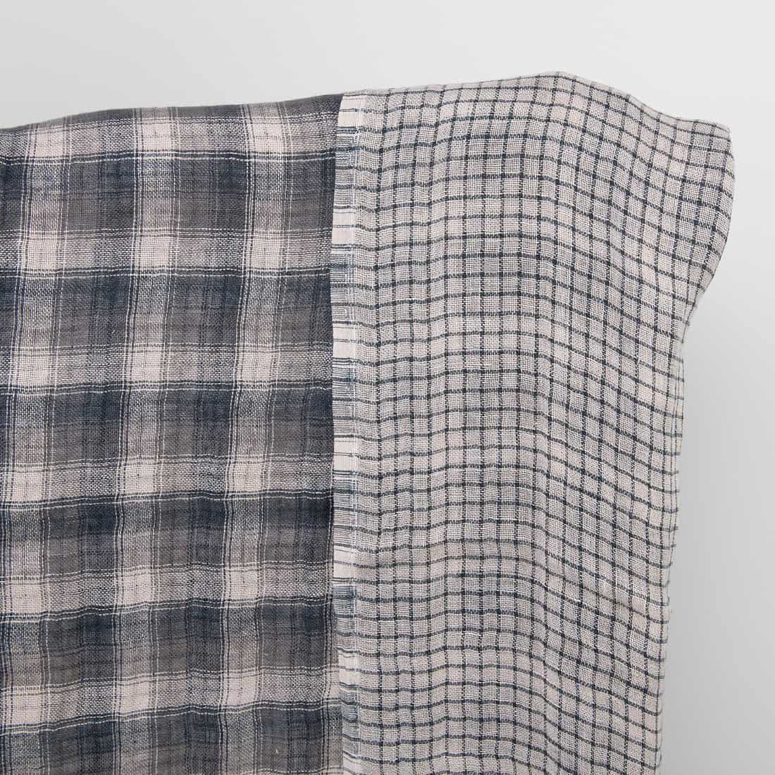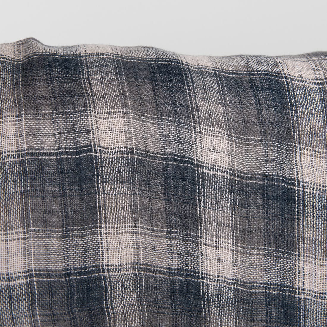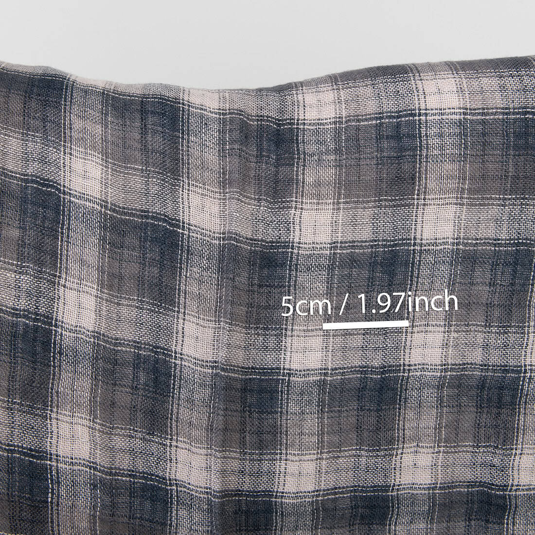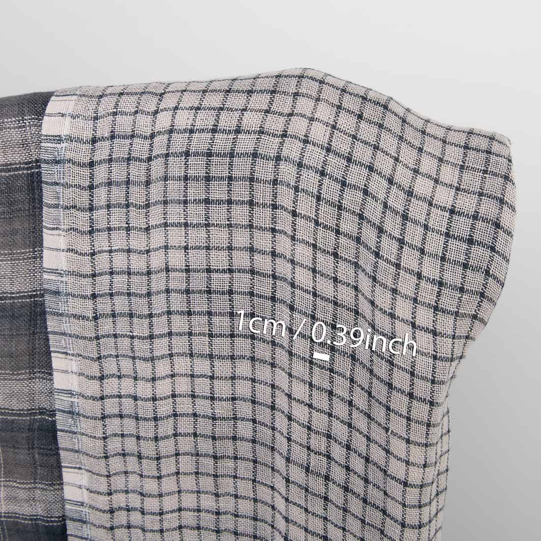 Dwustronna prana tkanina lniana wytkana w kratkę. Jedna strona tkaniny - w dość dużą kratkę wytkaną z przędzy o różnych szarych odcieniach, druga - w drobną krateczkę z szarej i ciemnej szaro - granatowej przędzy. W procesie produkcji tkaninę poddano praniu, dlatego jest lekko gnieciona, miękka i nie ściągnie się po kolejnych praniach.