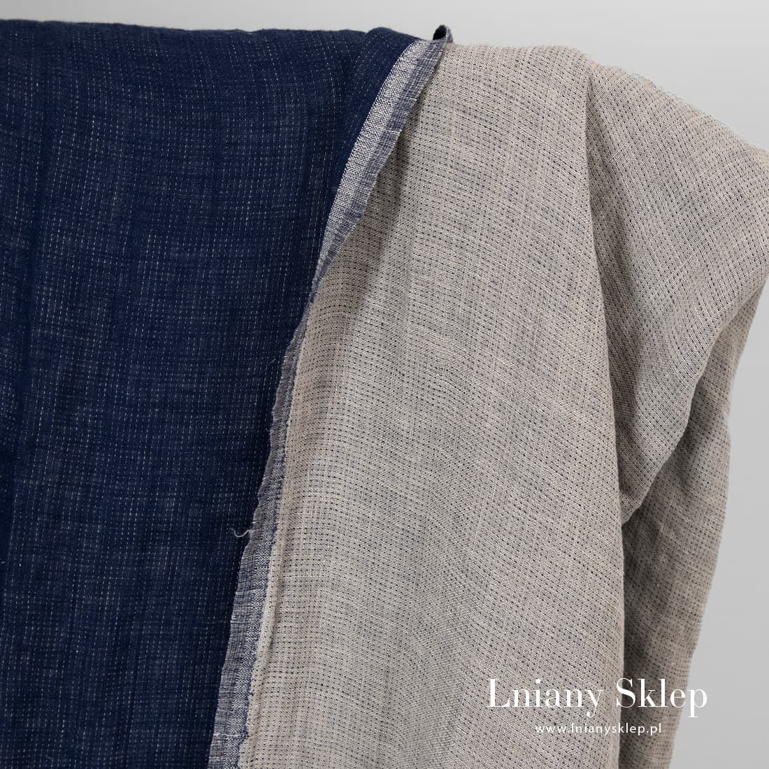 Dwustronny granatowy i szary prany len jest wytkany z przędzy granatowej i niebarwionej (szarej o piaskowym odcieniu). Obydwie strony ożywiają wytkane nieregularne prążki. Dwustronna, dwuwarstwowa, gęsta, średnio ciężka tkanina. Po praniu mięciutki len już się nie ściągnie.