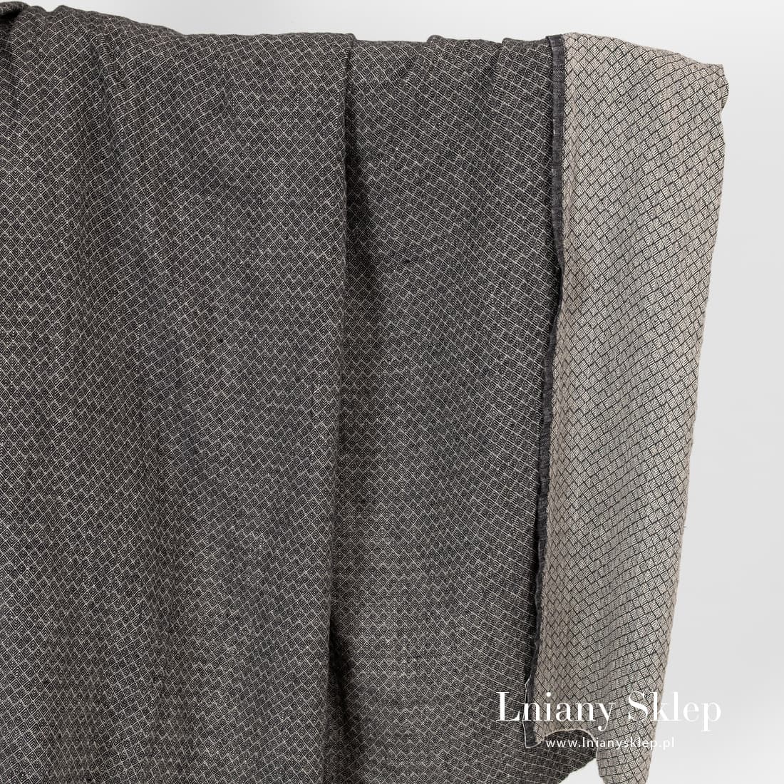 Dwustronny prany len w romby piaskowoszare na czarnym tle i z drugiej strony: czarne na piaskowoszarym tle. Ciężka, mocna, gęsta prana tkanina 100% lniana na szycie odzieży, szalików, chust, narzut na łóżko, poszewek na poduszki dekoracyjne.