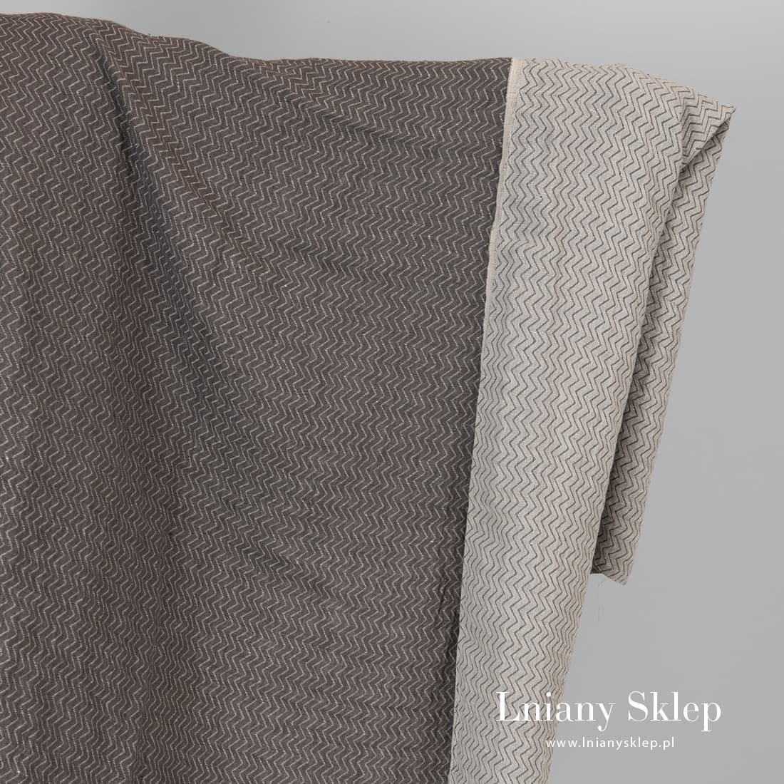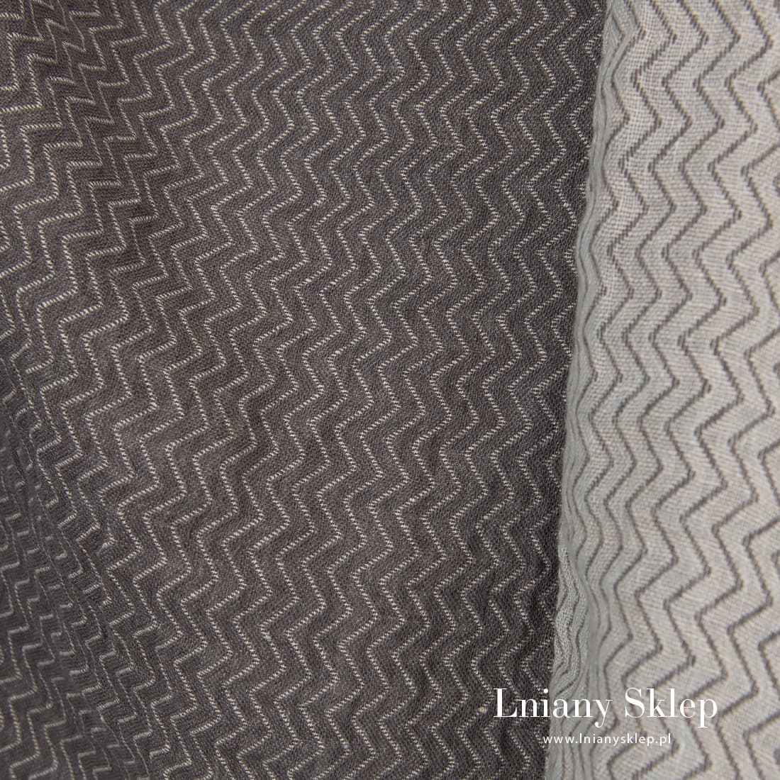 Dwustronny w szare zygzaki prany len jest mocny, gęsty, ciężki. Na jednobarwnym tle dwustronnej, dwuwarstwowej tkaniny wytkane są zygzaki. Jedna strona: na jaśniejszym tle ciemniejszy wzór, na drugiej stronie na ciemniejszym tle jaśniejszy. Po praniu tkanina mięciutka, przytulna i już się nie ściągnie.