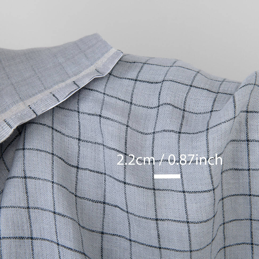 Dwuwarstwowa szara tkanina 100% lniana. Jedna warstwa/strona tkaniny wytkana w pionowe i poziome granatowe paski, które przecinając się tworzą rysunek kratki o wymiarach ok. 2cm x2cm. Druga warstwa/strona tkaniny jest jednobarwna - szara. Dwuwarstwowa tkanina została poddana praniu w procesie produkcji, dlatego jest miękka, przytulna i już nie ulegnie skurczeniu.