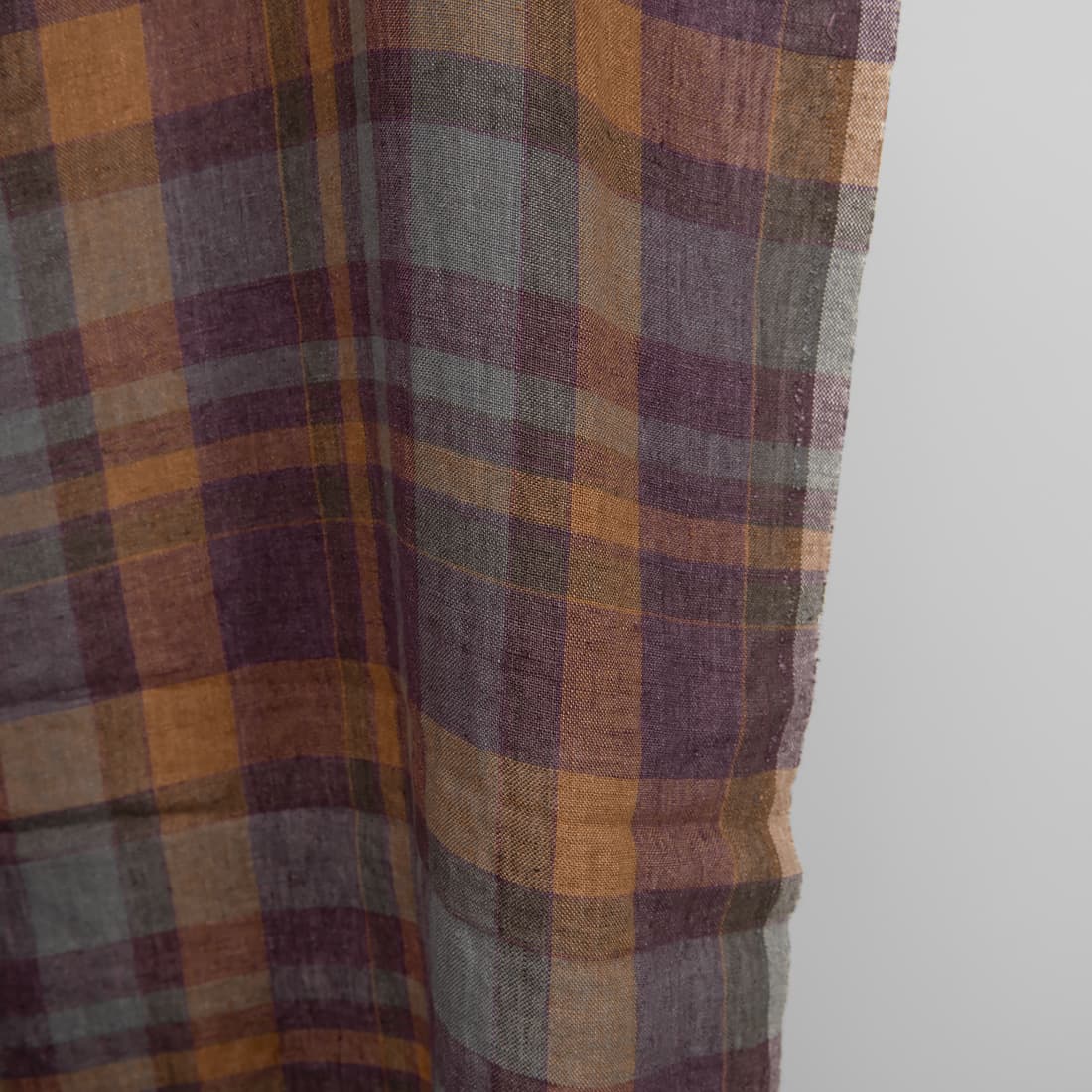 Fioletowa, prana tkanina lniana w kratkę. Do wytkania tej tkaniny użyto przędzy o barwach: fioletowej, brązowo - żółtej, ciemnoszarej i niebieskoszarej. Tkaninę poddano praniu, dlatego otrzymała stałą lekko gniecioną strukturę, a po kolejnych praniach już się nie skurczy.