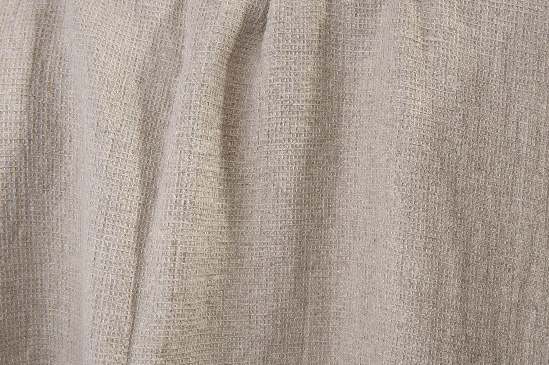 Jasnoszara, 100% lniana tkanina wytkana w małe wypukłe okienka - wzór waflowy. Do wytkania tej tkaniny użyto naturalnej, niebarwionej przędzy lnianej. Tkaninę poddano praniu, dlatego stała się bardziej miękka, puszysta, przyjemna w dotyku. Po kolejnych praniach tkanina się nie skurczy.