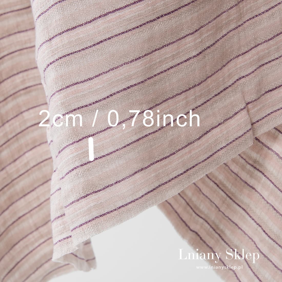 Jasnoszary w paski różowe i fioletowe prany len. Tkanina jest dość ciężka, mocna i gęsta. Poddana praniu tkanina jest mięciutka i już się nie ściągnie.