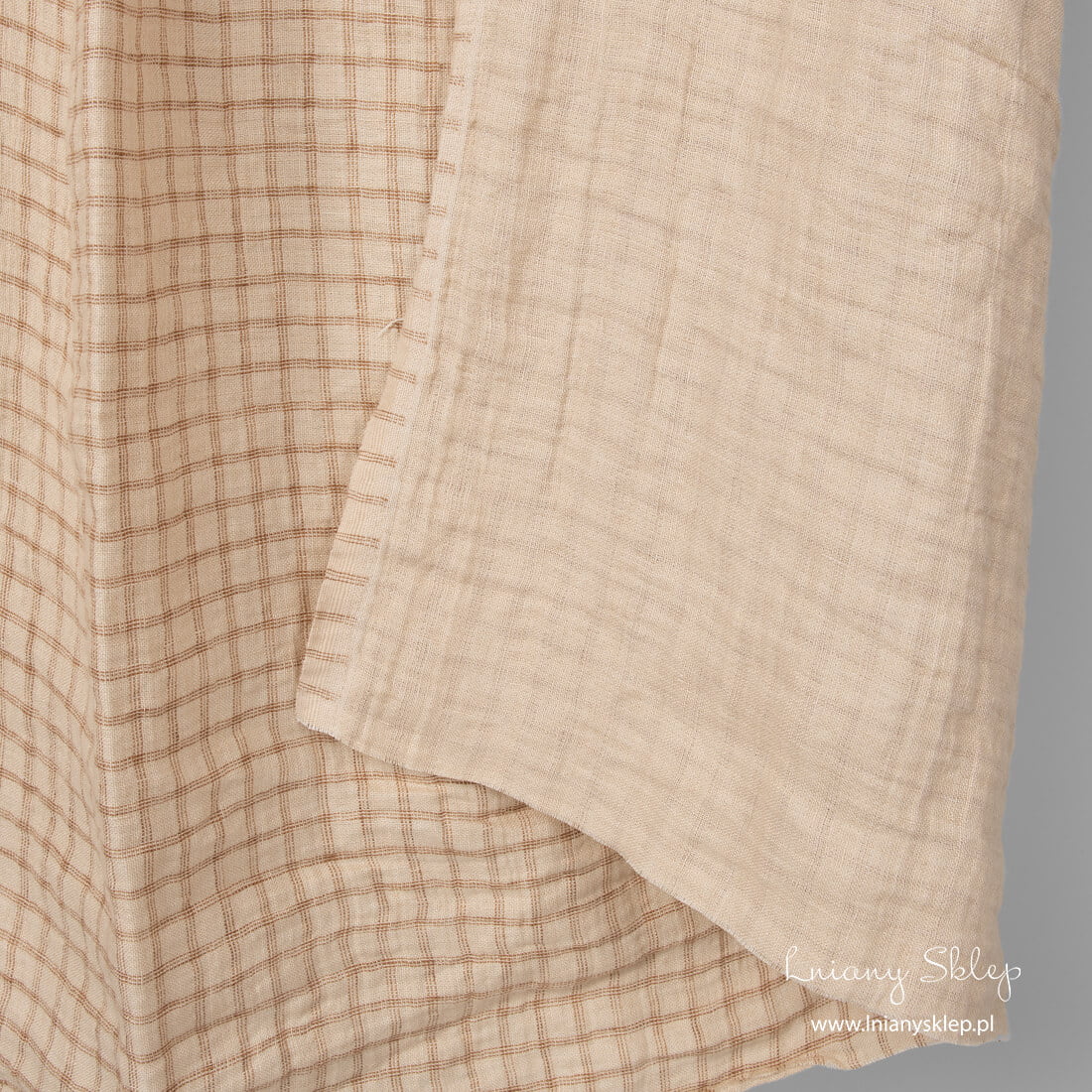 Len dwustronny, prany, piaskowy w krateczkę wytkanej cieniutko z rudej przędzy z jednej strony, druga strona jednobarwna – piaskowa. Gęsta, średnio ciężka dwuwarstwowa tkanina. Po praniu jest miękka i nie skurczy się więcej.