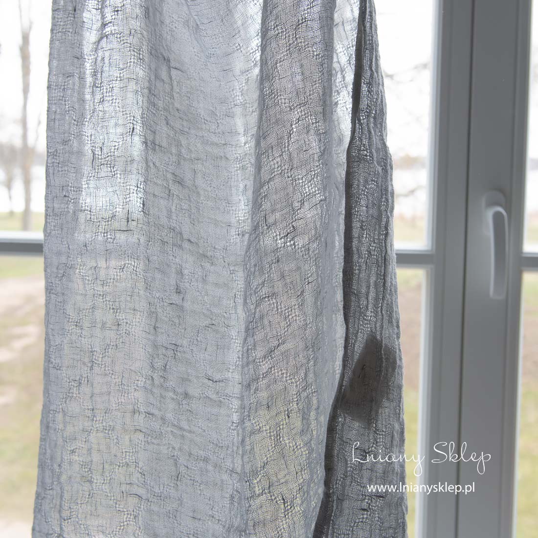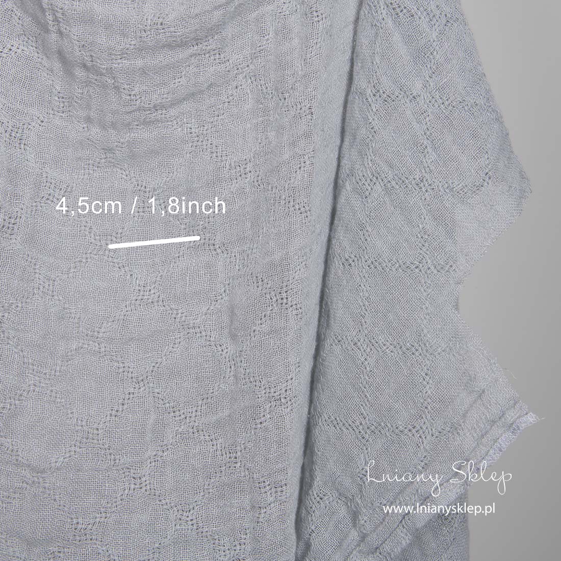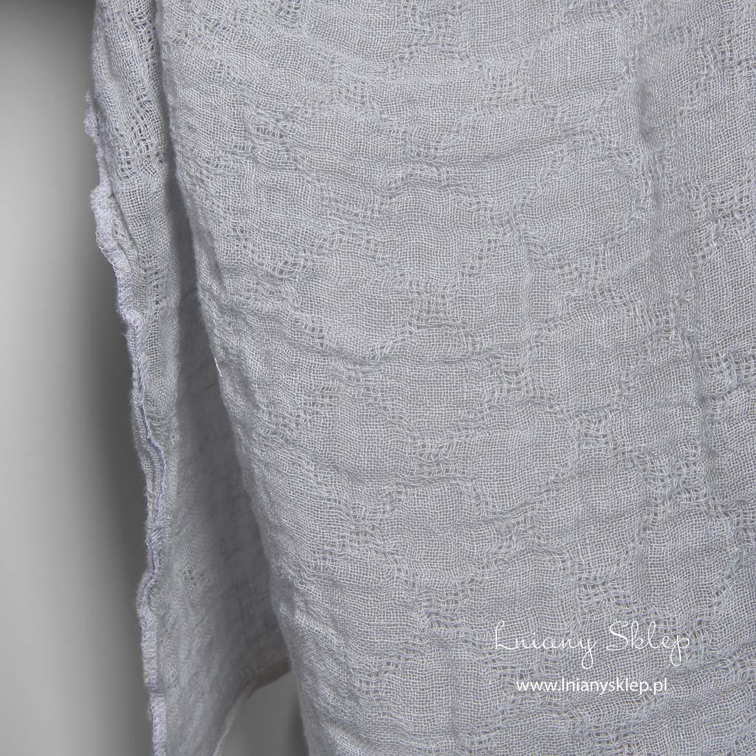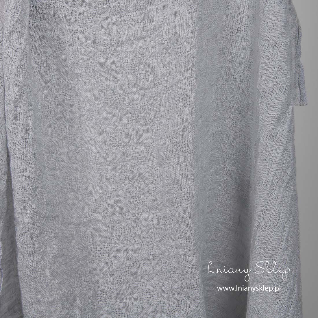 Lniana prana prześwitująca szara w romby tkanina jest wytkana w bardziej rzadkie, prześwitujące romby. Tkanina o niebieskim odcieniu na zasłony, szaliki i inne lekkie produkty.