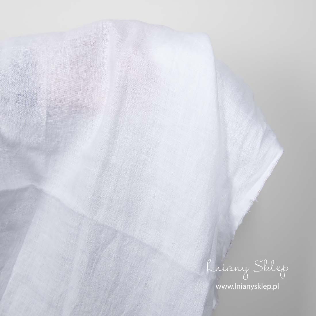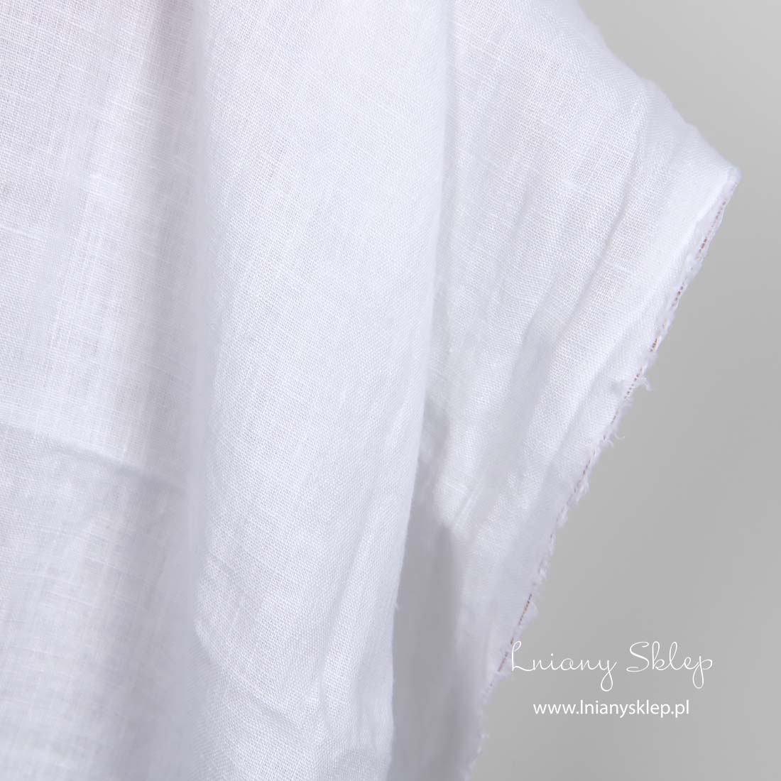 Lniana tkanina prana śnieżnobiała lekka jest miękka i lekko gnieciona po praniu. Po kolejnych praniach się nie ściągnie. Gęsta, lekka, średnio gruba tkanina.