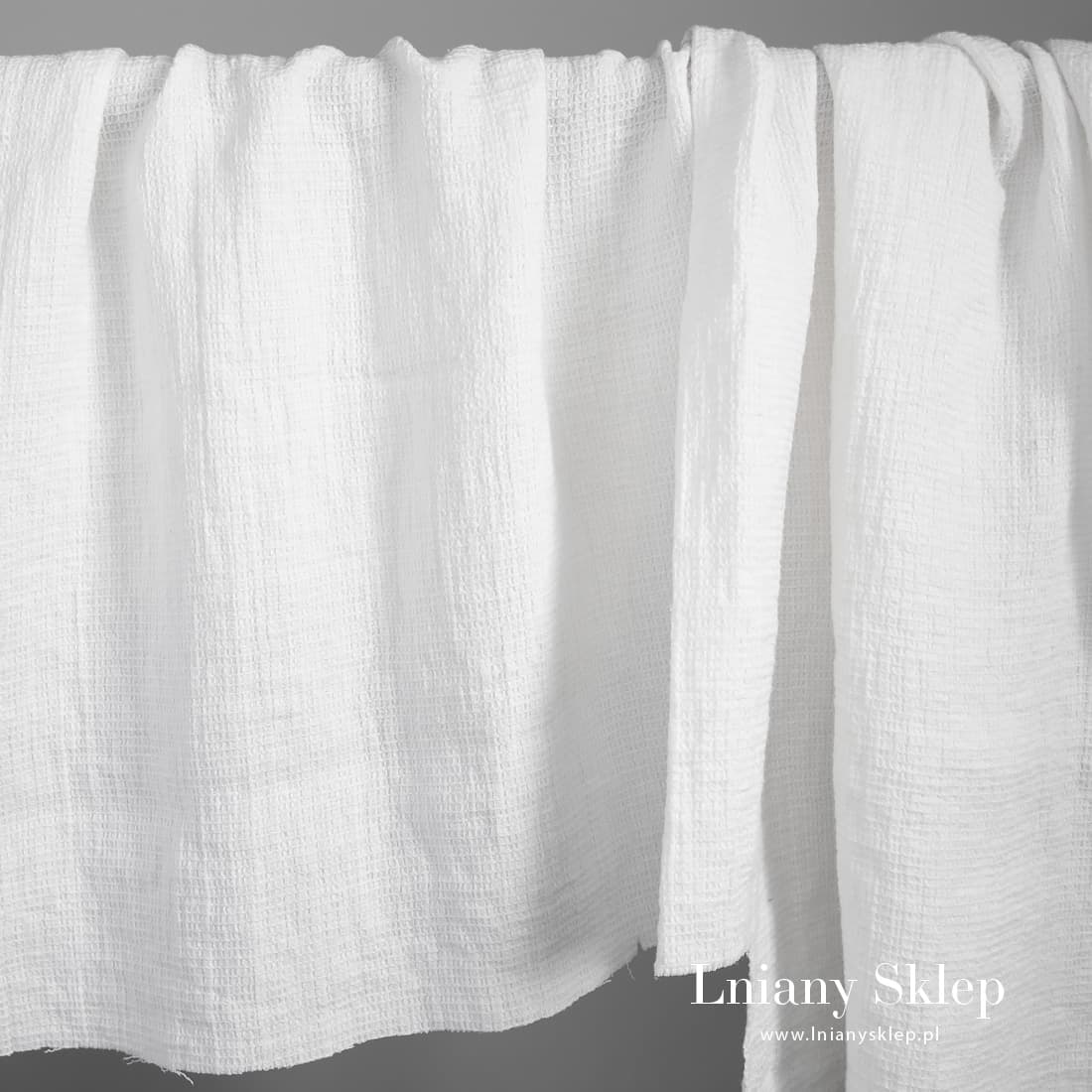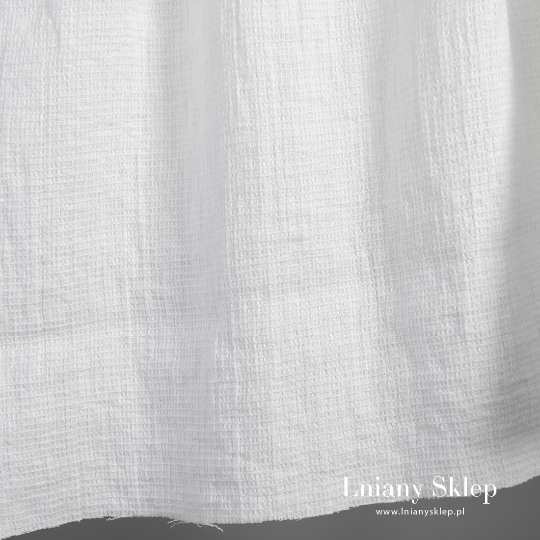 Mlecznobiała (o żółtawym odcieniu. Na życzenie Klienta możemy zaproponować identyczną tkaninę w kolorze śnieżnej bieli), 100% lniana tkanina wytkana w małe wypukłe okienka - wzór waflowy. Tkaninę poddano praniu, dlatego stała się bardziej miękka, puszysta, przyjemna w dotyku. Po kolejnych praniach tkanina się nie skurczy.