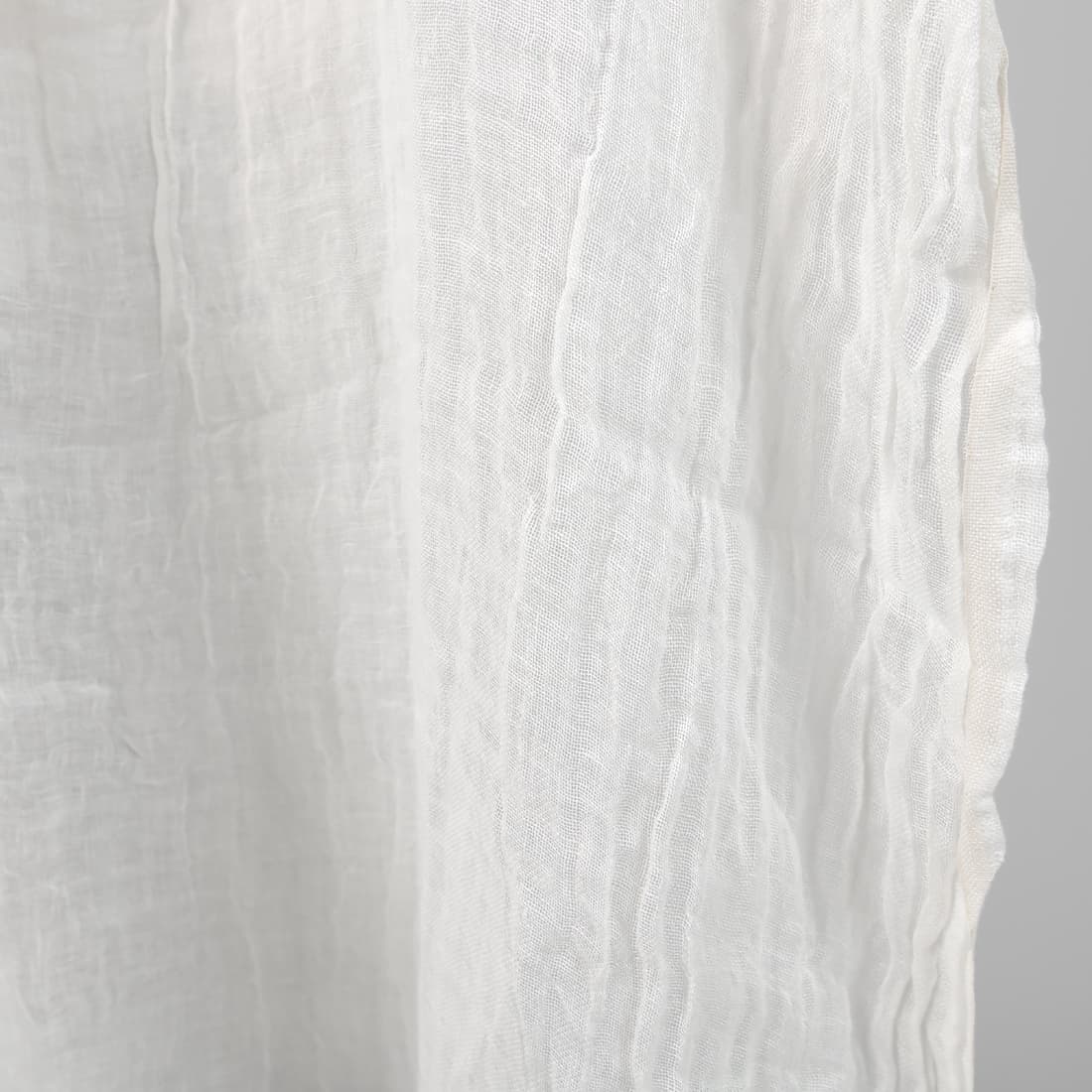 Biała (lekko żółtawa) tkanina lniana. Leciutka, prana, przeźroczysta, rzadko tkana. Tkaninę poddano praniu w procesie produkcji – jest delikatna i miękka, ma lekko gniecioną fakturę. Po praniu nie ściągnie się.