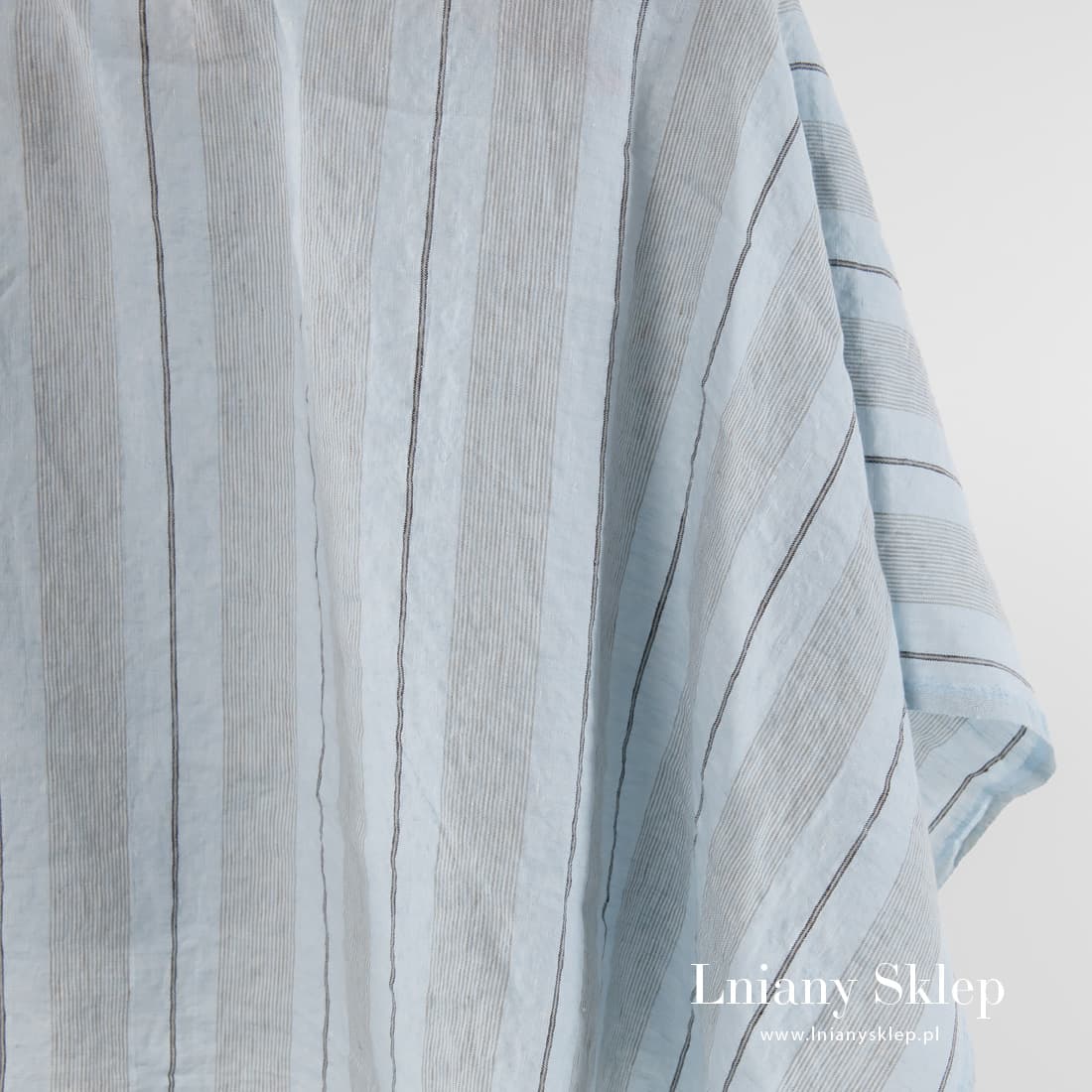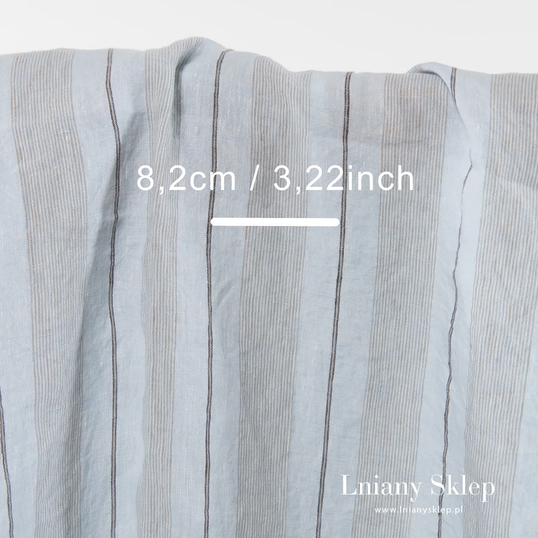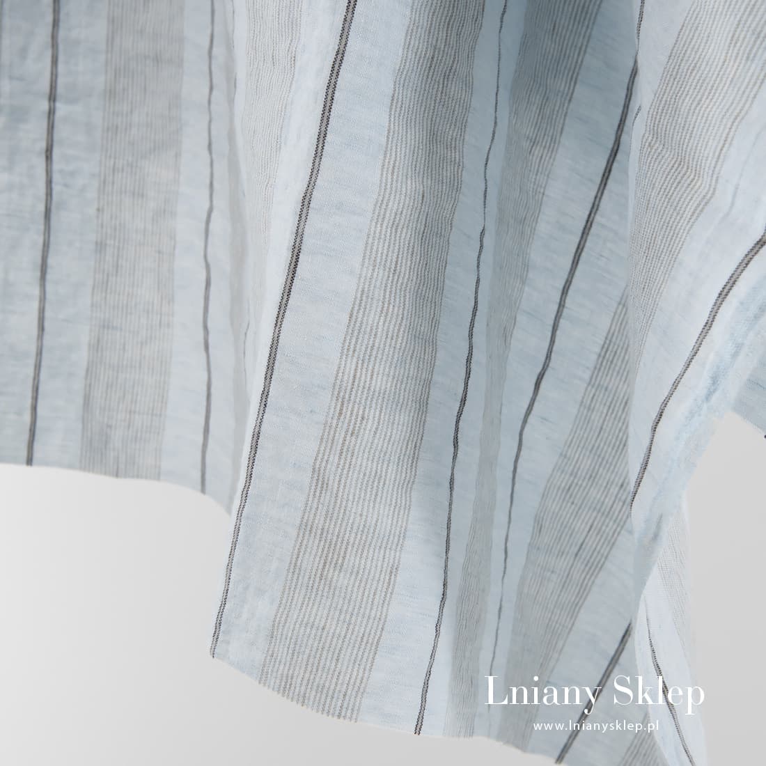 Niebieskawo - piaskowy prany len w pionowe paski. Jest dość lekki, ale gęsty i mocny. Poddana praniu tkanina jest mięciutka i już się nie ściągnie. Na szycie ubrań i tekstyliów domowych.