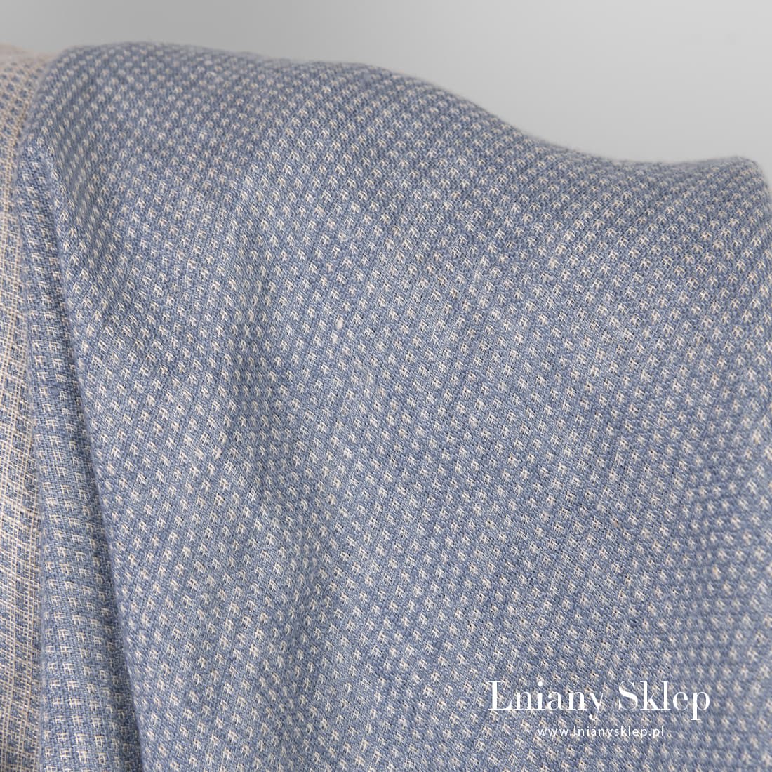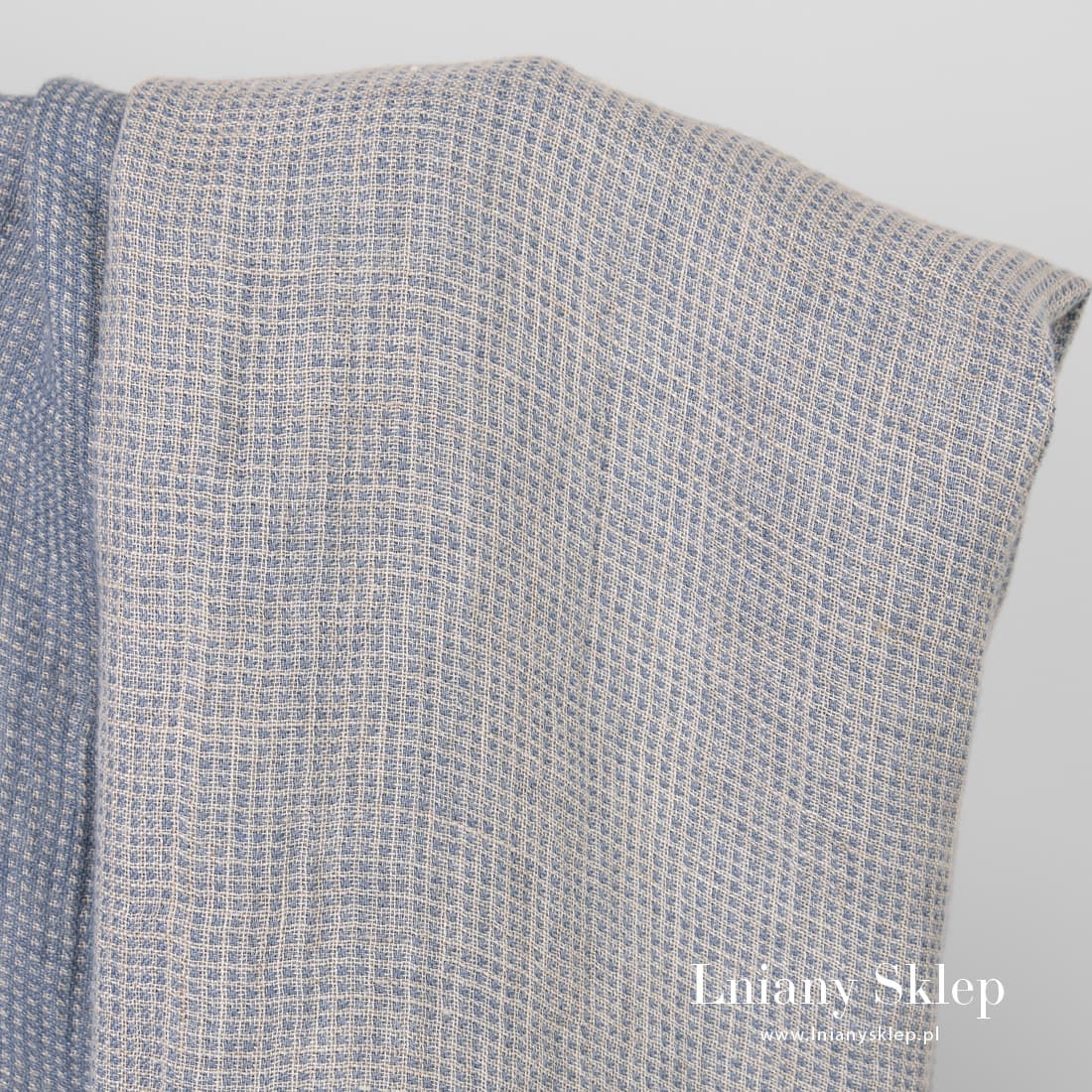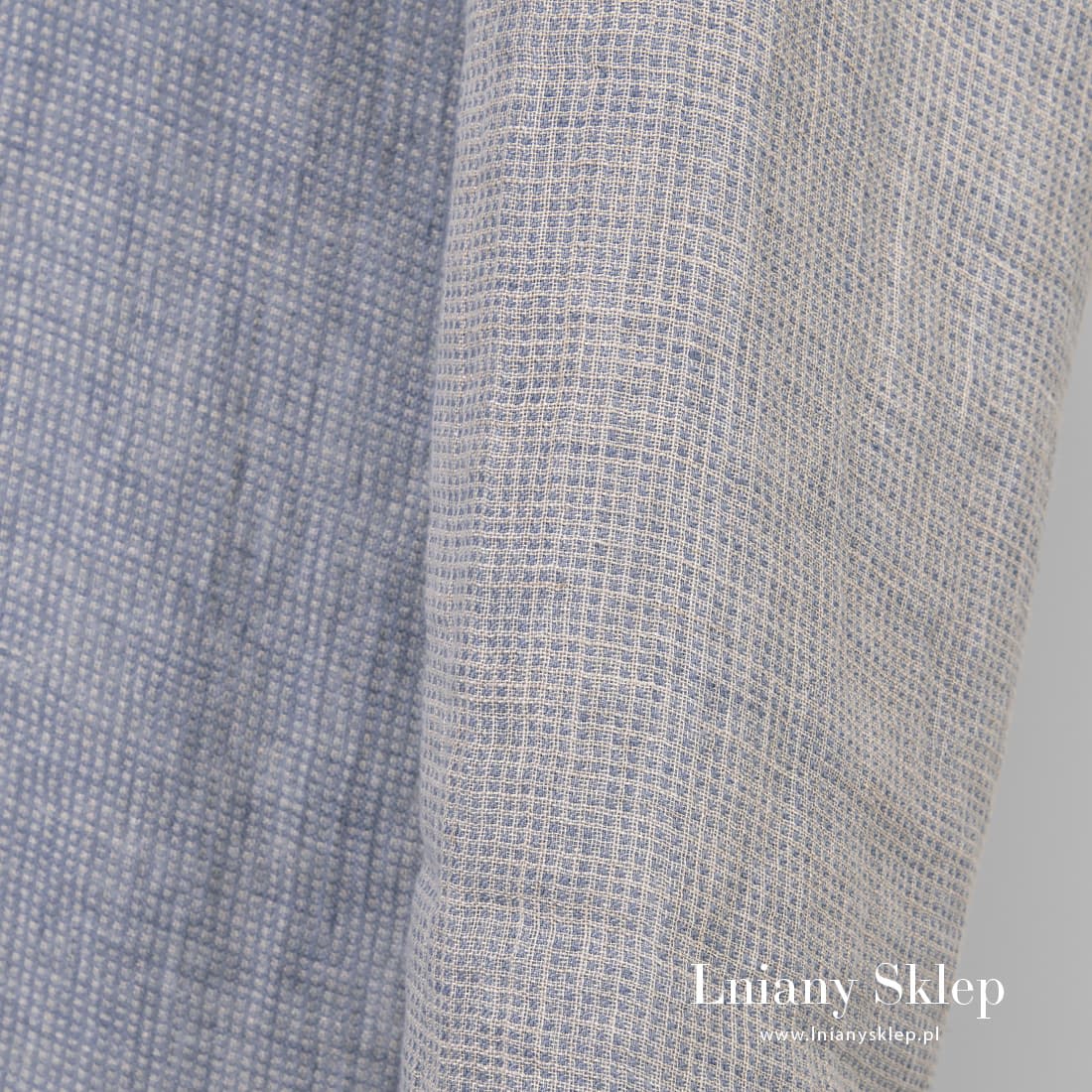- Kolor: wytkany z niebieskiej i niebarwionej (szarej o lekkim piaskowym odcieniu) przędzy