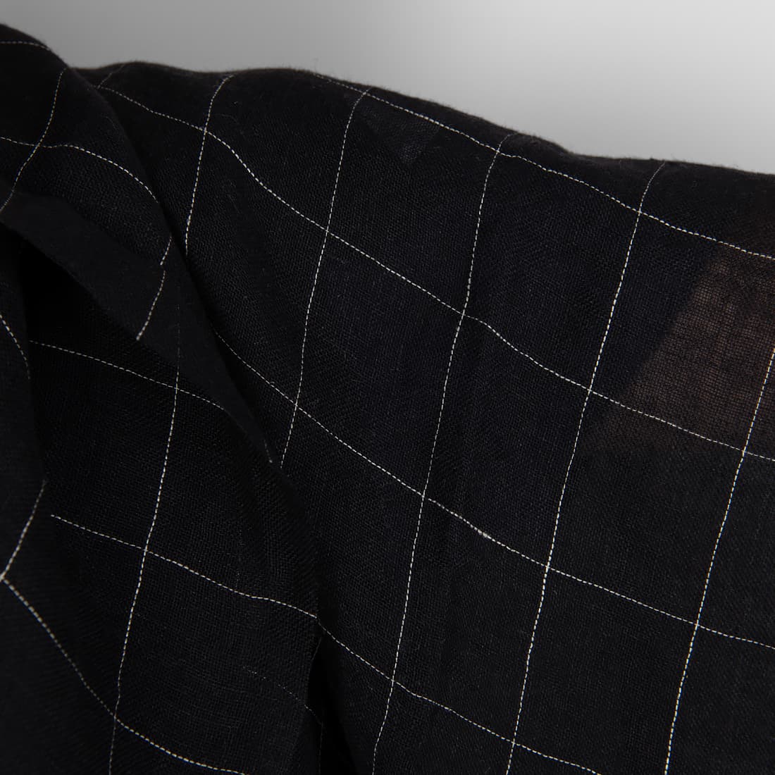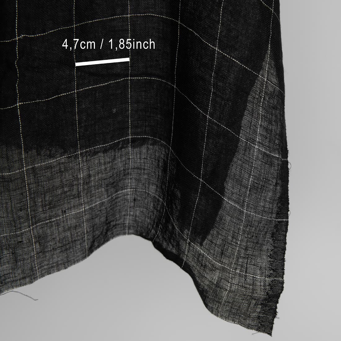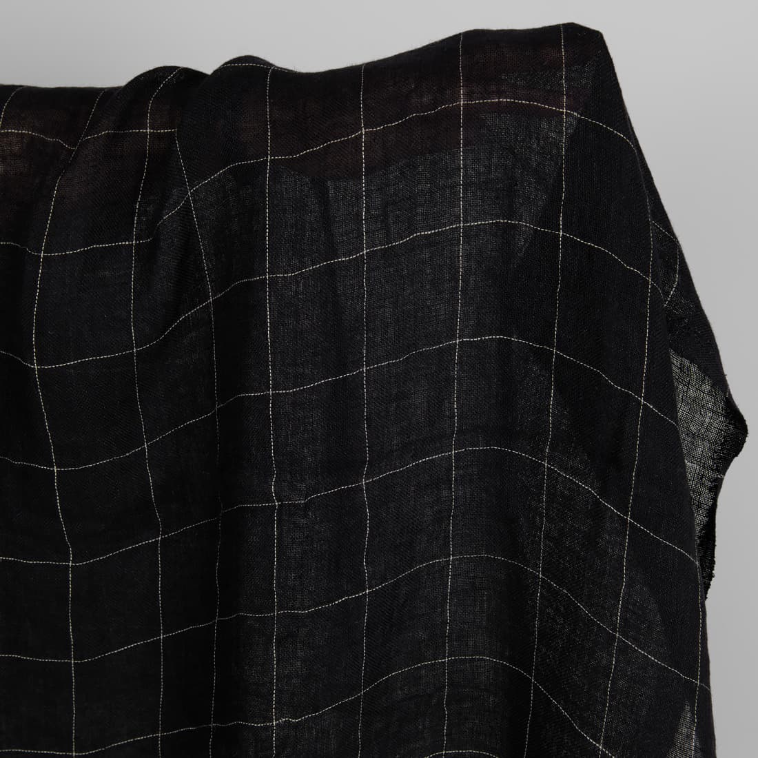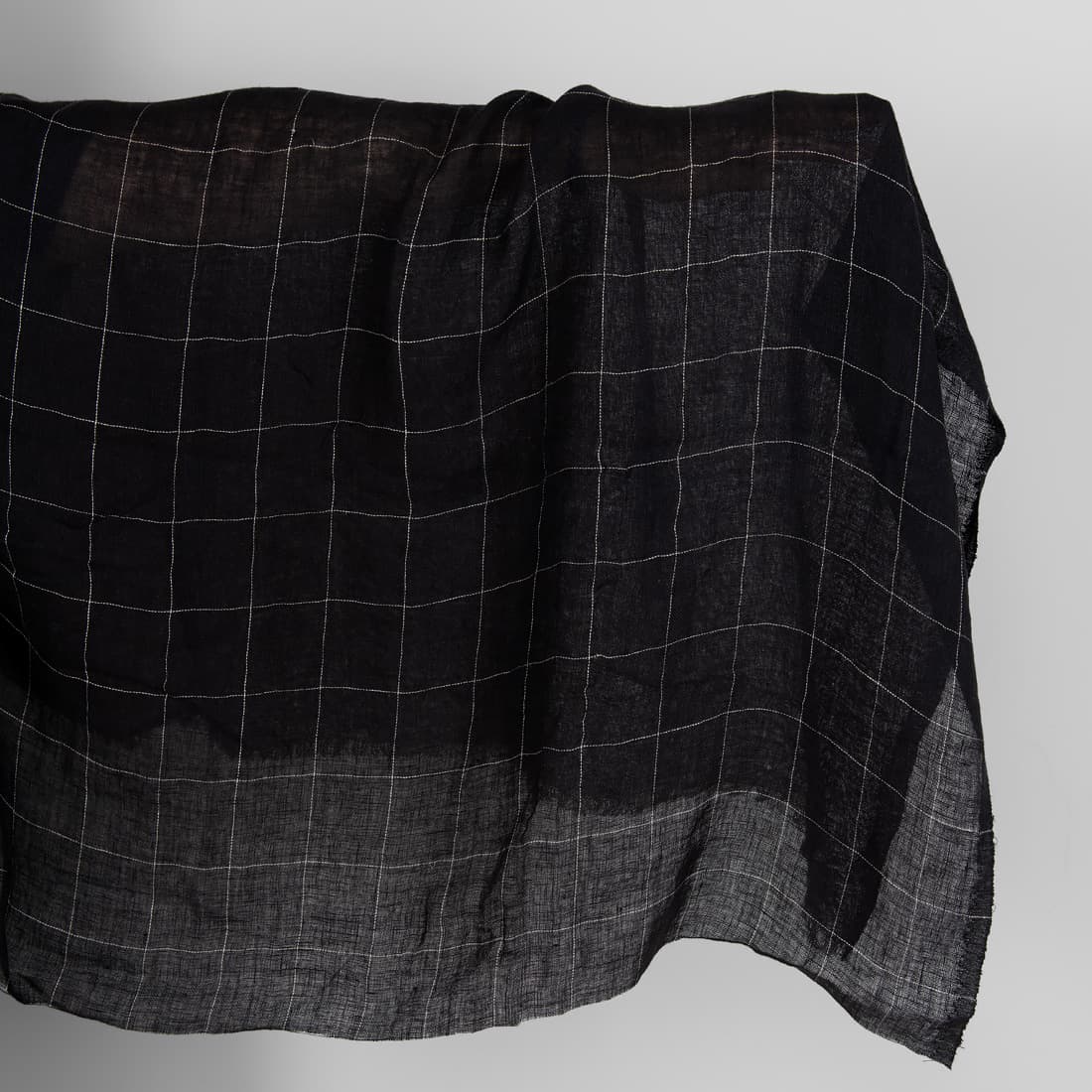 Leciutka prana przeźroczysta (rzadko tkana) czarna tkanina lniana. Wytkana w cieniutkie pionowe i poziome szare paski, które przecinając się układają się w rysunek kratki o wymiarach 5cm x 6cm. Tkaninę poddano praniu w procesie produkcji – jest miękka i nie ściągnie się podczas kolejnych prań. Tkanina na szaliczki i lekkie zasłony.