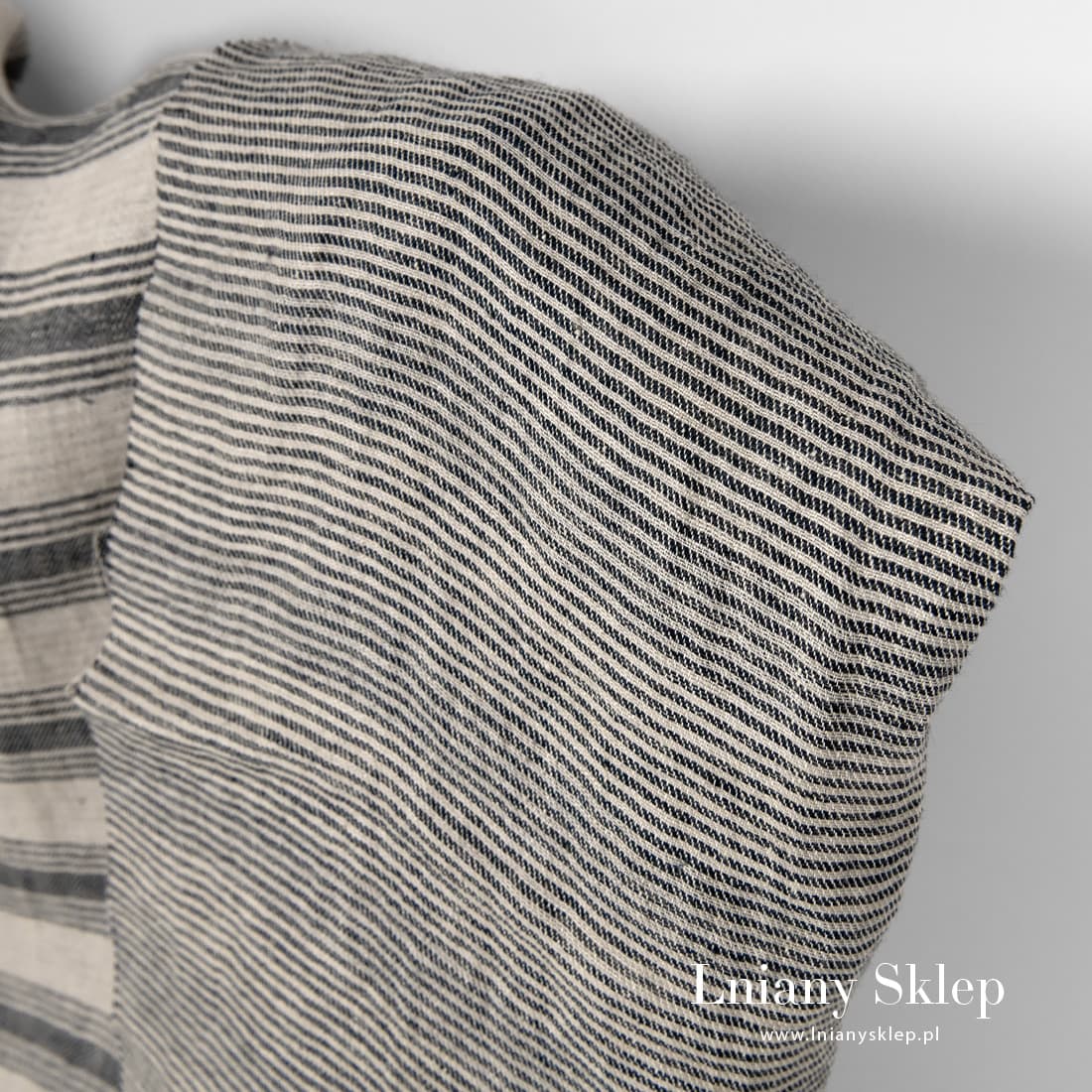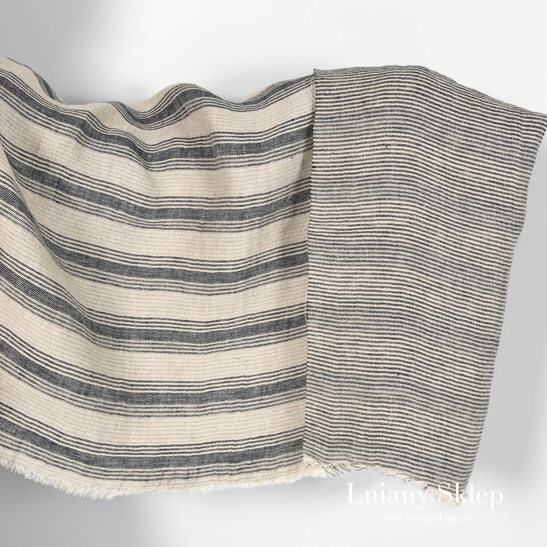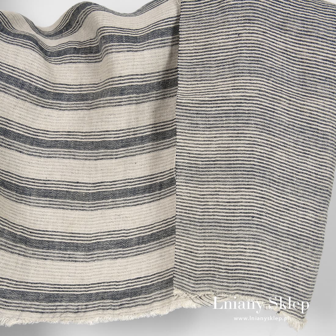 Prana dwustronna granatowo – szara tkanina w pasy. Tkanina wytkana splotem skośnym z przędzy ciemnej granatowej, szarej i mlecznobiałej. Tkanina z przędzy 100% lnianej po praniu mięciutka i przyjemna w dotyku na szycie odzieży, zasłon, obrusów, narzut na łóżko.