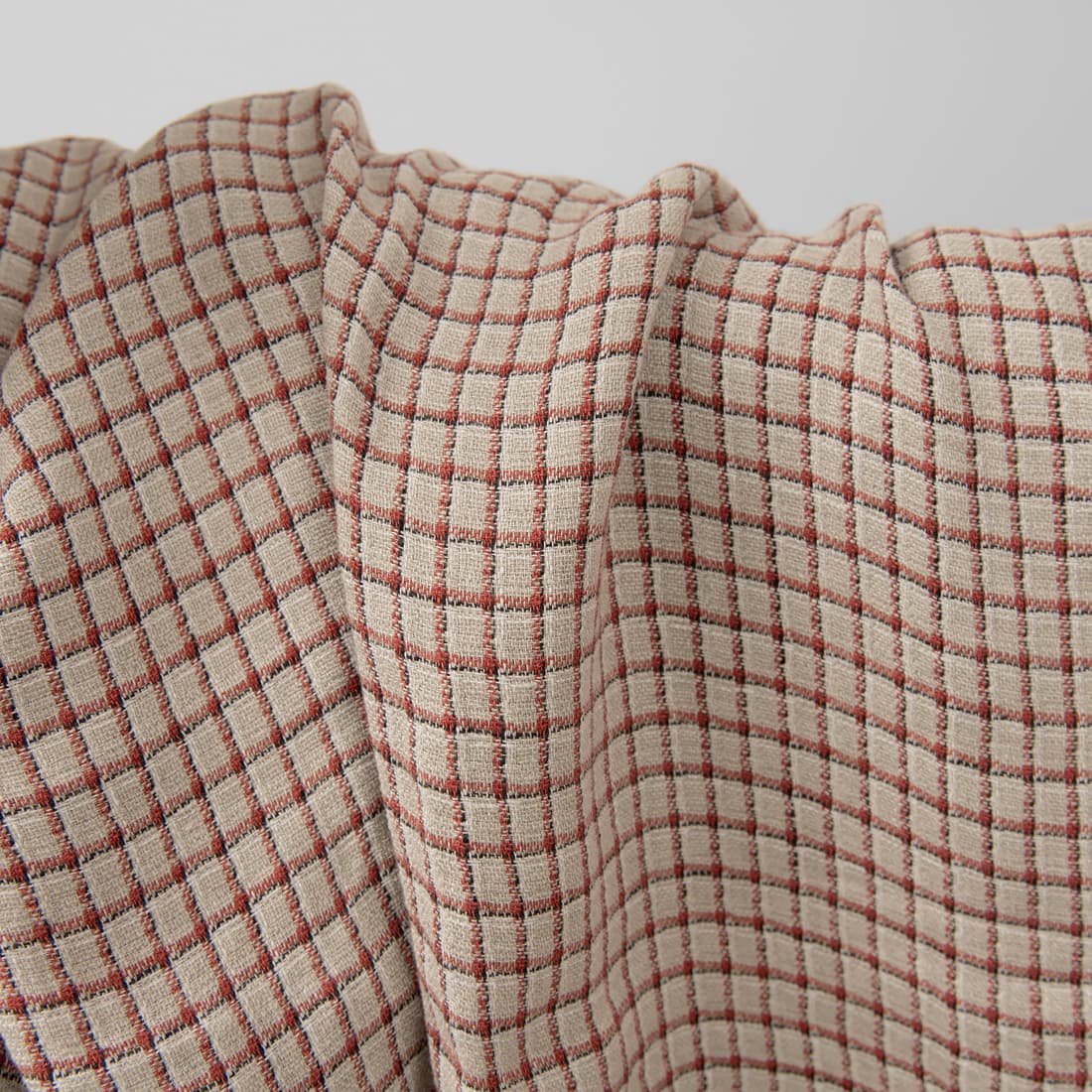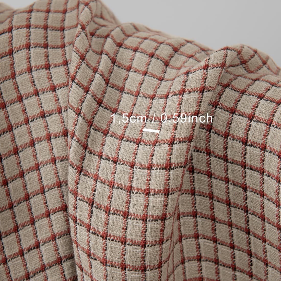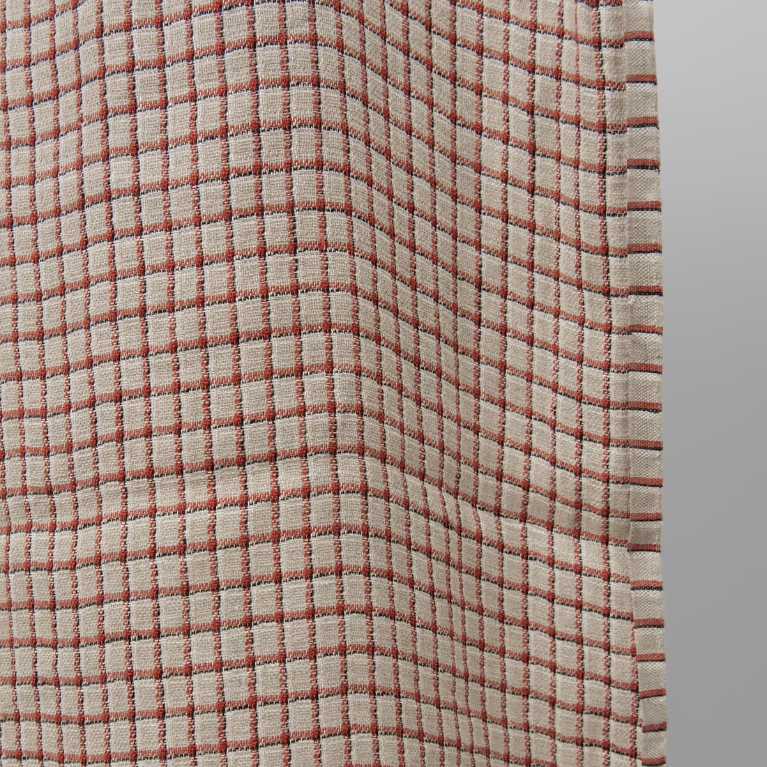 Szara tkanina lniana w czerwono-biało-czarne paski, które przecinając się, układają się w rysunek kratki o wymiarach 1cm x 1,5cm. Mocna, gęsta tkanina. Dzięki specjalnemu praniu jest miękka i nie ściągnie się po praniu.