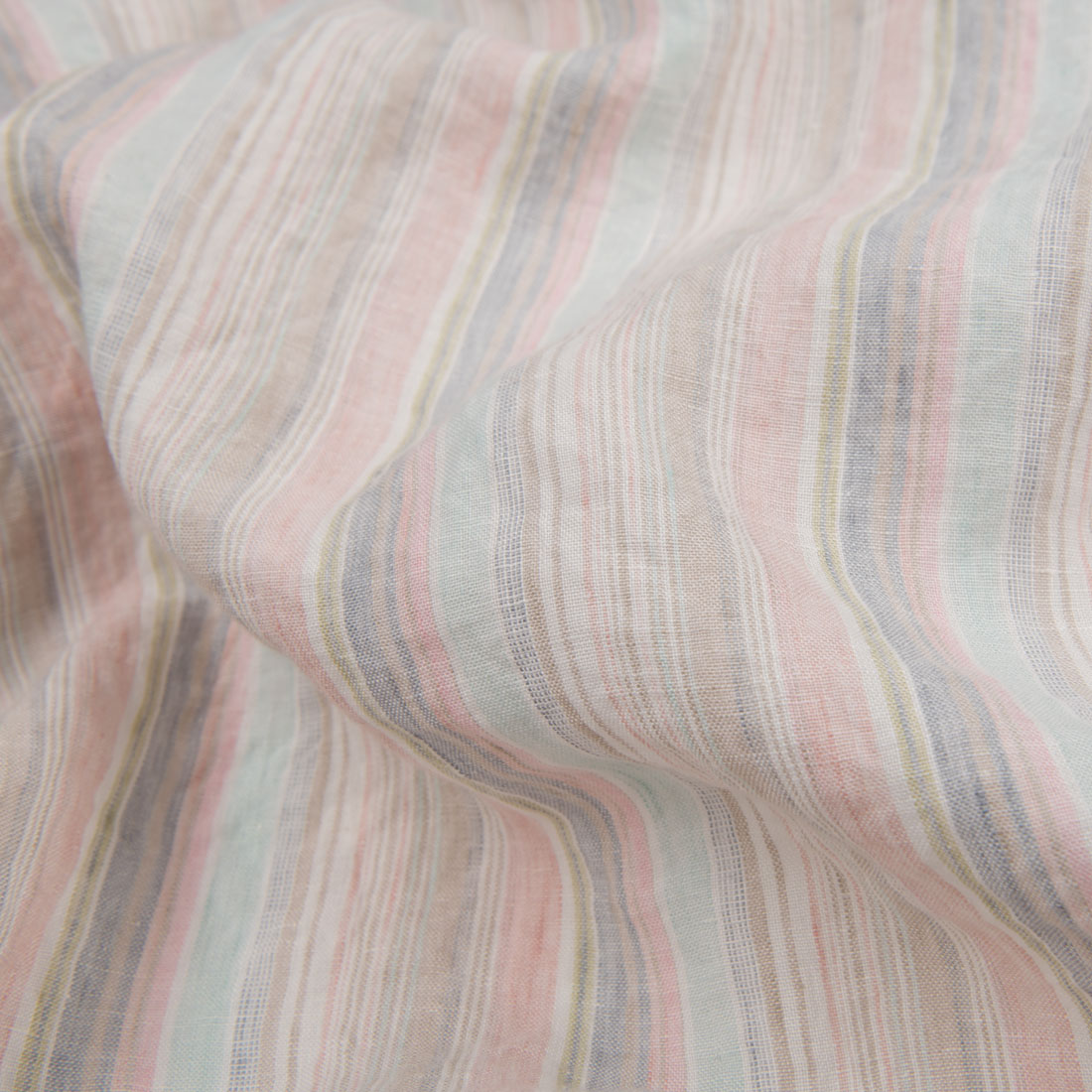 Prana tkanina lniana w pastelowe, wytkane pionowo paski. Użyte kolory: róż, mleczna biel, zielony, niebieskoszary, szarozielony. Mocna, średniociężka tkanina. W procesie produkcji poddana praniu.